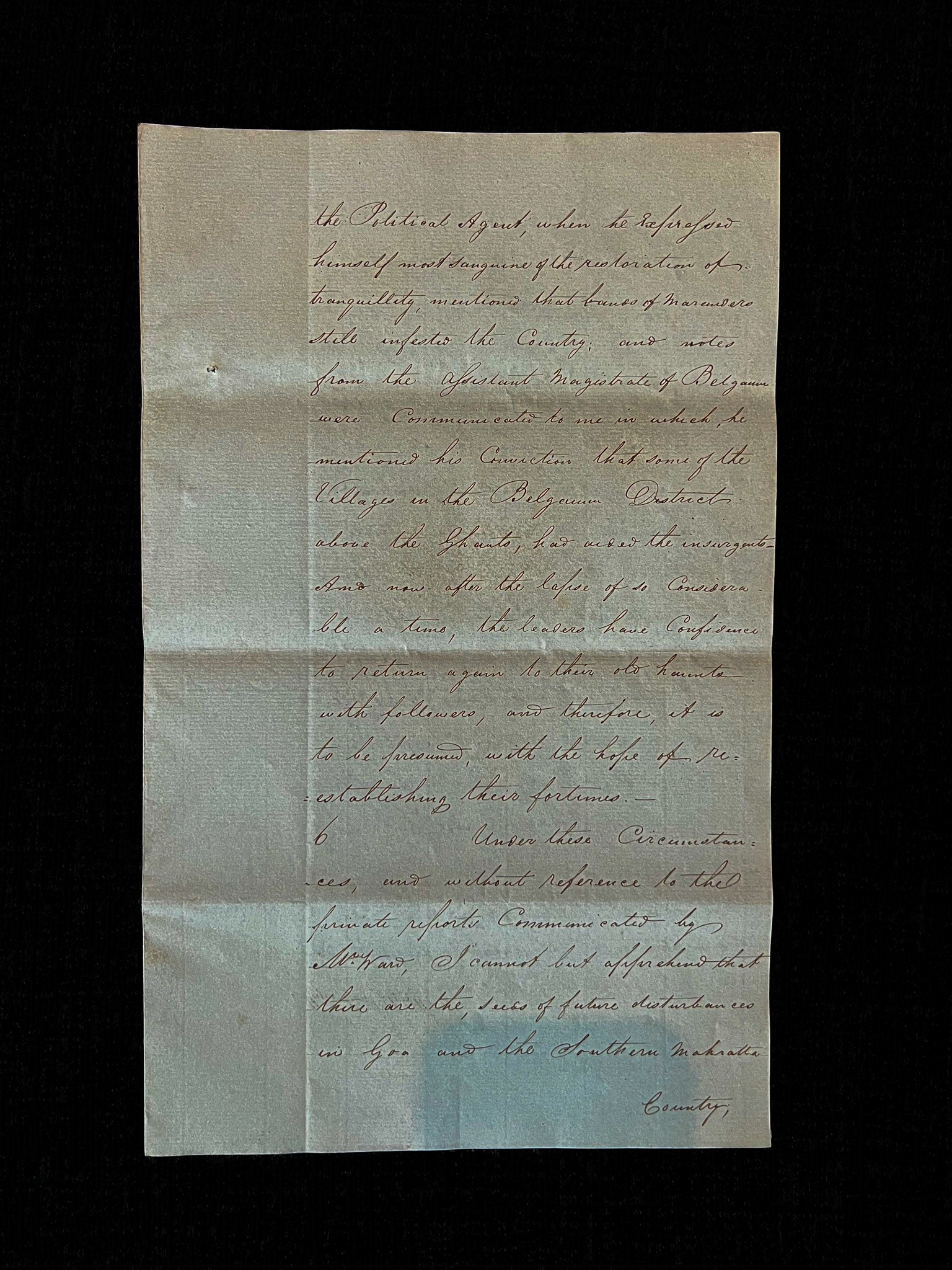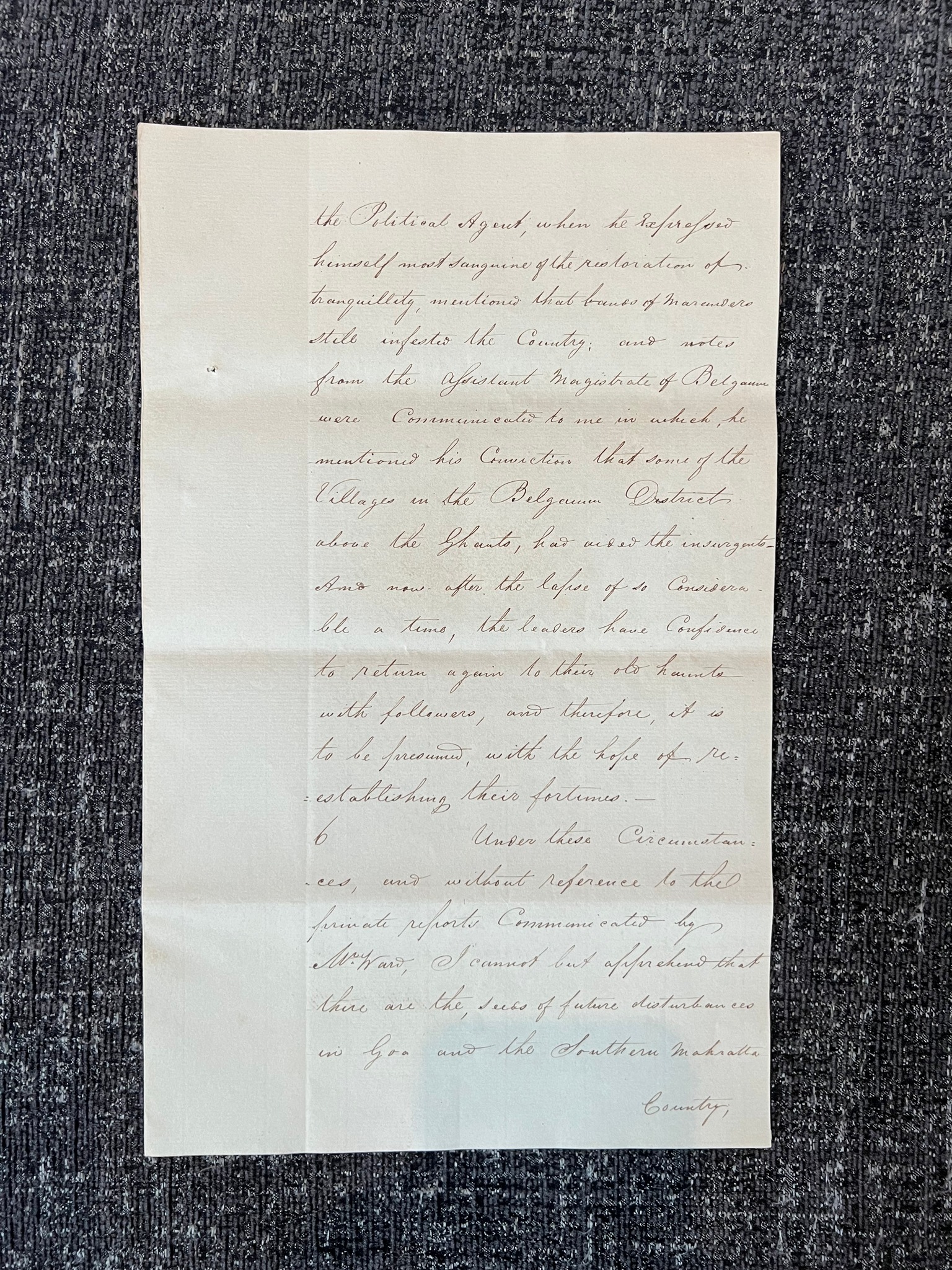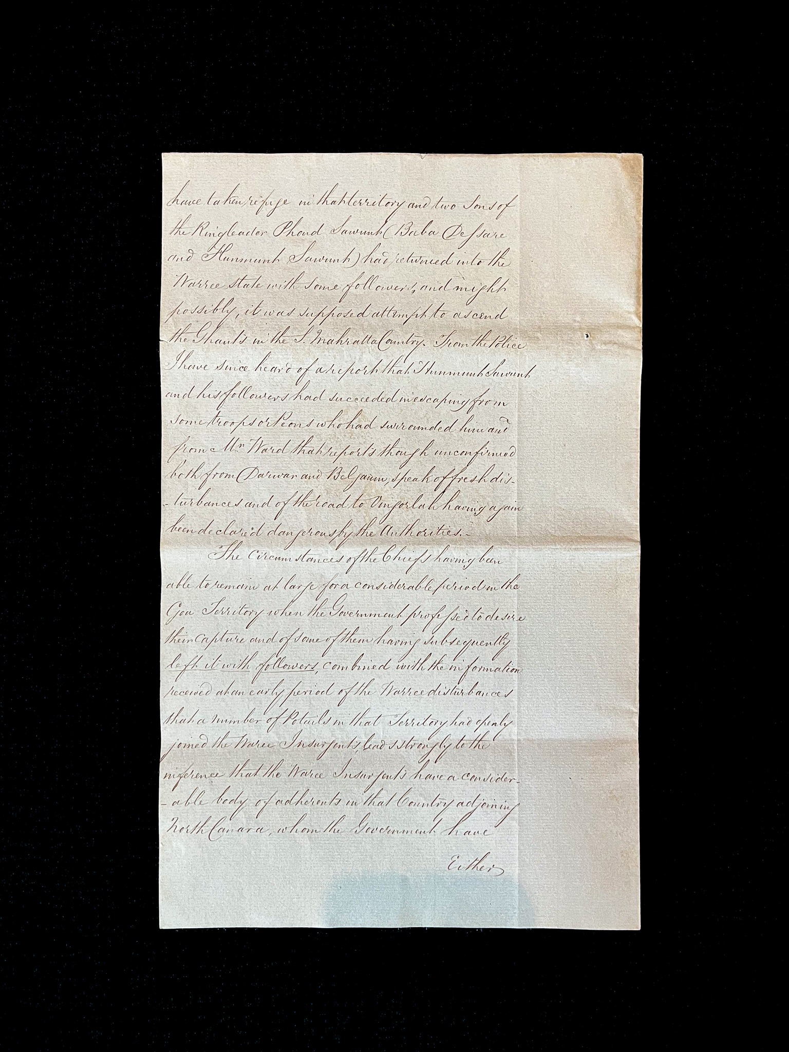 A 3-page signed document dated 5'' April 1845 from Lt.-Colonel [William] Strahan, Quarter Master-General of the Army, to Lovell accompanied by 19-pages of extracts from the Minutes of the Secret Department and orders of the Military Department. Strahan requests that Lovell submit a report to the Commander-in-Chief on "the necessity of otherwise for the 35th Regiment N.I remaining at Sircey. as His Lordship... can alone look to you to guide his opinionon the subject in question.. The annexures contain the detailed opinions of John Fryer Thomas, Chief Secretary of the Civil Department, Fort St. George and the aforementioned R.D. Parker, as to the importance of retaining a greater presence on the region. These include statements of troop numbers and information derived from the "latest intelligence' which seems to indicate that the Portuguese authorities in Goa have been "unable if willing to capture the Chiefs who have taken refuge in that territory. "ARCHIVE OF DOCUMENTS FROM THE PAPERS OF LT.-COL. SIR LOVELL BENJAMIN BADCOCK LOVELL, REPORTING ON THE PROGRESS OF THE SOUTH MAHRATTA INCIDENT. (London]: This collection of documents shed light on some intriguing aspects of the minutiae of the expedition, and come from the papers of Lt.-Col. Sir Lovell Benjamin Badcock Lovell, commander of The 15th King's Hussars at the time of the disturbances at South Mahratta, India."