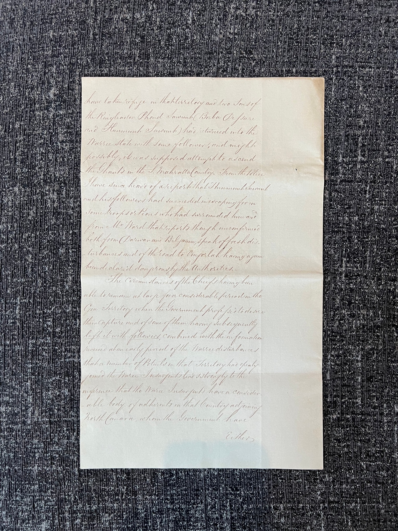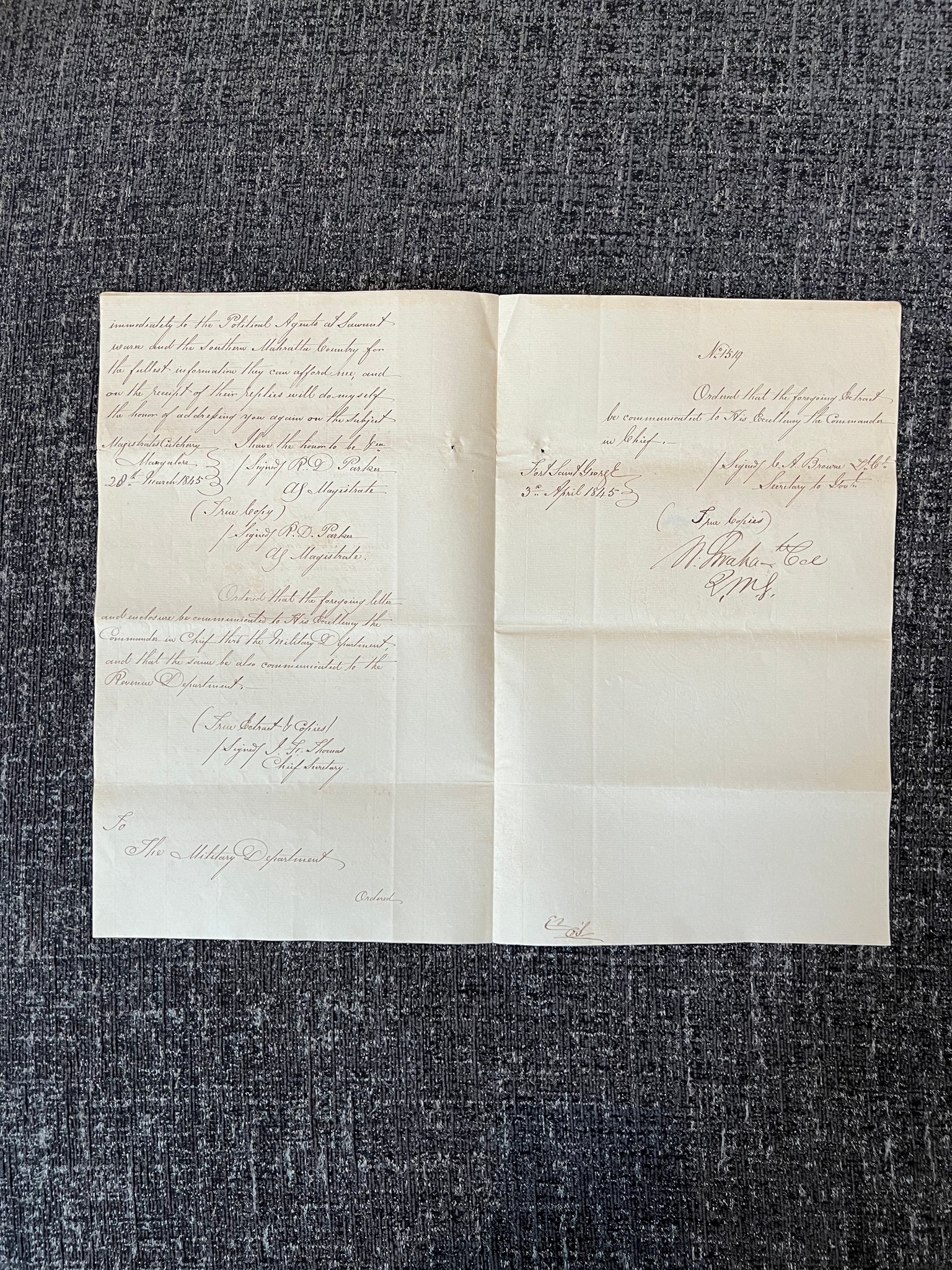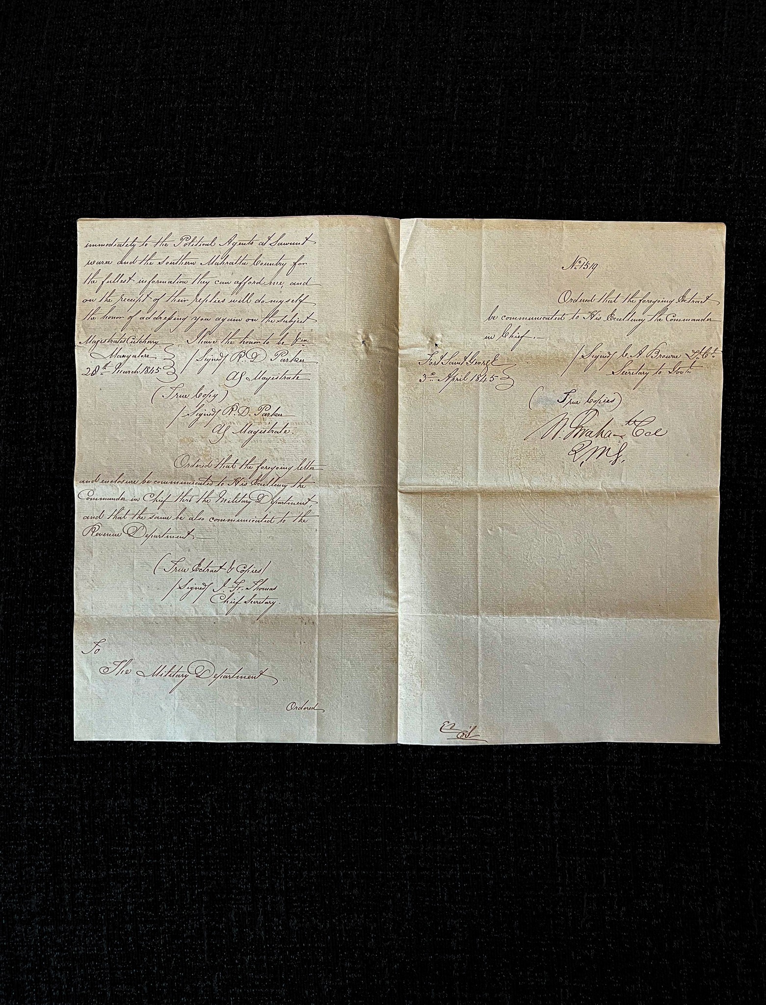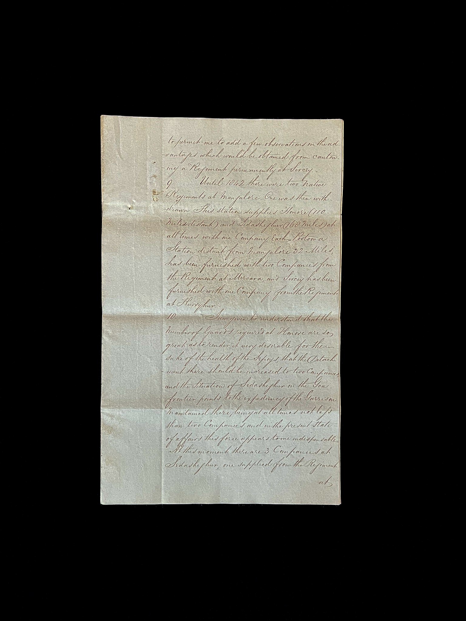 A 3-page signed document dated 5'' April 1845 from Lt.-Colonel [William] Strahan, Quarter Master-General of the Army, to Lovell accompanied by 19-pages of extracts from the Minutes of the Secret Department and orders of the Military Department. Strahan requests that Lovell submit a report to the Commander-in-Chief on "the necessity of otherwise for the 35th Regiment N.I remaining at Sircey. as His Lordship... can alone look to you to guide his opinionon the subject in question.. The annexures contain the detailed opinions of John Fryer Thomas, Chief Secretary of the Civil Department, Fort St. George and the aforementioned R.D. Parker, as to the importance of retaining a greater presence on the region. These include statements of troop numbers and information derived from the "latest intelligence' which seems to indicate that the Portuguese authorities in Goa have been "unable if willing to capture the Chiefs who have taken refuge in that territory. "ARCHIVE OF DOCUMENTS FROM THE PAPERS OF LT.-COL. SIR LOVELL BENJAMIN BADCOCK LOVELL, REPORTING ON THE PROGRESS OF THE SOUTH MAHRATTA INCIDENT. (London]: This collection of documents shed light on some intriguing aspects of the minutiae of the expedition, and come from the papers of Lt.-Col. Sir Lovell Benjamin Badcock Lovell, commander of The 15th King's Hussars at the time of the disturbances at South Mahratta, India."