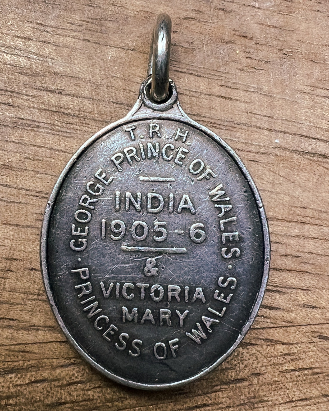 Small silver medal awarded to ships’ crews This small oval medal, measuring 25 x 20mm, was given to members of the crews of the vessels taking the Royal party to and from India. The obverse shows the Prince of Wales’s crest within the Garter and and the chain and badge of the Most Exalted Order of the Star of India [as worn by Knights Grand Commander] flanked by the initials G and M for George and Mary. The reverse bears the words INDIA 1905-6 and the names of the Princess & Princess.