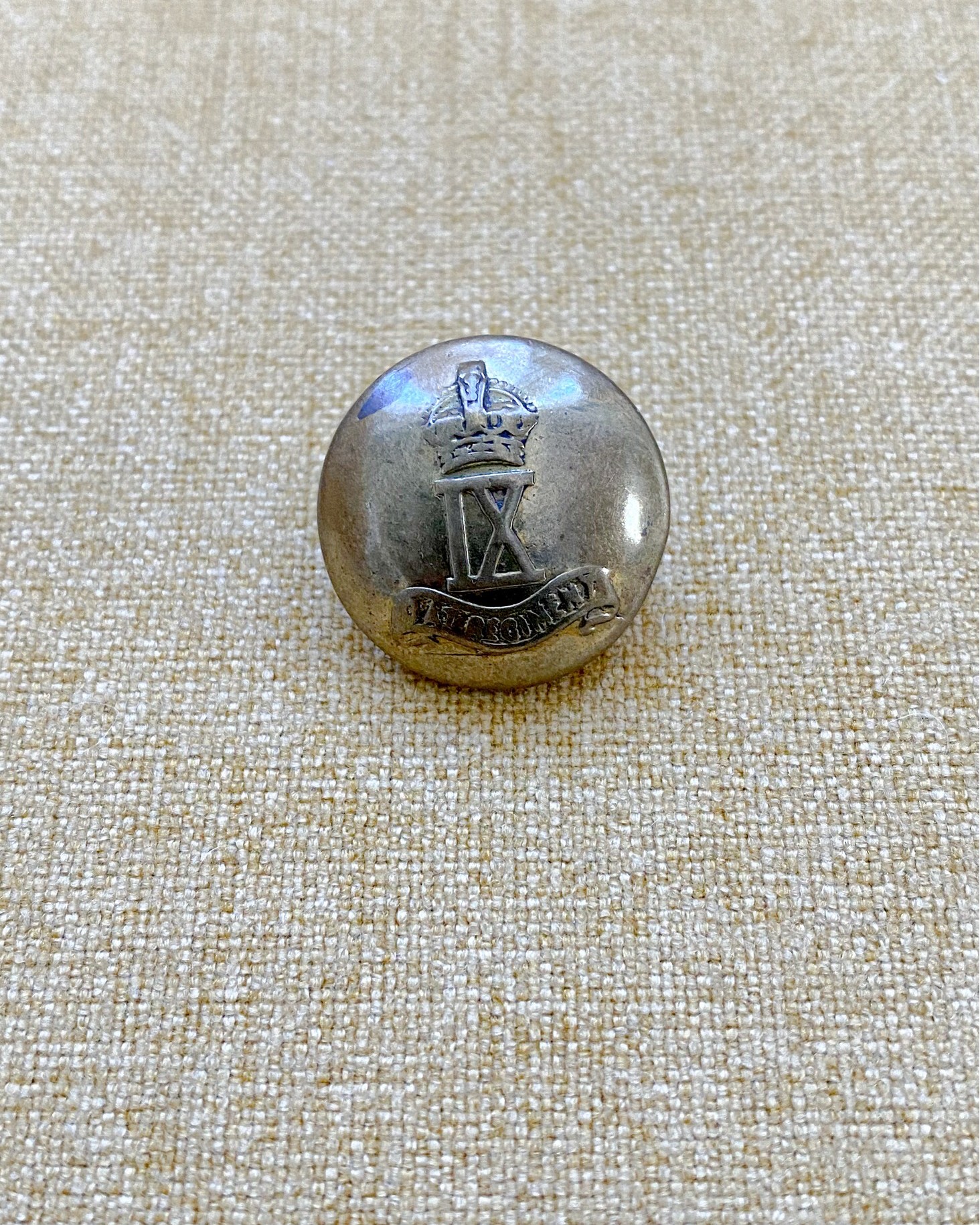 The large 25mm brass button has the roman numeral IX beneath a king’s crown with a scroll reading JAT REGIMENT below. The button has a spun back but there is no backmark. There is wear from polishing on the lettering of the scroll.