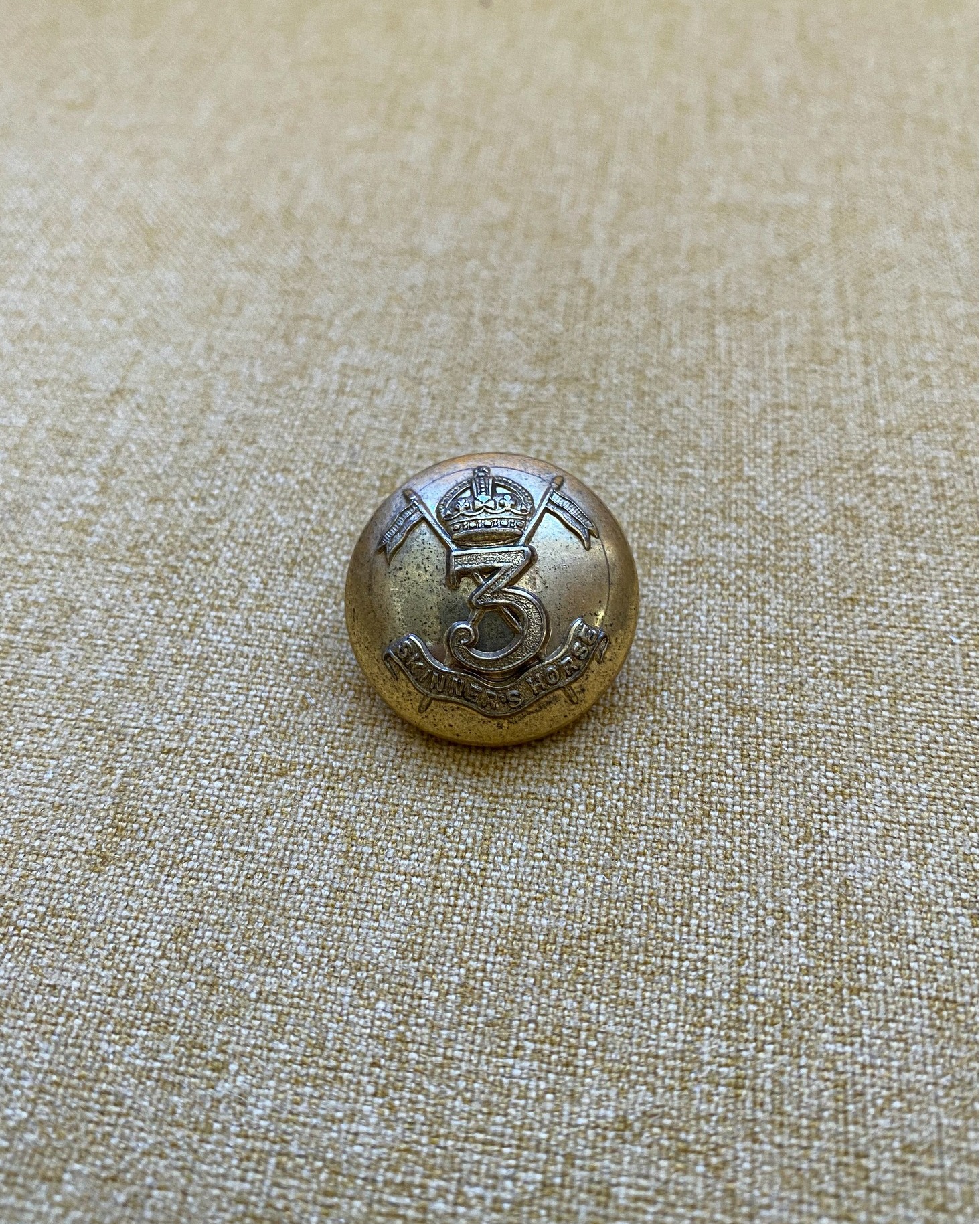 14mm button is the pattern used between 1901 and 1921 by the 3rd Bengal Cavalry and shows the regimental number on crossed lances with the title SKINNER’S HORSE on a scroll, all beneath a king’s crown. One of the most famous of Indian cavalry regiments, named after its Anglo-Indian founder James Skinner, the 3rd wore a most distinctive uniform of bright yellow earning it the nickname of the Yellow Boys.