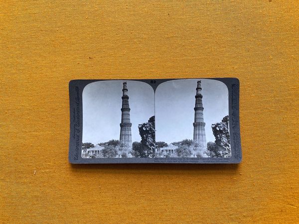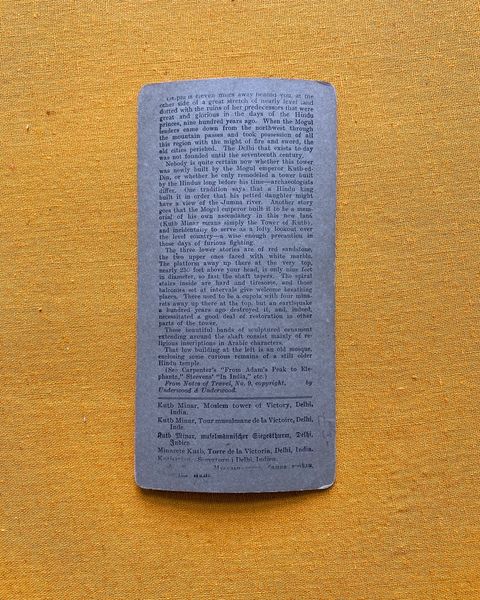 A good stereoscopic card by Underwood and Underwood, New York, London, &c. with an attractive view of the massive 73 metre high Qutub Minar 13th century tower in Delhi. The verso of the card has a useful description of the monument which has variously been written in English as Kutub, Qutub, Q’tub.