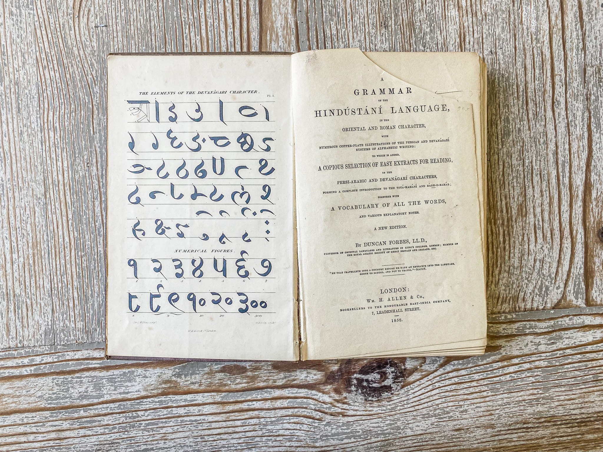 Publication date 1858 A grammar of the Hindustani language, in the Oriental and Roman character, with numerous copper-plate illustrations of the Persian and Devanagari systems of alphabetic writing. To which is added, a copious selection of easy extracts for reading, in the Persi-Arabic & Devanagari characters, forming a complete introduction to the Bagh-o-bahar; together with a vocabulary, and explanatory notes by Forbes, Duncan, 1798-1868