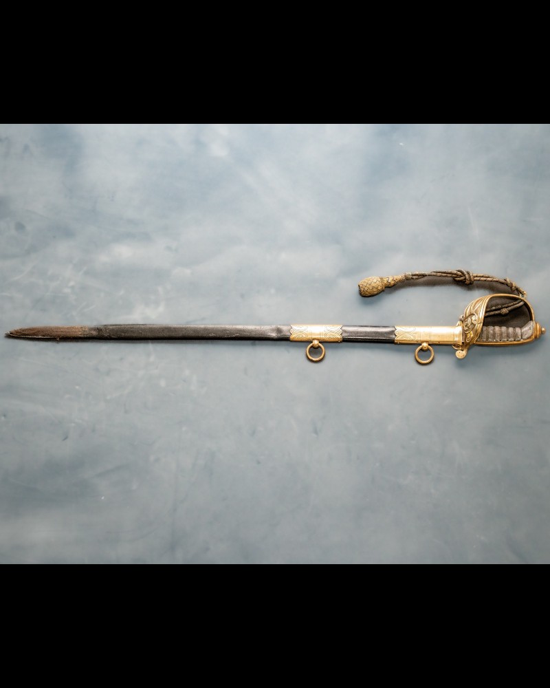 Indian Police Force officer's officer sword in the original two ringed steel scabbard. These swords are quite uncommon and were carried by British police officers whilst serving in India. They are identical to Rifle Officer 1827 patterns, except that in place of the usual royal cypher, there is inserted the intertwined letters, “IP”(Indian Police). The hilt is nickel-plated steel with fishskin and tight silver twistwire to the grip. The blade is maker proof marked and I would date this to the first quarter of the 20th Century. The blade is etched with the royal crown and interlaced "IP" monogram replaces the Royal Cypher initials.