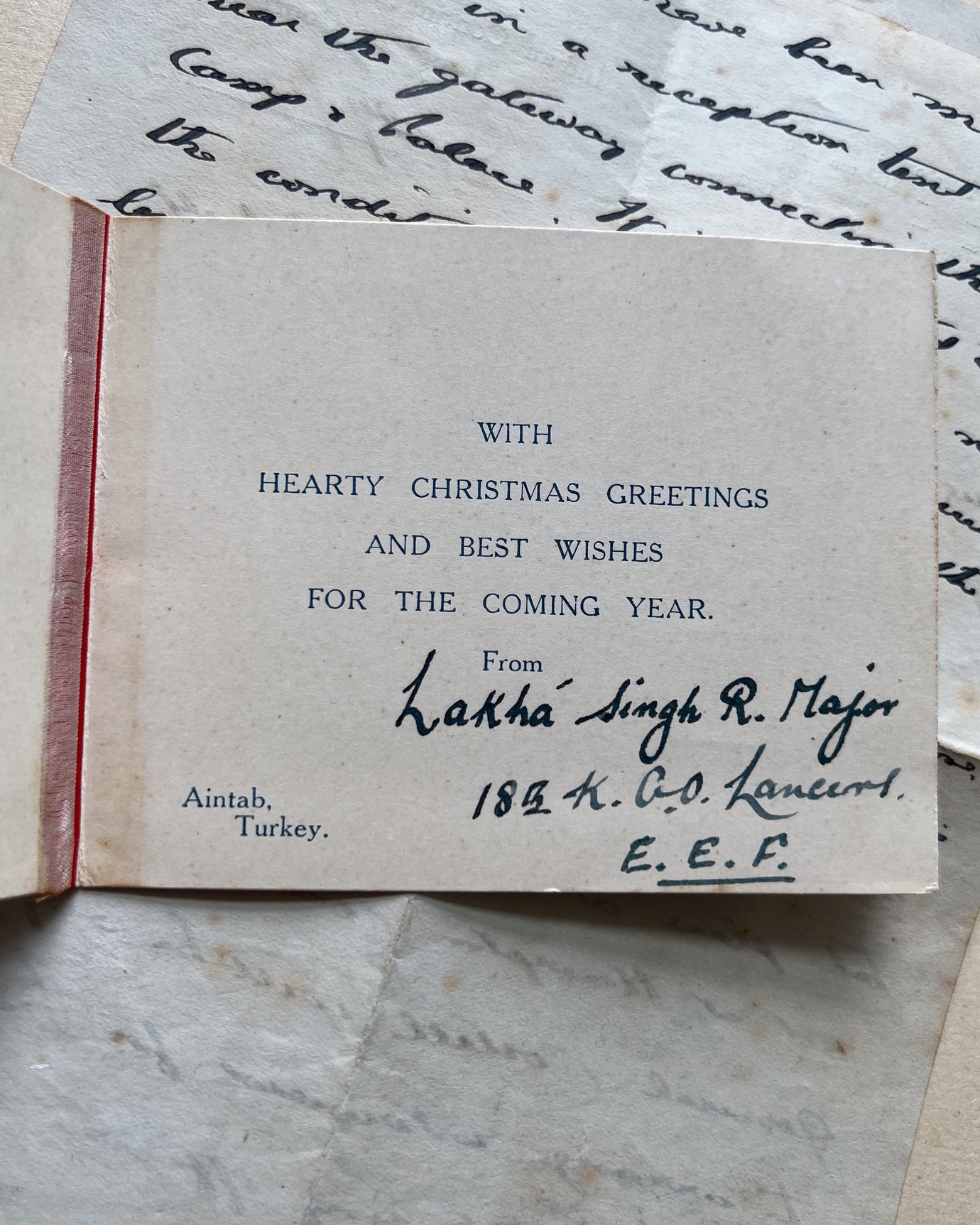 Step into history as we share a unique postcard transcending time and place. Directly from the scrapbook of Punjabi Princess Sophia Duleep Singh, we present you with a special message. Inscribed with heartfelt Christmas greetings and best wishes, this beautiful postcard originates from Aintab, Turkey. Lakha Singh, an esteemed R.Major from the renowned 184th K. Go. Lancer regiment of the East of Egypt and East Force (E.E.F). Imagine the scene: the year is 1918, amidst the echoes of World War I. Yet, even amid the chaos, the power of connection and goodwill shines through. Unveiling this historical gem, we invite you to reflect upon the shared humanity that binds us all. Let Princess Sophia Duleep Singh and Major Lakha Singh's exchange inspire us to extend our own heartfelt greetings to loved ones near and far.