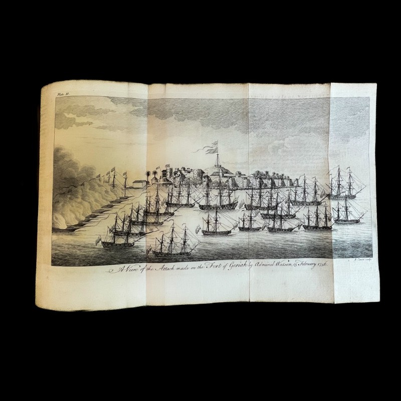 By Admiral Watson, 13 February 1756 Print maker: Canot was born in France in about 1710. In 1740 he moved to England, where he lived there the rest of his life. He was elected an Associate Engraver of the Royal Academy in 1770, and died at Kentish Town, then just outside London, in 1777.] He engraved a large number of landscapes, sea-pieces, and other subjects after artists including Jan van Goyen, Lorrain and Jean Pillement. Joseph Strutt believed that his best prints were some large plates of maritime subjects after the works of Richard Paton. Description: A fleet of ships of a British-led Indo-Portuguese force of the East India Company under the command of Admiral Charles Watson, in formation in front of a fortified island, the stronghold of the Maratha pirate Tulagee Angria, with a flagpole on a hill in the centre and a line of fire barges approaching from the left; plate XI of a series. Etching