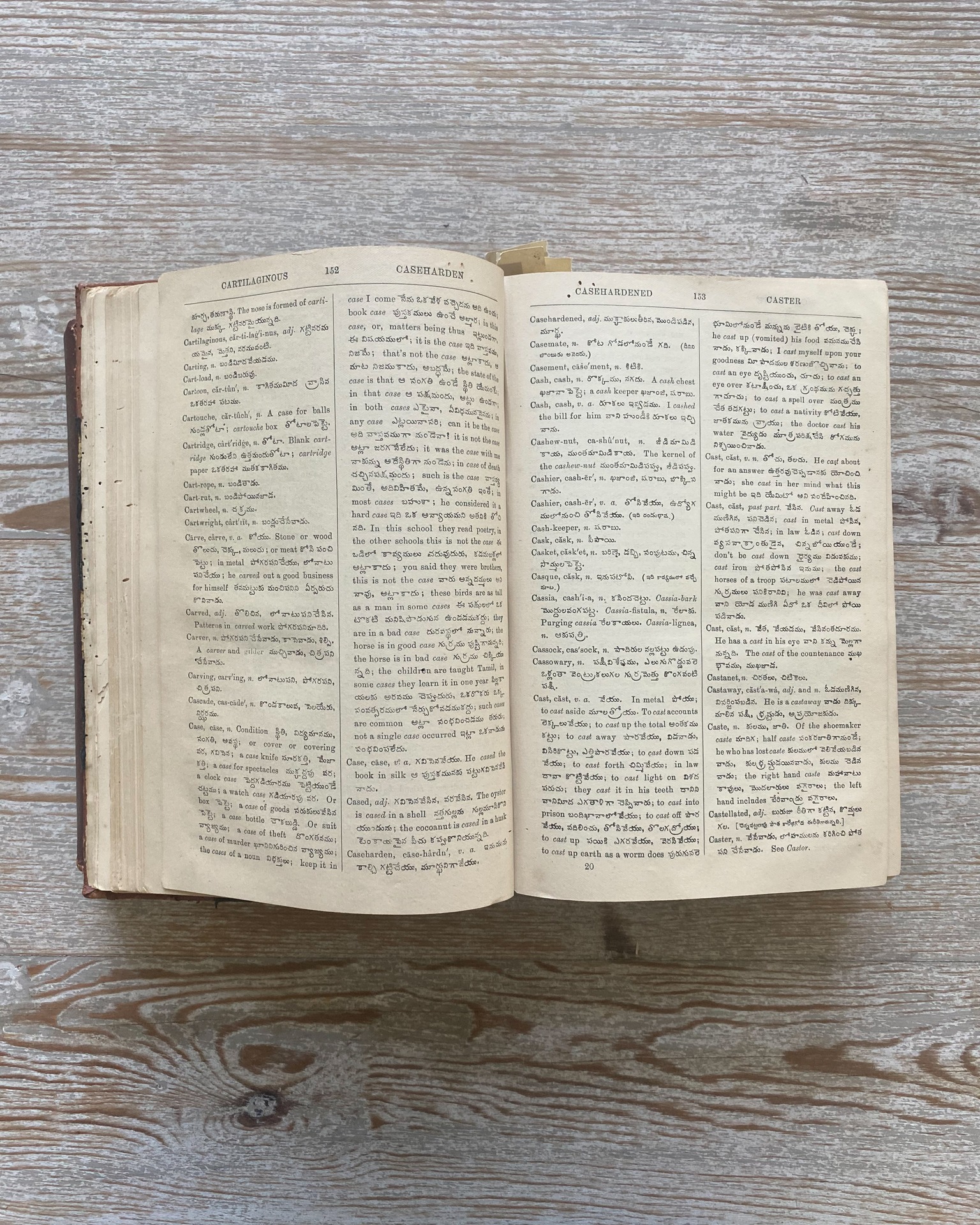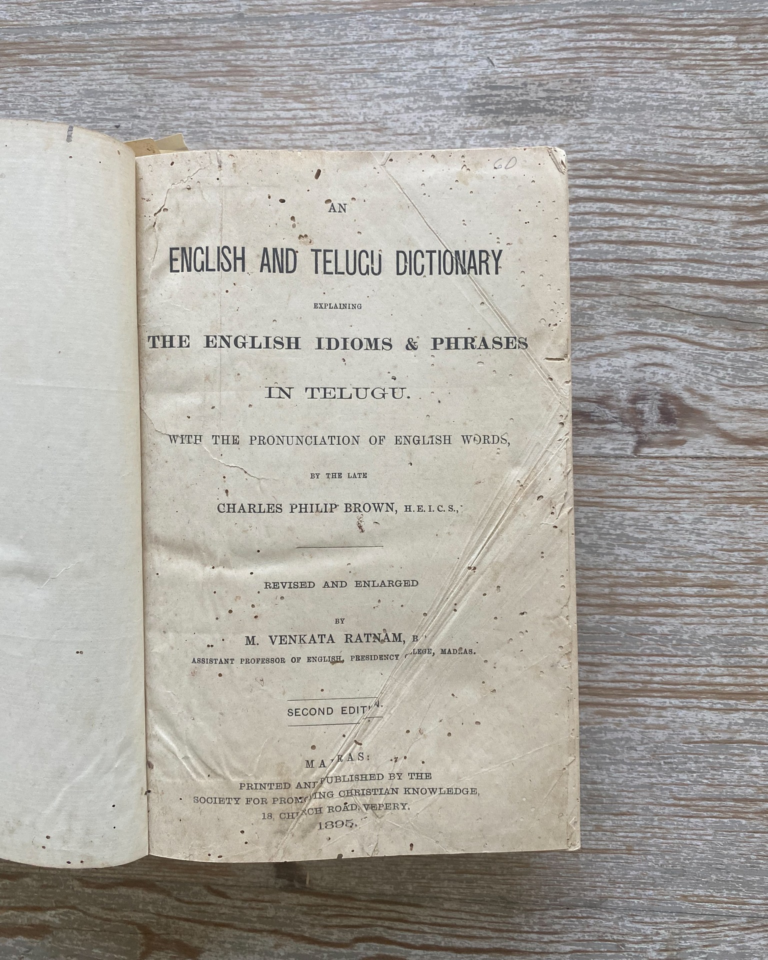 An English And Telugu Dictionary Explaining The English Idioms & Phrases In Telugu. With The Pronunciation Of English Words, By The Late…Revised And Enlarged By M.Venkata Ratnam, B.A., Assistant Professor Of English Presidency College, Madras. BROWN, Charles Philip. Editorial: Madras: The Society for Promoting Christian Knowledge, 1895.