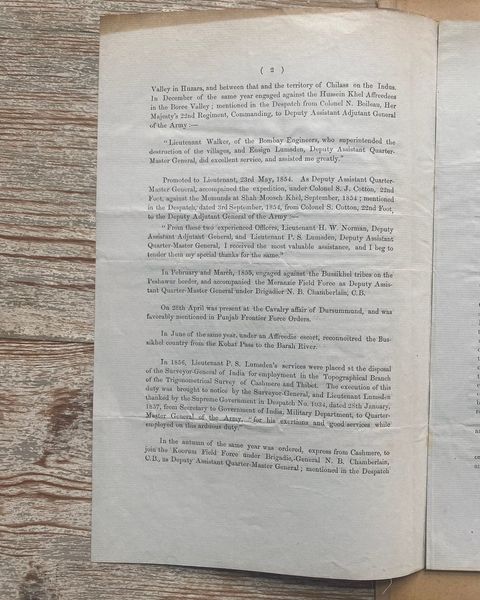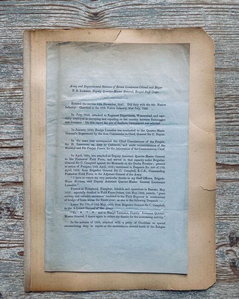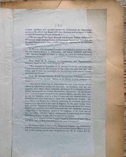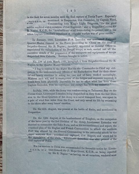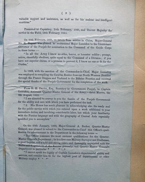 Although this should have been recorded in the British Indian Army records, the printed copy given to an officer and perhaps his superiors seldom seems to have survived. General Sir Peter Stark Lumsden, G.C.B., C.S.I., A.D.C. [1829-1918], had a distinguished career in India, China, and Afghanistan and was the author of the standard work on his brother's regiment, Lumsden of the Guides. He served in the Bhutan War of 1854, was on a special mission to Kandahar in 1857, served in the China War with Napier, was QMG India 1868-72, acted as Resident Hyderabad in 1873, was Chief of Staff in India in 1879, and headed the British Commission for the Demarkation of the N.W. The boundary of Afghanistan 1884-5. He was made G.C.B. and an ADC to Queen Victoria.