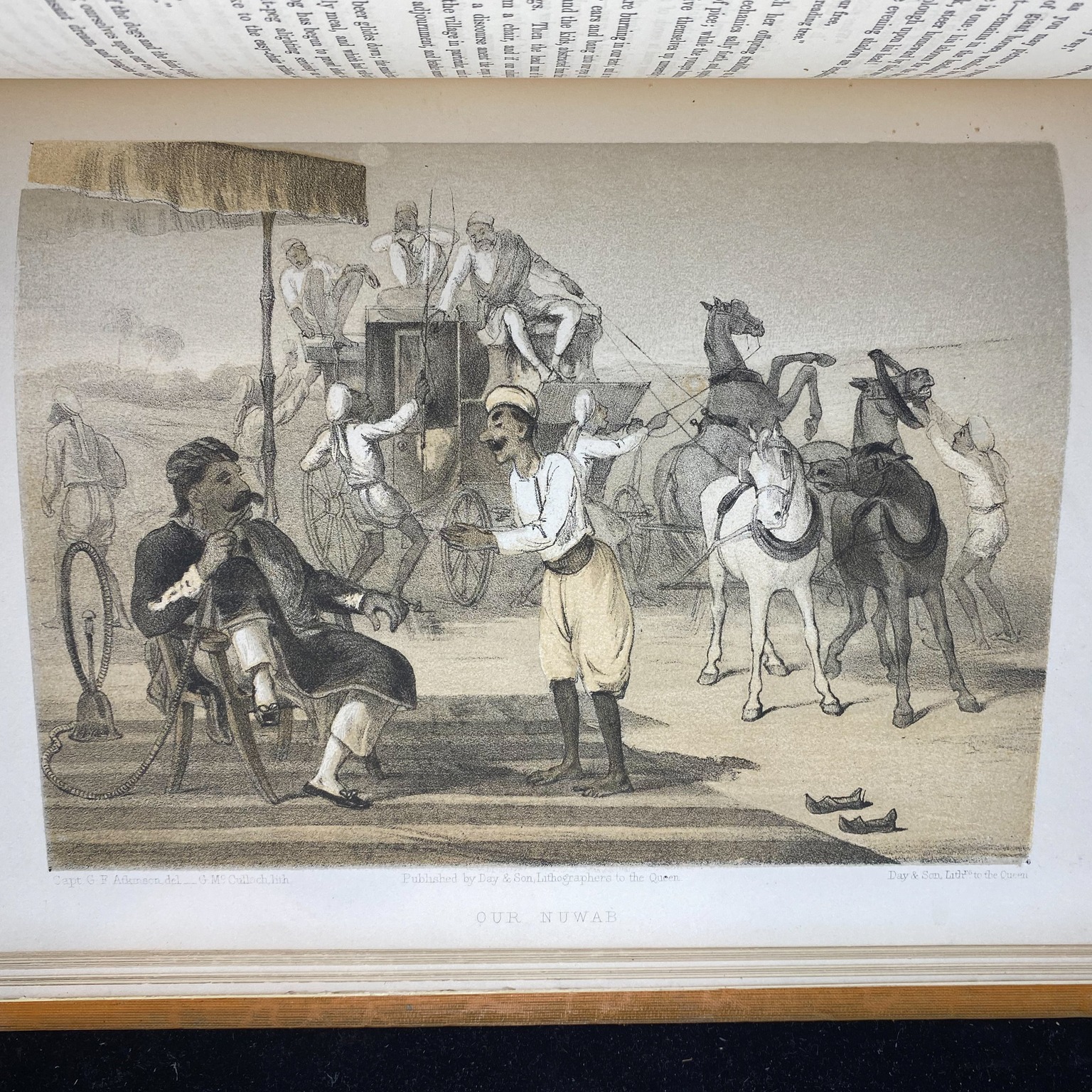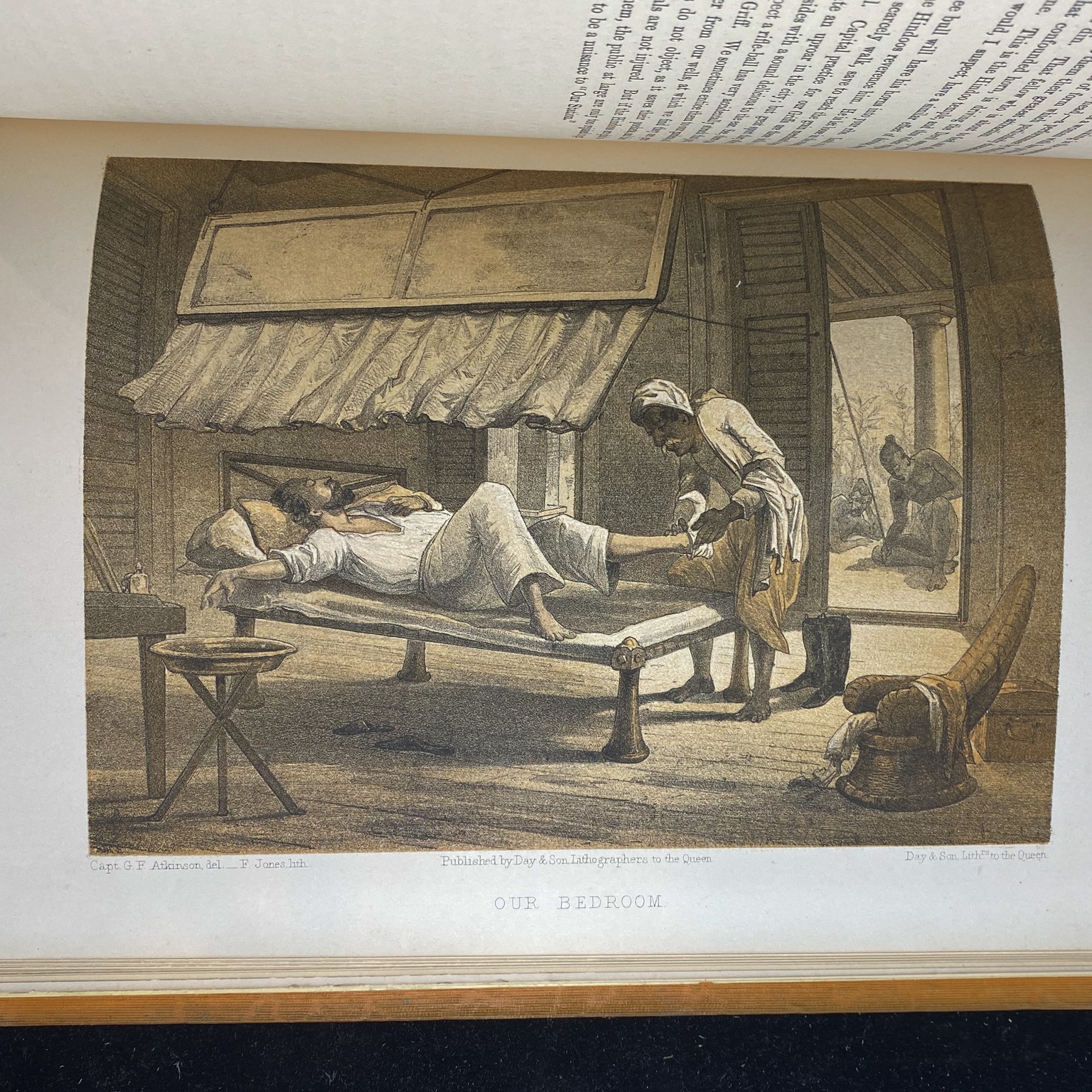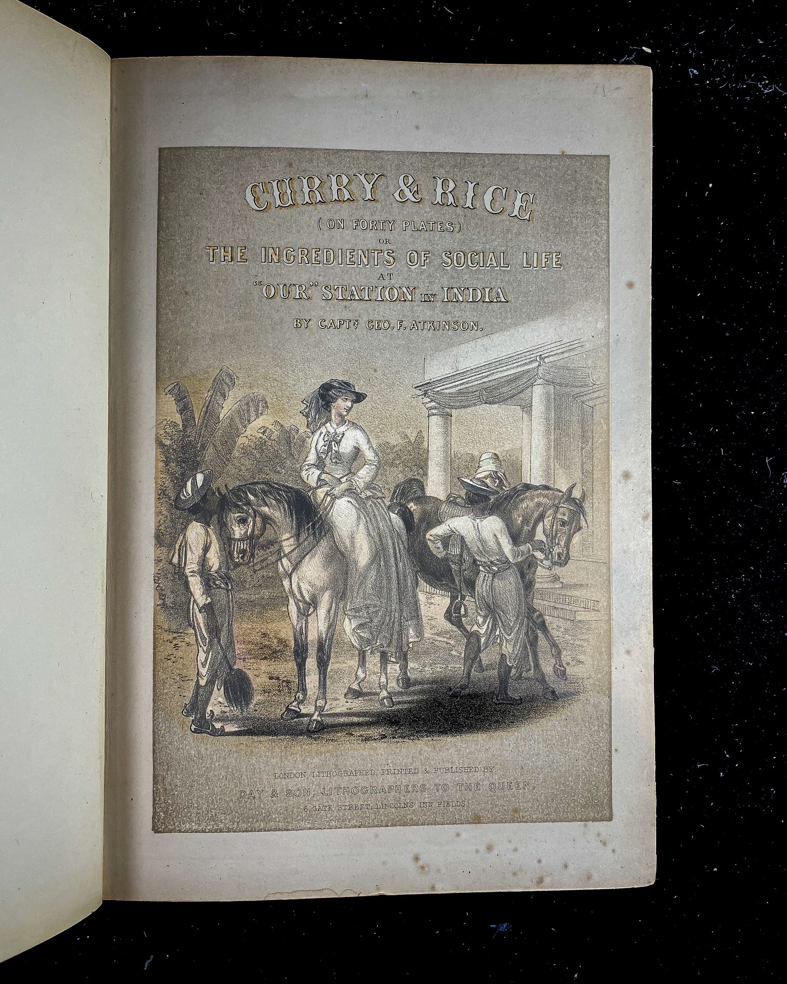 "Curry & Rice" on Forty Plates; or, The Ingredients of Social Life at "Our Station" in India, third edition, additional lithographed title (frayed and loose), 40 tinted lithographed plates by Day & Son after G. F. Atkinson. Day & Son, [c.1860] A profusely illustrated work regarding India in the nineteenth century. Providing a somewhat satirical insight into the colonies in occupied India. Form/Genre: Lithographs -- Hand-colored -- 1859. Contributors: Bryson, Robert M., active 1863-1876, lithographer. Jones, Frederick, active 1867-1885, lithographer. Laby, Alexander, 1814-1899, lithographer. McCulloch, George, fl 1859-1901, lithographer. Picken, Thomas, -1870, lithographer. Walker, Edmund, lithographer Wyatt, M. Digby (Matthew Digby), Sir, 1820-1877, binding designer.