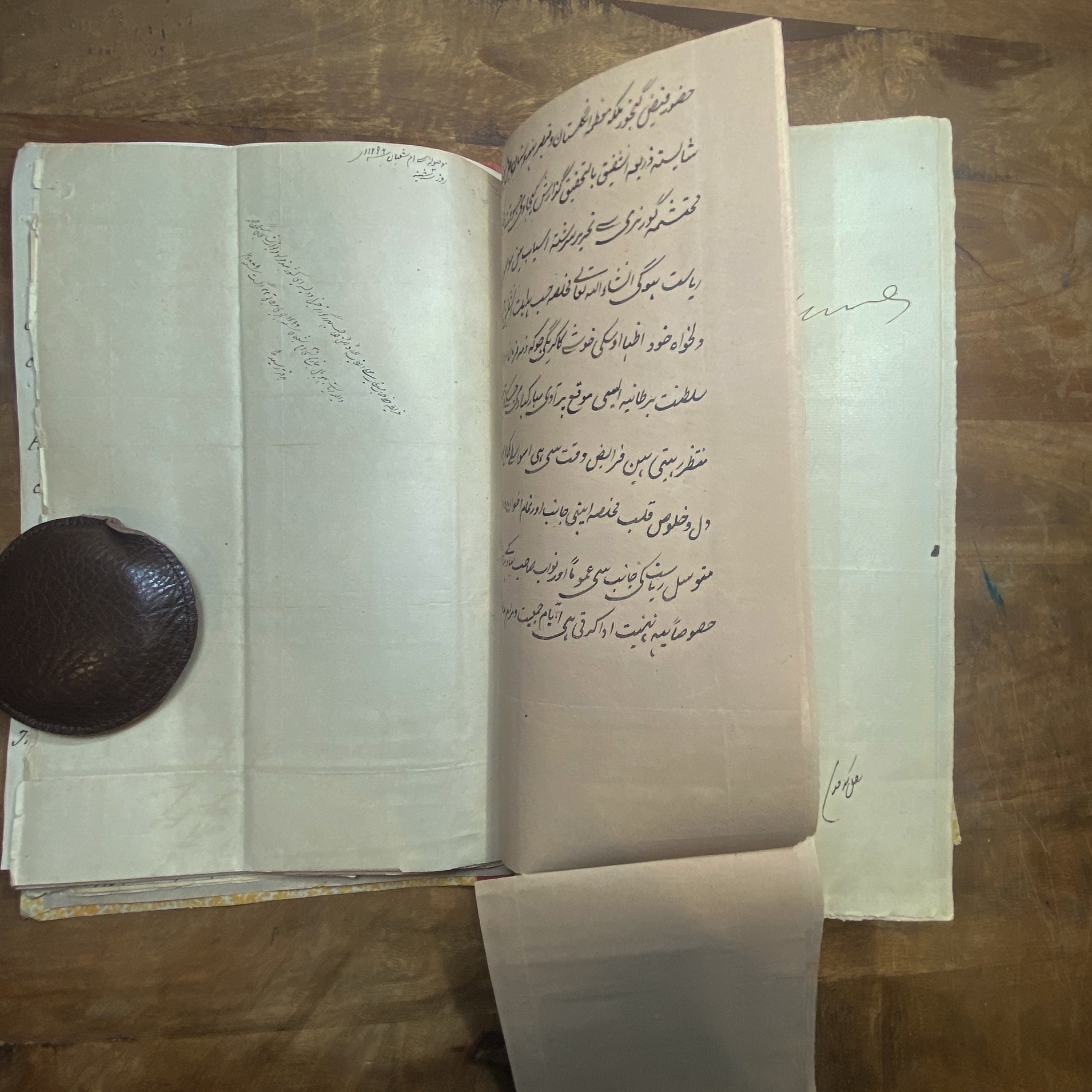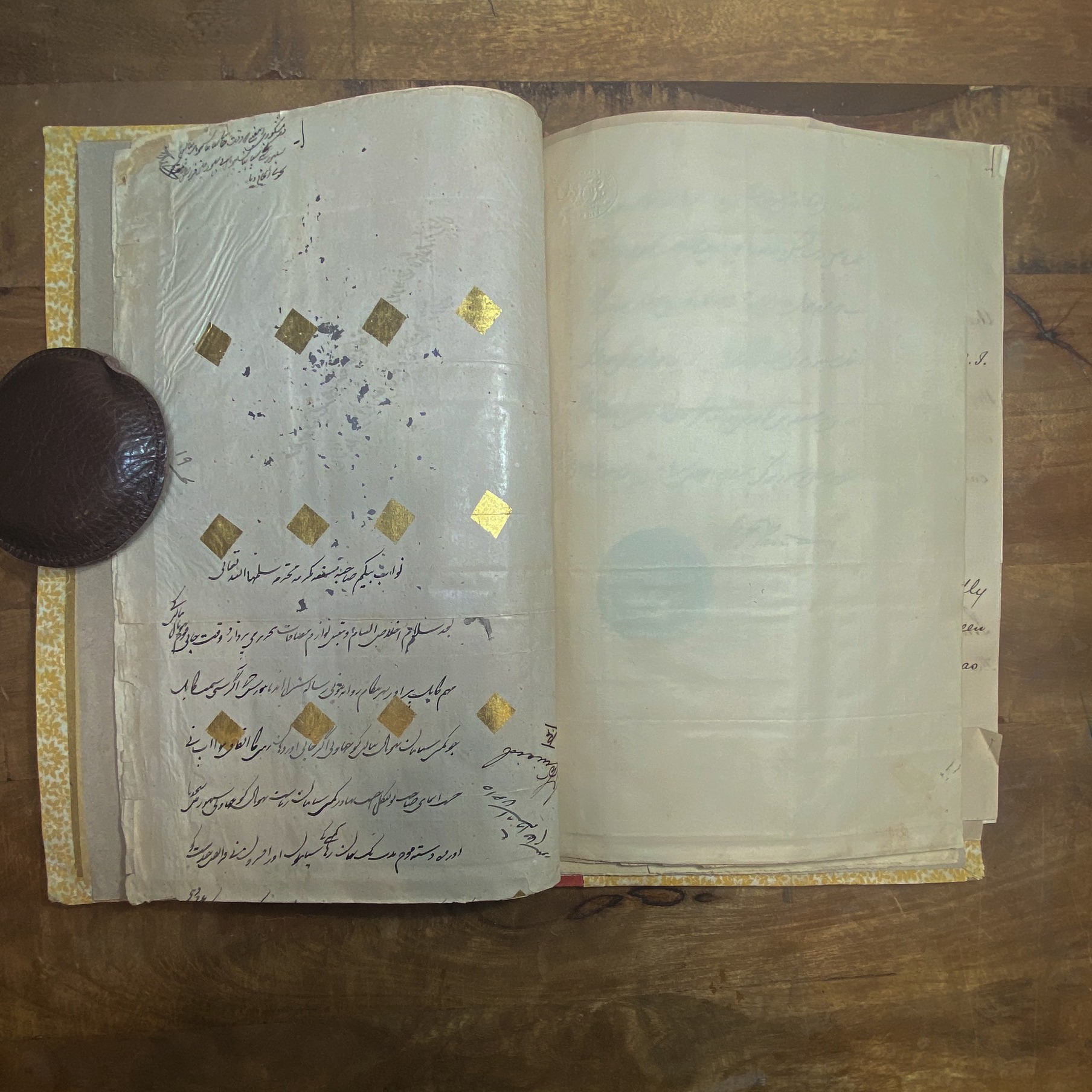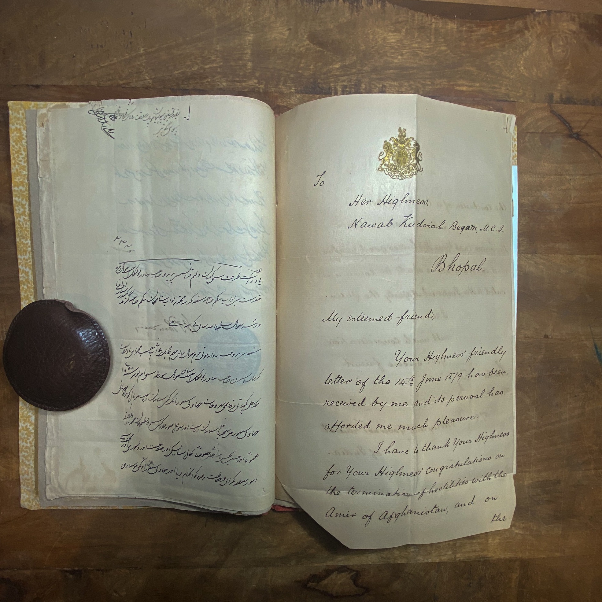 Sewn into a simple binding, the card covers with decorative local printed paper. The binding also includes an official copy on a folio sheet embossed with the small arms of the Govt of India, of a letter to the 1st Asst Agent to the Governor General for Central India [D W K Barr] from the Under Secretary to the Govt of India [Thomas Hope] thanking the Begum for her offer of sending the Bhopal Battalion for "employment in Afghanistan", together with a copy of Barr's letter to Hope and approximately 20 other related letters and documents in Persian, some bearing the inked seal of the AGG for Central India and with gold leaf decoration all housed in a half cloth with marbled papered boards folder.