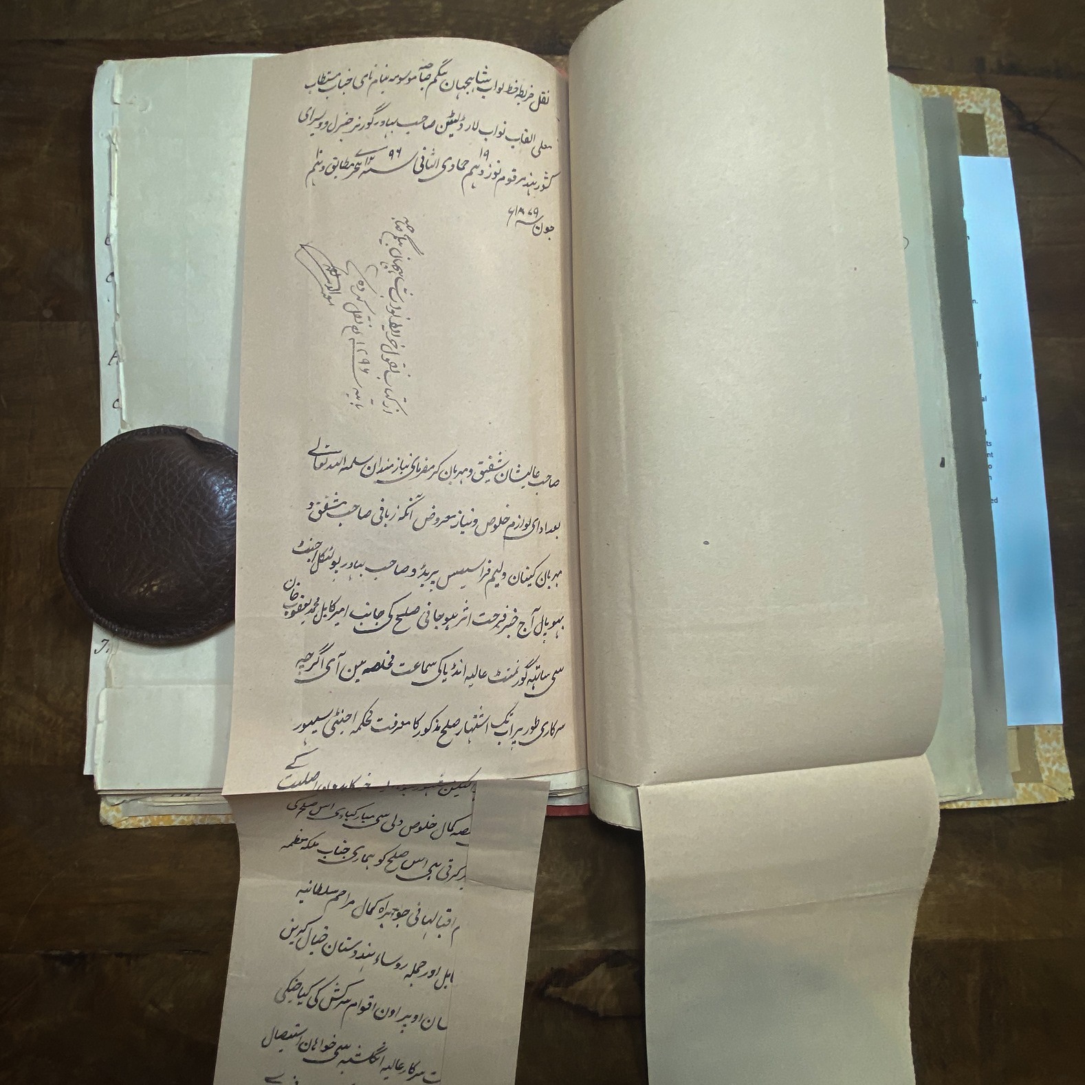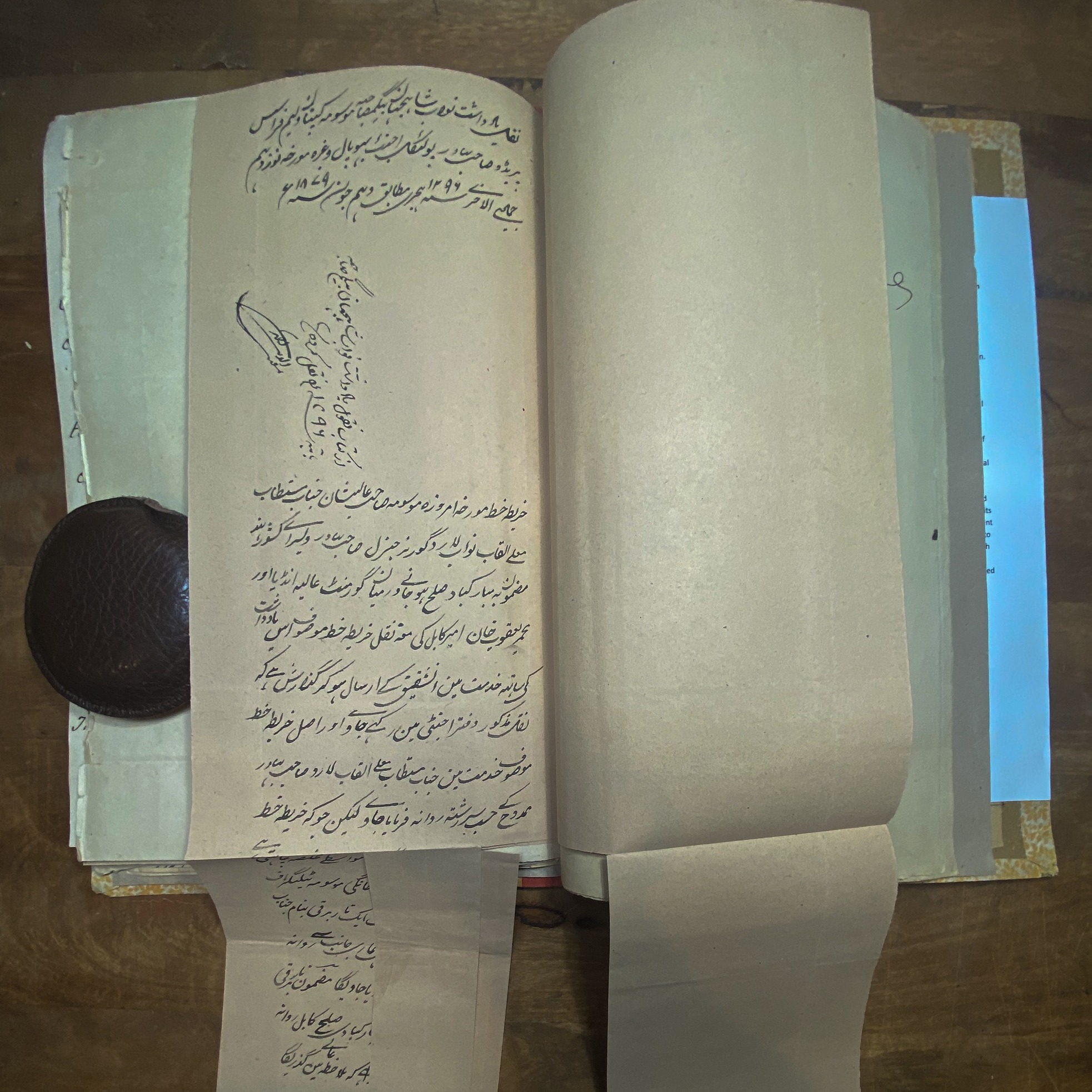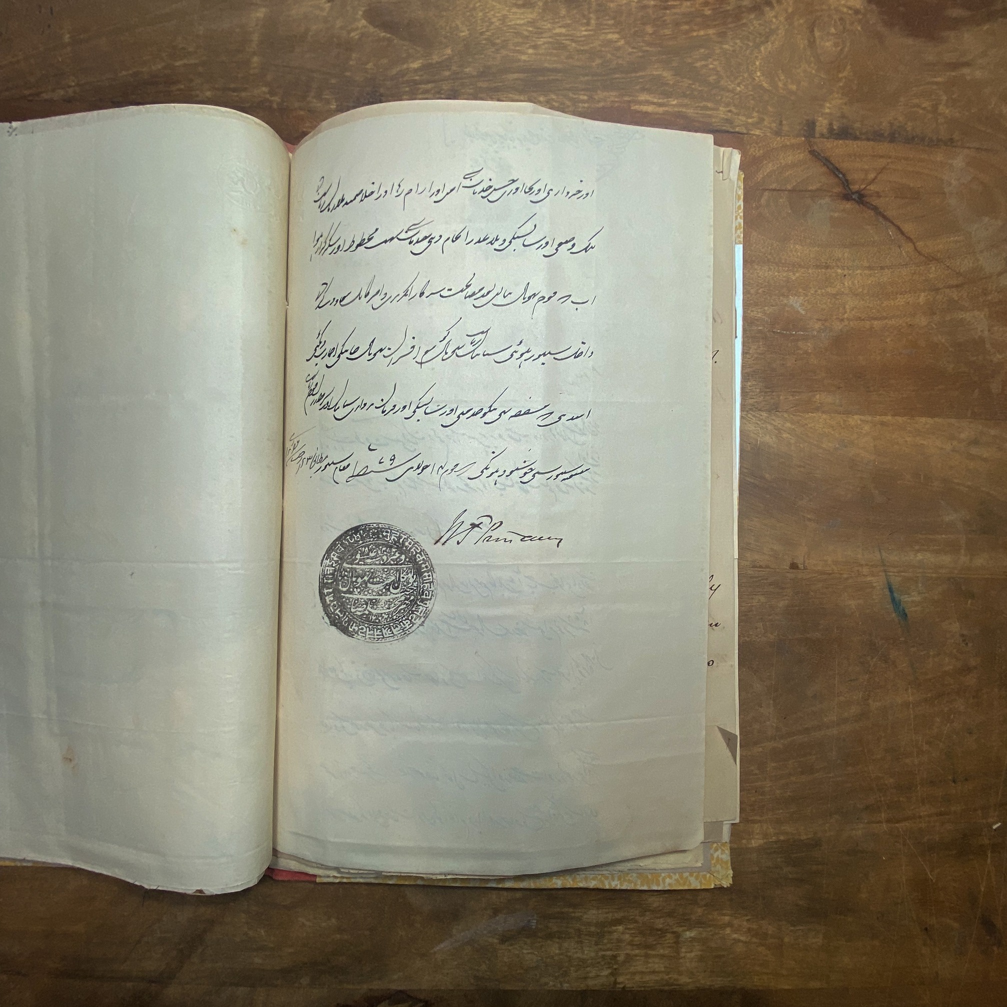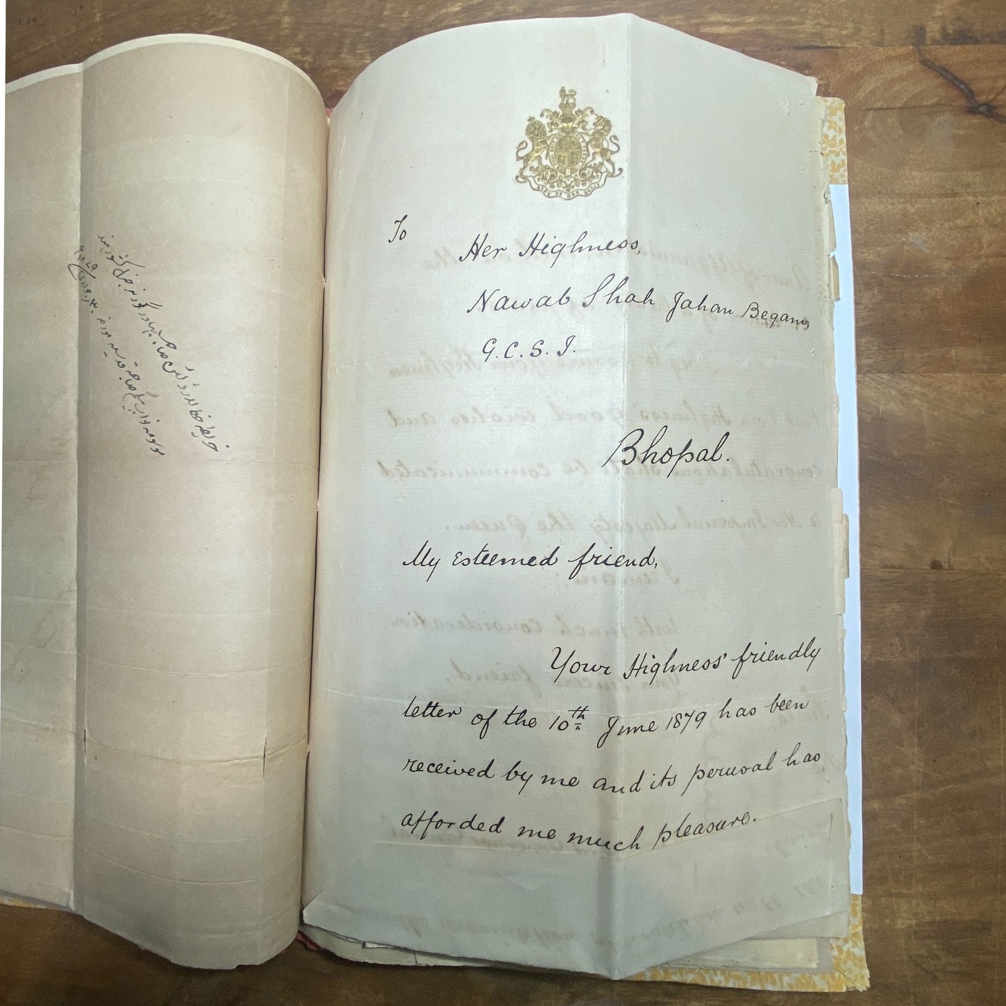 Sewn into a simple binding, the card covers with decorative local printed paper. The binding also includes an official copy on a folio sheet embossed with the small arms of the Govt of India, of a letter to the 1st Asst Agent to the Governor General for Central India [D W K Barr] from the Under Secretary to the Govt of India [Thomas Hope] thanking the Begum for her offer of sending the Bhopal Battalion for "employment in Afghanistan", together with a copy of Barr's letter to Hope and approximately 20 other related letters and documents in Persian, some bearing the inked seal of the AGG for Central India and with gold leaf decoration all housed in a half cloth with marbled papered boards folder.