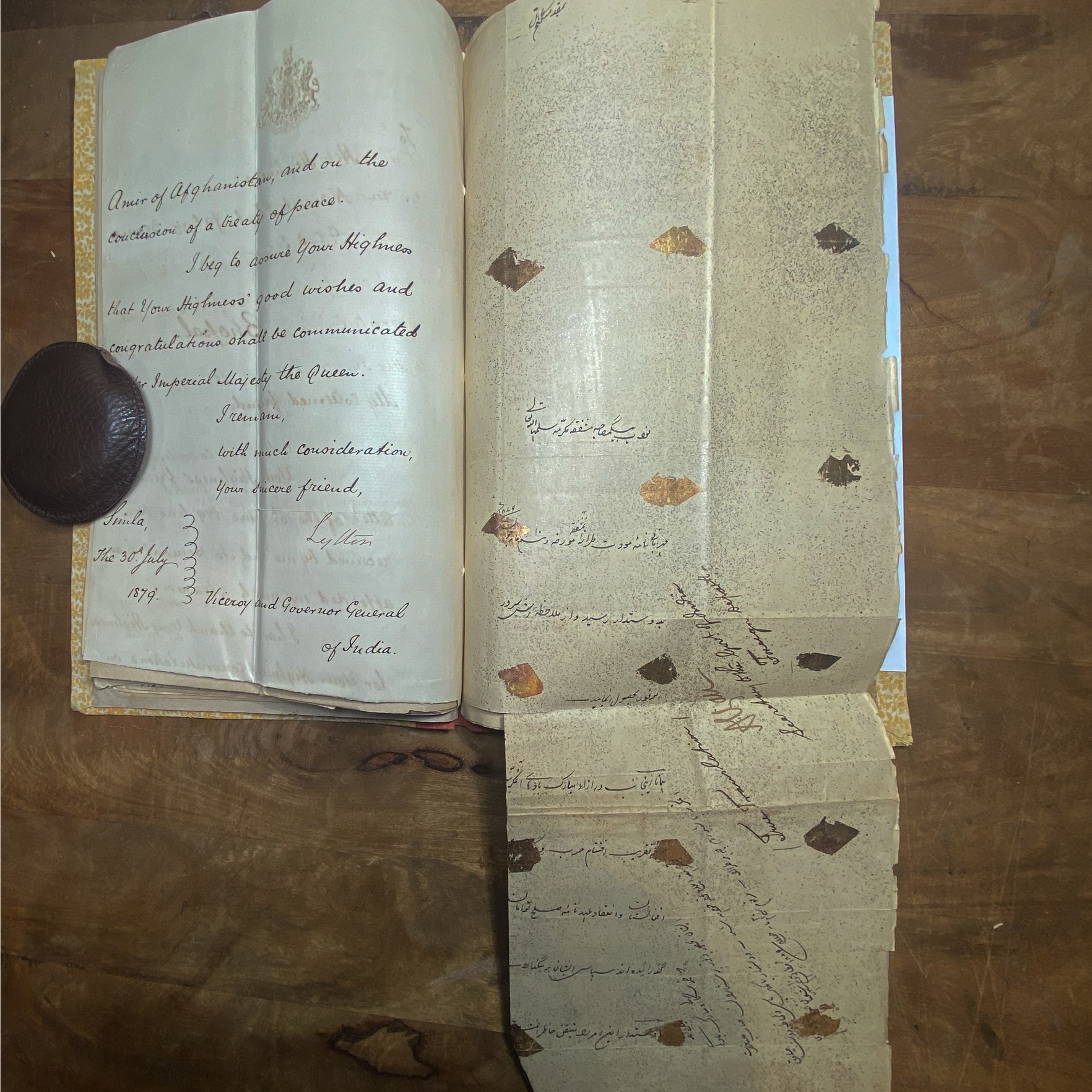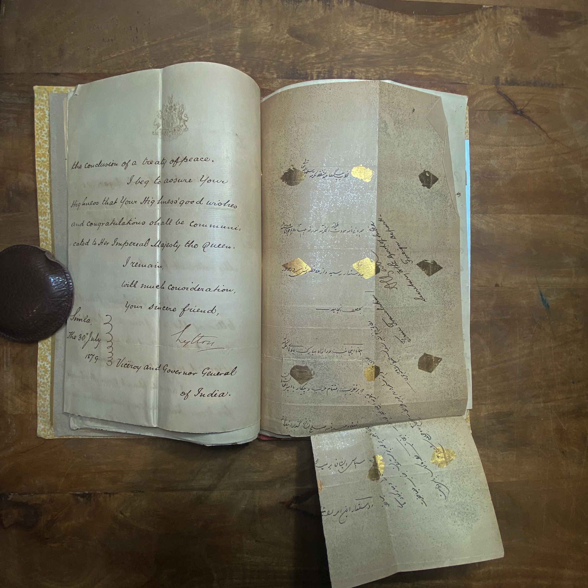 Two 1879 Letters signed by Lord Lytton (Viceroy 1876-1880) addressed to Her Highness Nawab Kudsia Begam on the Conclusion of the Afghan War; A manuscript letter written in palace script on both sides of a single sheet of parchment, embossed in gold with the Viceroy's royal coat of arms, addressed to Her Highness Nawab Kudsia Begam, M.C.I. Dated Simla 30th July 1879 and signed Lytton. The letter thanks the Begum for her congratulations on "the termination of hostilities with the Amir of Afghanistan" and promises to convey them to the Queen. This letter is folded at foot and fore-edge to fit the binding and is accompanied by another letter using the same wording and also signed Lytton but addressed to Her Highness Nawab Shah Jahan Begam, G.C.S.l., together with true copies in Persian on gold leaf decorated paper, certified and signed by the Secretary to the Government of India.