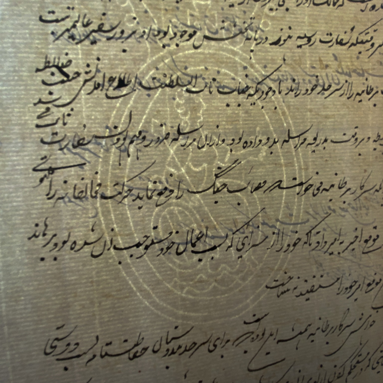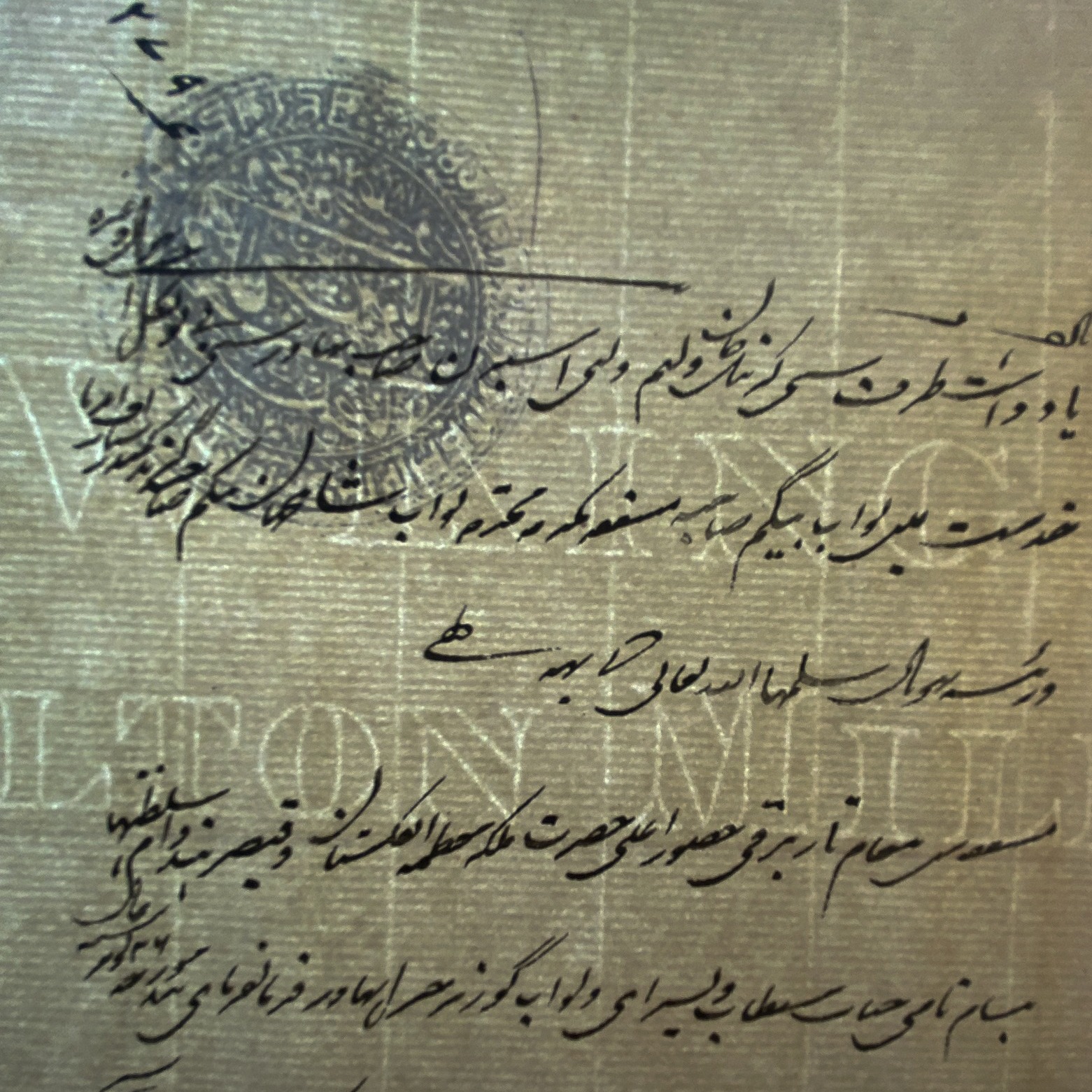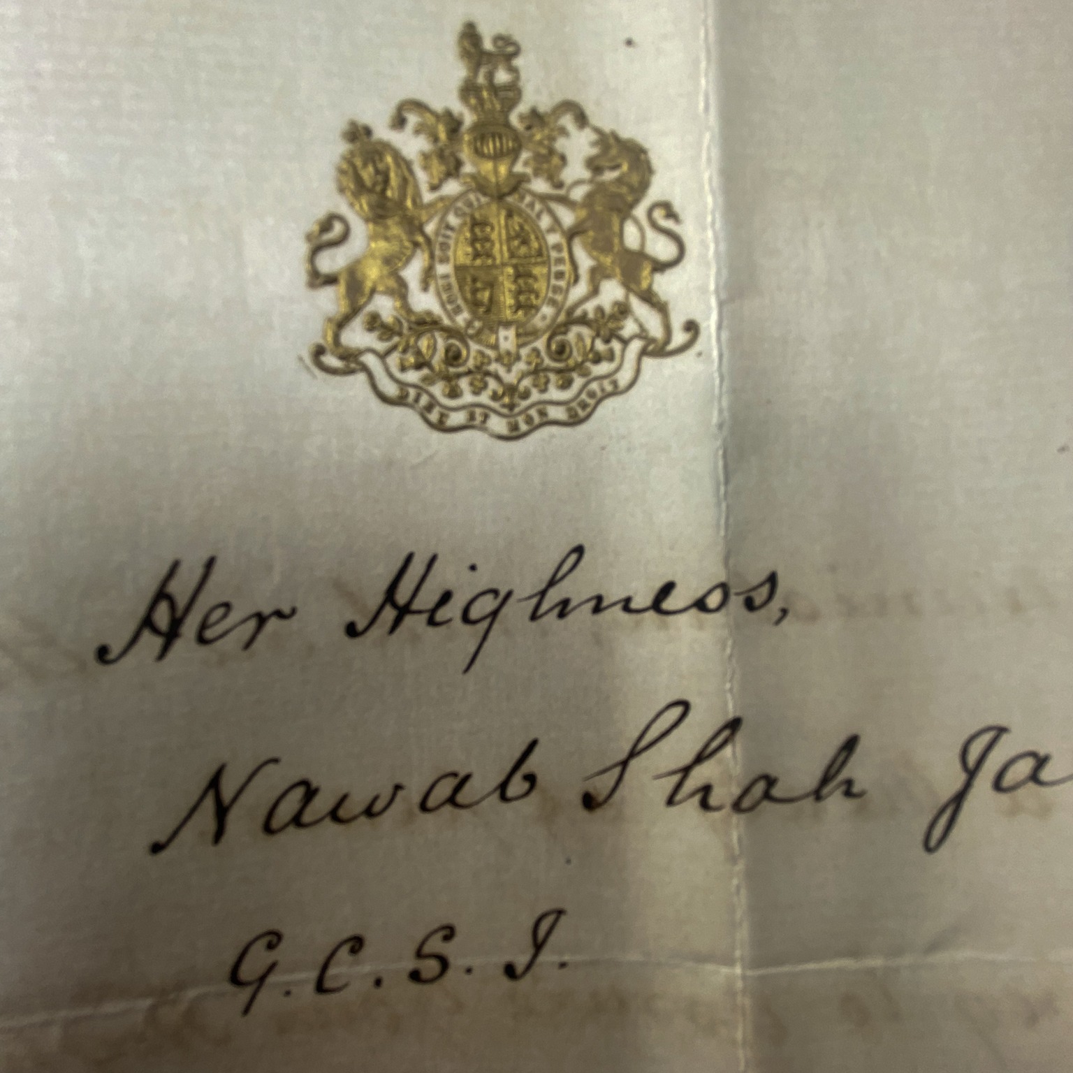 Two 1879 Letters signed by Lord Lytton (Viceroy 1876-1880) addressed to Her Highness Nawab Kudsia Begam on the Conclusion of the Afghan War; A manuscript letter written in palace script on both sides of a single sheet of parchment, embossed in gold with the Viceroy's royal coat of arms, addressed to Her Highness Nawab Kudsia Begam, M.C.I. Dated Simla 30th July 1879 and signed Lytton. The letter thanks the Begum for her congratulations on "the termination of hostilities with the Amir of Afghanistan" and promises to convey them to the Queen. This letter is folded at foot and fore-edge to fit the binding and is accompanied by another letter using the same wording and also signed Lytton but addressed to Her Highness Nawab Shah Jahan Begam, G.C.S.l., together with true copies in Persian on gold leaf decorated paper, certified and signed by the Secretary to the Government of India.