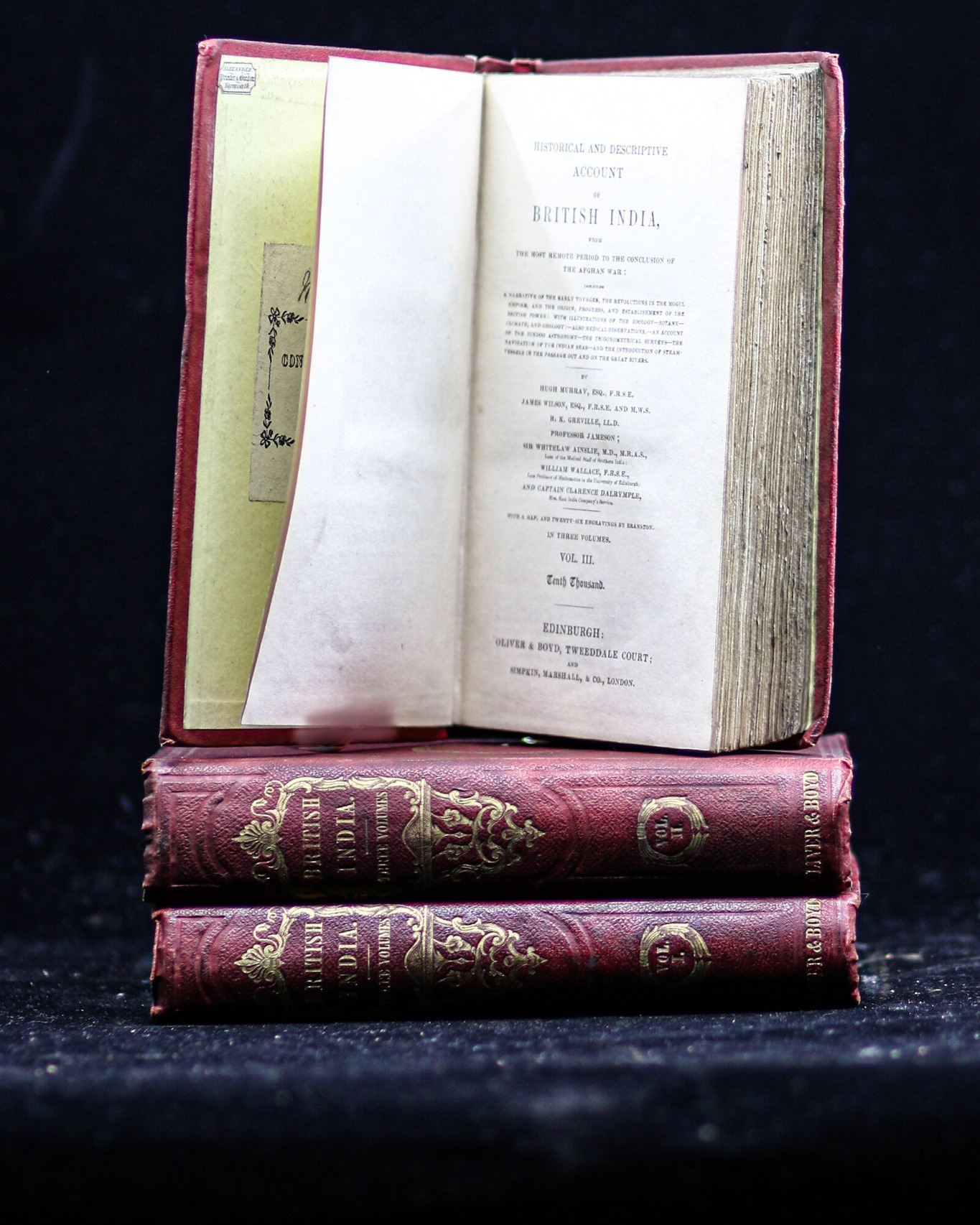 (3 Vol.Set, RARE) Historical and descriptive account of British India, from the most remote period to the present time by Murray, Hugh, 1779-1846; Wilson, James, 1795-1856; Greville, Robert Kaye, 1794-1866; Jameson, Robert, 1774-1854; Ainslie, Whitelaw, Sir 1767-1837; Rhind, William, fl. 1833-1867; Wallace, William, 1768-1843; Dalrymple, Clarence Publication date 1832