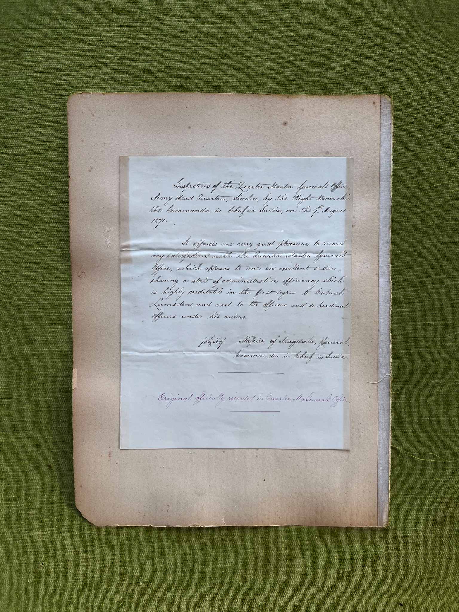 Check out this fascinating piece of history from the collection of Maj Gen Sir Peter Lumsden - a manuscript letter from 1871, in which General Lord Napier of Magdala provides a positive report on the inspection of the Quarter Master General's Office at Army Headquarters in Simla. The letter, written in a fine secretarial hand and marked in purple ink, praises the efficiency of the office and credits Colonel Lumsden, along with the officers and subordinate officers under his orders, for their state of administrative efficiency. This item, which is part of a large archive of General Lumsden's papers passed down through descendants of his brother, General Sir Harry Lumsden, is mounted on an old card album page. General Lumsden himself had a distinguished career in India, China, and Afghanistan, and was the author of the standard work on his brother's regiment, Lumsden of the Guides. He was made a G.C.B. and an ADC to Queen Victoria for his service.