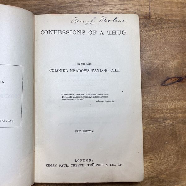 Confessions of a thug by Taylor, Meadows, 1808-1876 "I became acquainted with this person in 1832. He was one of the approvers or informers who were sent to the Nizam's territories from Saugor, and whose appalling disclosures caused an excitement in the country which can never be forgotten. I have listened to them with fearful interest, such as I can scarcely hope to excite in the minds of my readers; and I can only add, in corroboration of the ensuing story, that, by his own confessions, which were in every particular confirmed by those of his brother informers, and are upon official record, he had been directly concerned in the murder of seven hundred and nineteen persons. He once said to me, "Ah! Sir, if I had not been in prison twelve years, the number would have been a thousand!"