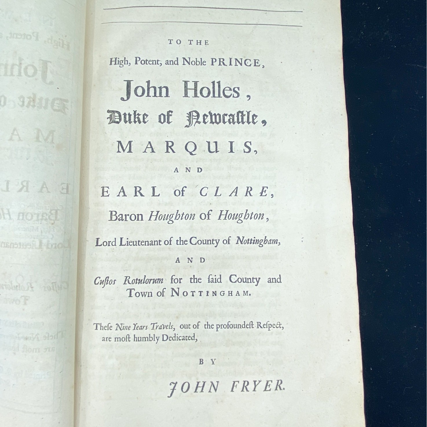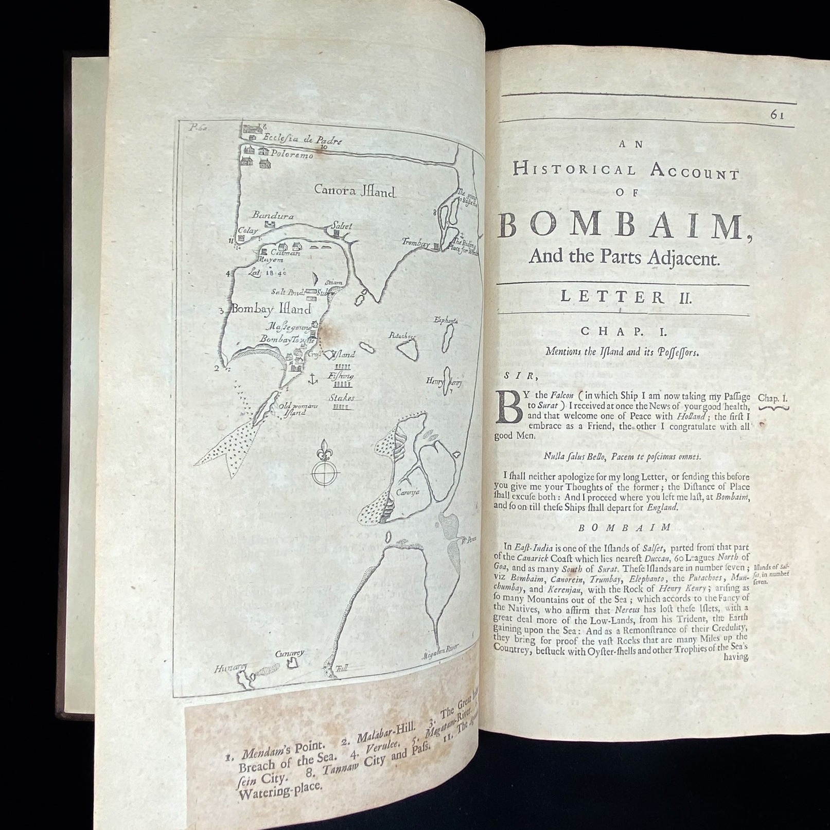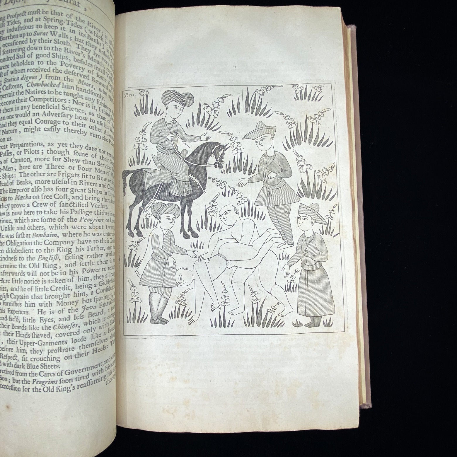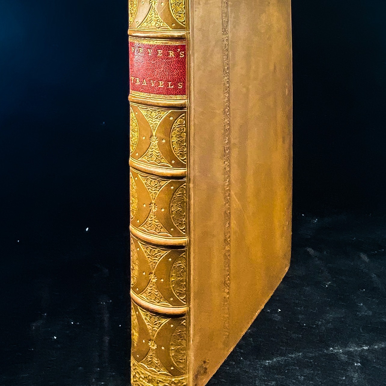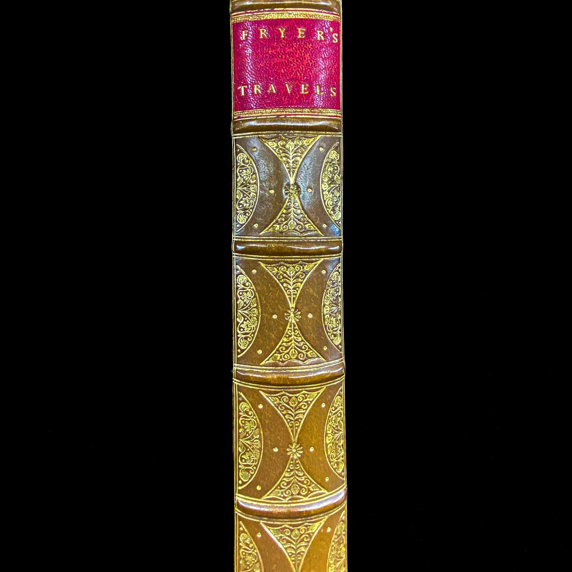 He describes well the cities of Surat and Bombay, the life and trade there as well as at Madras. Nearly sixteen years elapsed before he could be persuaded to publish the story of his wanderings. At length piqued at the frequent appearance of translations of foreign, especially French, books of travel, in which English industry and enterprise were decried, he issued a handsome folio," (Cox, 'Reference Guide To The Literature Of Travel, Vol I, p. 280). "As a surgeon in the service of the East India Company, he left England in December 1672 and arrived at Masulipatam in June 1673. He spent the following four years on the Coromandel and Malabar coasts, visiting and describing Surat, Bombay and Madras. He also travelled to Gokarna, Karwar, Goa, and ventured inland to Junnar. He was in Persia between 1677 and 1679, then returned to India until 1681... [his] account of the places he visited is accurate and reliable with numerous anecdotes told with a fine sense of humour" (Howgego, 'Encyclopedia of Exploration to 1800', p.406). It is a "book rich in details of natural history and local medical practise."