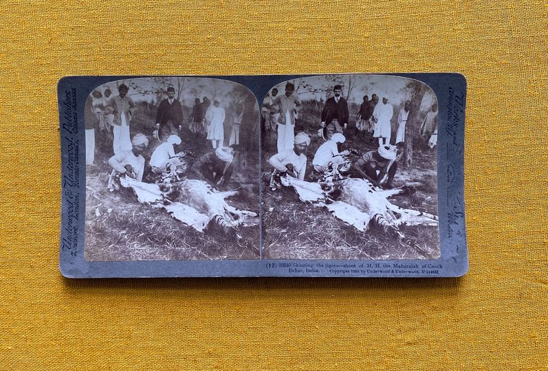 Skinning a tiger on the Maharaja’s shoot, a stereo card, early 20th century A good stereoscopic card by Underwood and Underwood, New York, London, &c. with the rather unusual big game image of shikaris skinning a tiger killed on a shoot of H. H. the Maharaja of Cooch Behar, probably dating from the first two decades of the 2oth centur.
