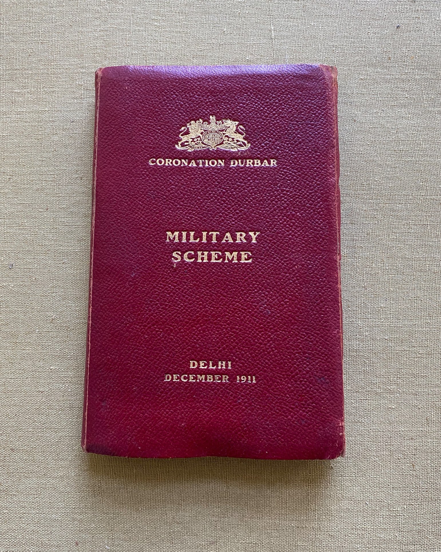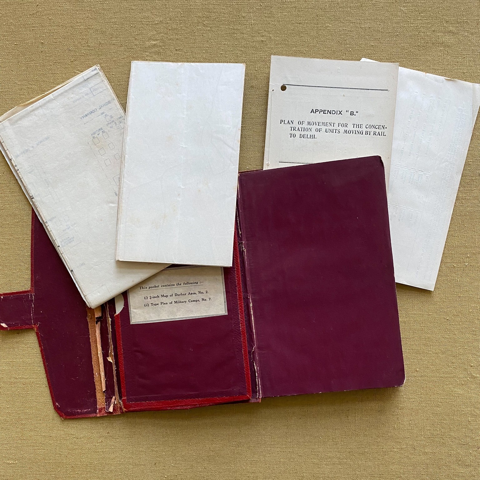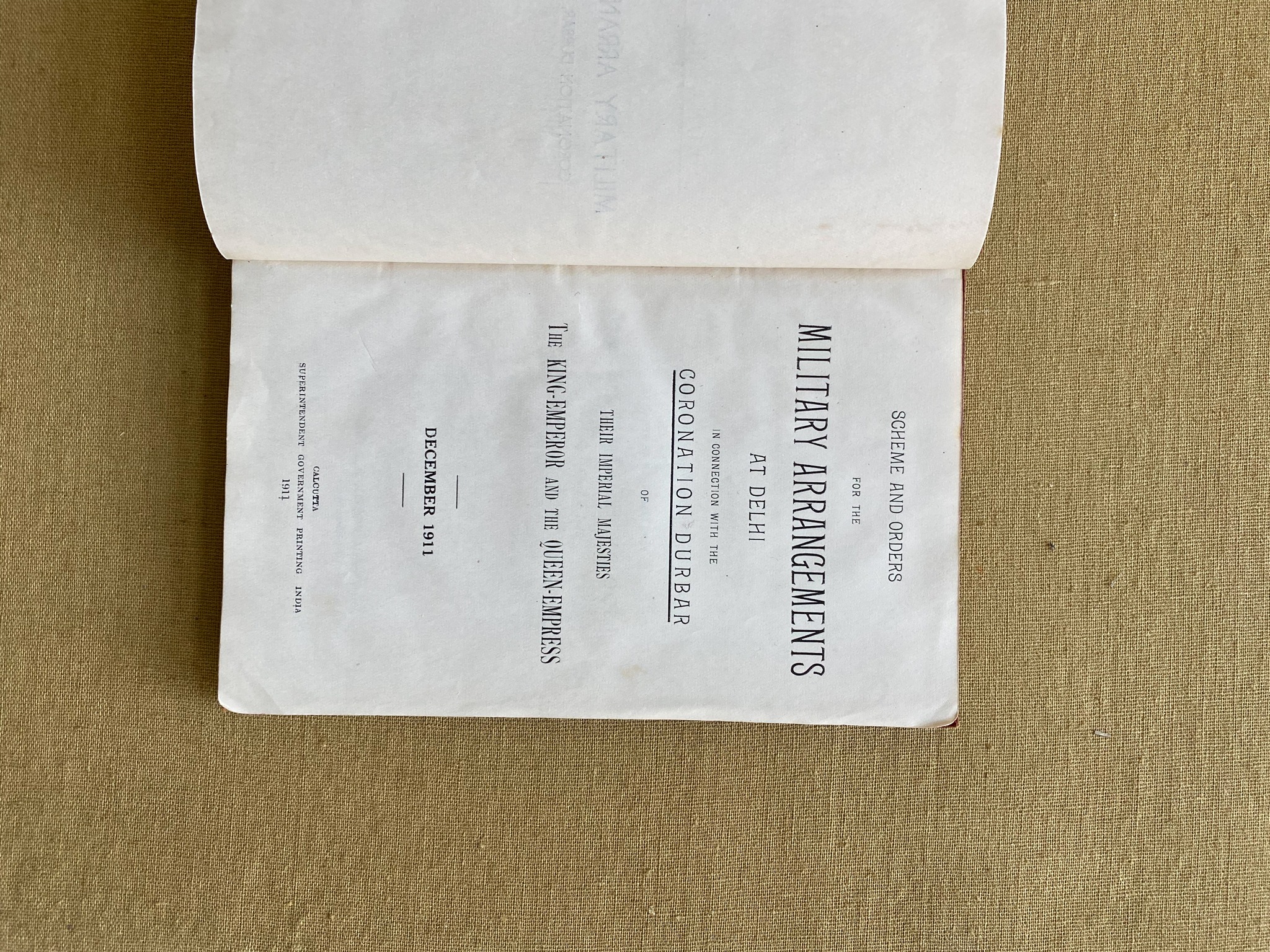 A clean copy for what was a working manual, this example signed in ink on the first and last blank pages Sergt. F. T. Skingle, S. & T Corps India. The sergeant was probably involved in parts of the work in setting up the military camps. The first 20 pages or so list the troops attending, giving name of officers holding special positions on the staffs down to Brigade level. Interesting tables give the approximate strength of the force – totalling some 1,700 British officers, 18,000 British and 36.000 Indian troops, 10,000 troop horses, 1.300 chargers, and 2.500 transport camels. This book provides a vast amount of detail on everything from duties of officers, tentage, allocation of furniture, discipline, and postal information to veterans, pay and allpwances, programme, tickets & invitations, the Military Tournament, etc. A scarce survical of a work which will have had a rather limited circulation and was very much a working manual rather than a souvenir. We have only had one previous complete copy of this book in the last decade.