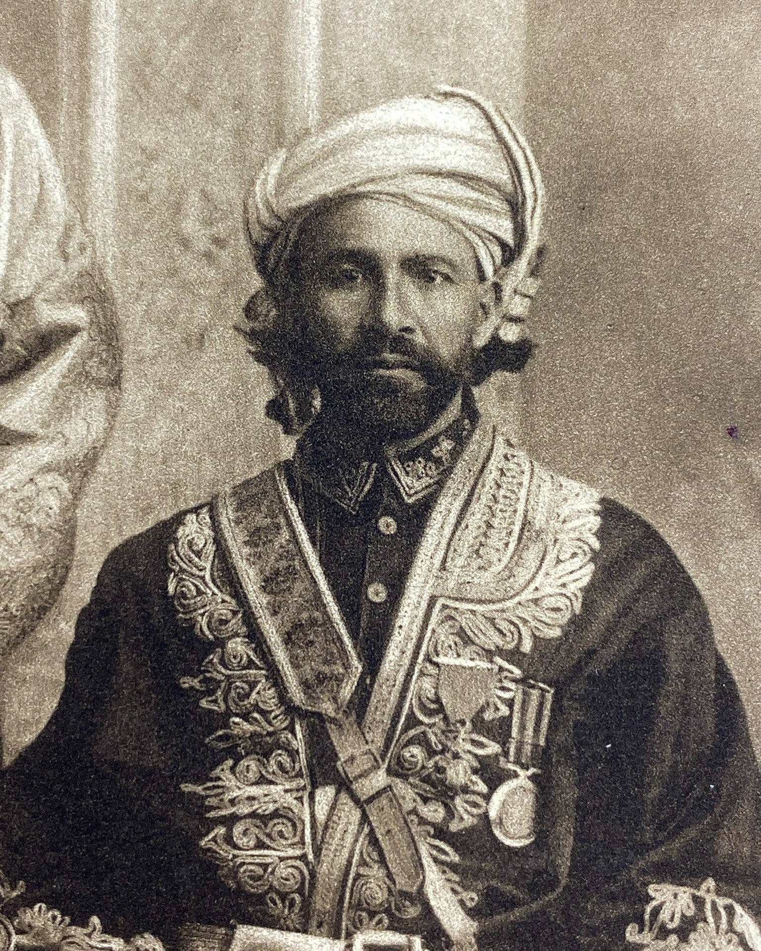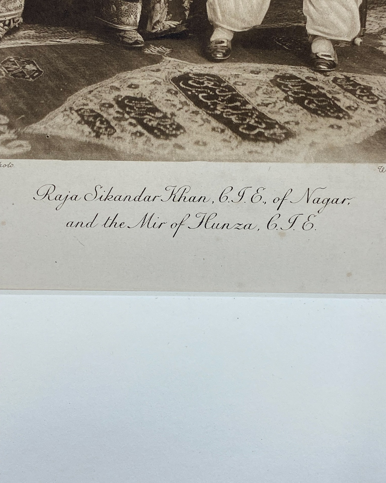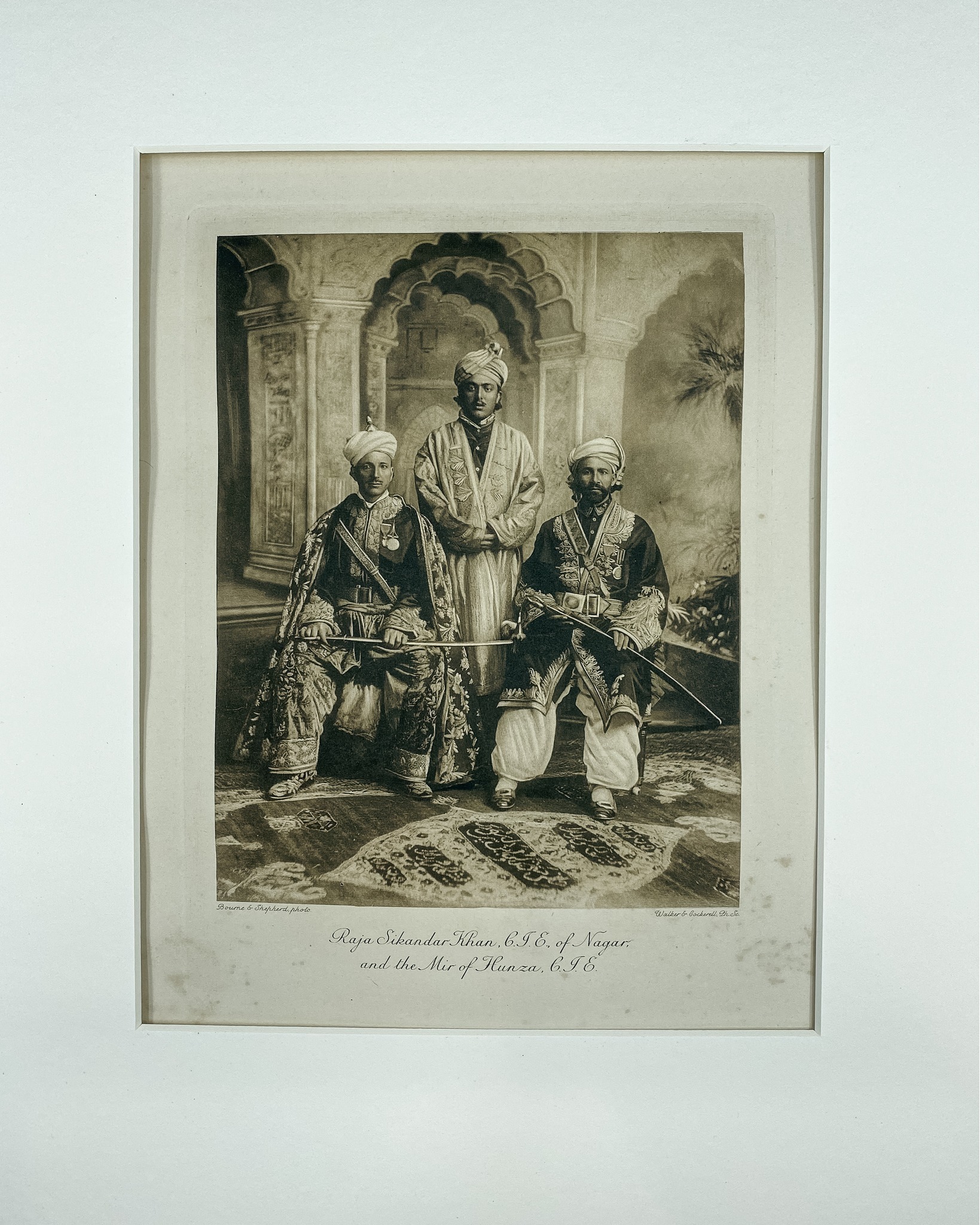 The collective image was taken at the Delhi Durbar (1903), which was held to commemorate Edward VII and Alexandra of Denmark becoming the new Emperor and Empress of India in Delhi. Three times, in 1877, 1903, and 1911, the Delhi Durbar, also known as the Imperial Durbar, was held. At Bourne and Shepherd's photographic studio in Delhi, the group picture was taken in front of a painted background. Among the first commercial photographers in India, Samuel Bourne and Charles Shepherd had both permanent and temporary studios spread throughout numerous towns. They set up photographic studios in Delhi, Calcutta, Shimla, Lahore, and Bombay (now Mumbai) in the years between 1863 and 1880. Their Calcutta (now Kolkata) studio, which was established in 1863, was one of the country's oldest photographic studios when it closed in June 2016. Additionally, they served as the designated photographers for the 1911 Delhi Durbar. Creator(s) Calcutta, Bombay & Simla : Bourne & Shepherd (active 1864-1900s) (photographer) Subject(s) Mir Muhammad Nazim Khan of Hunza (1867-1938) Raja Iskandar Khan, Mir of Nagar (1871-1940)