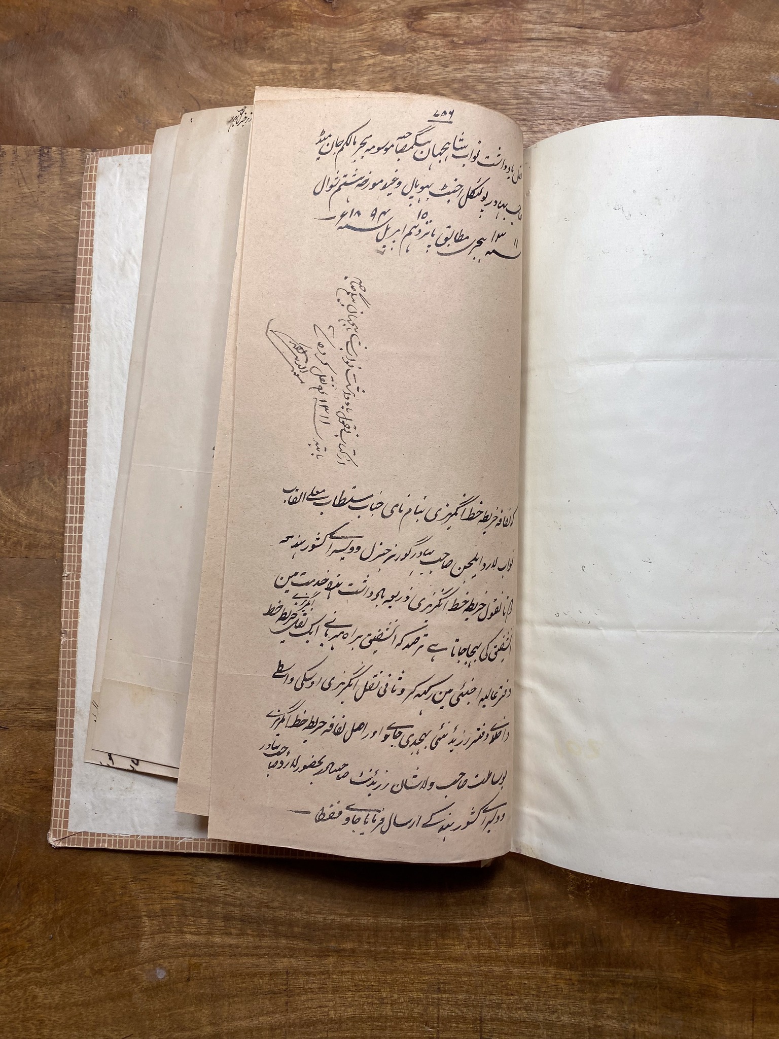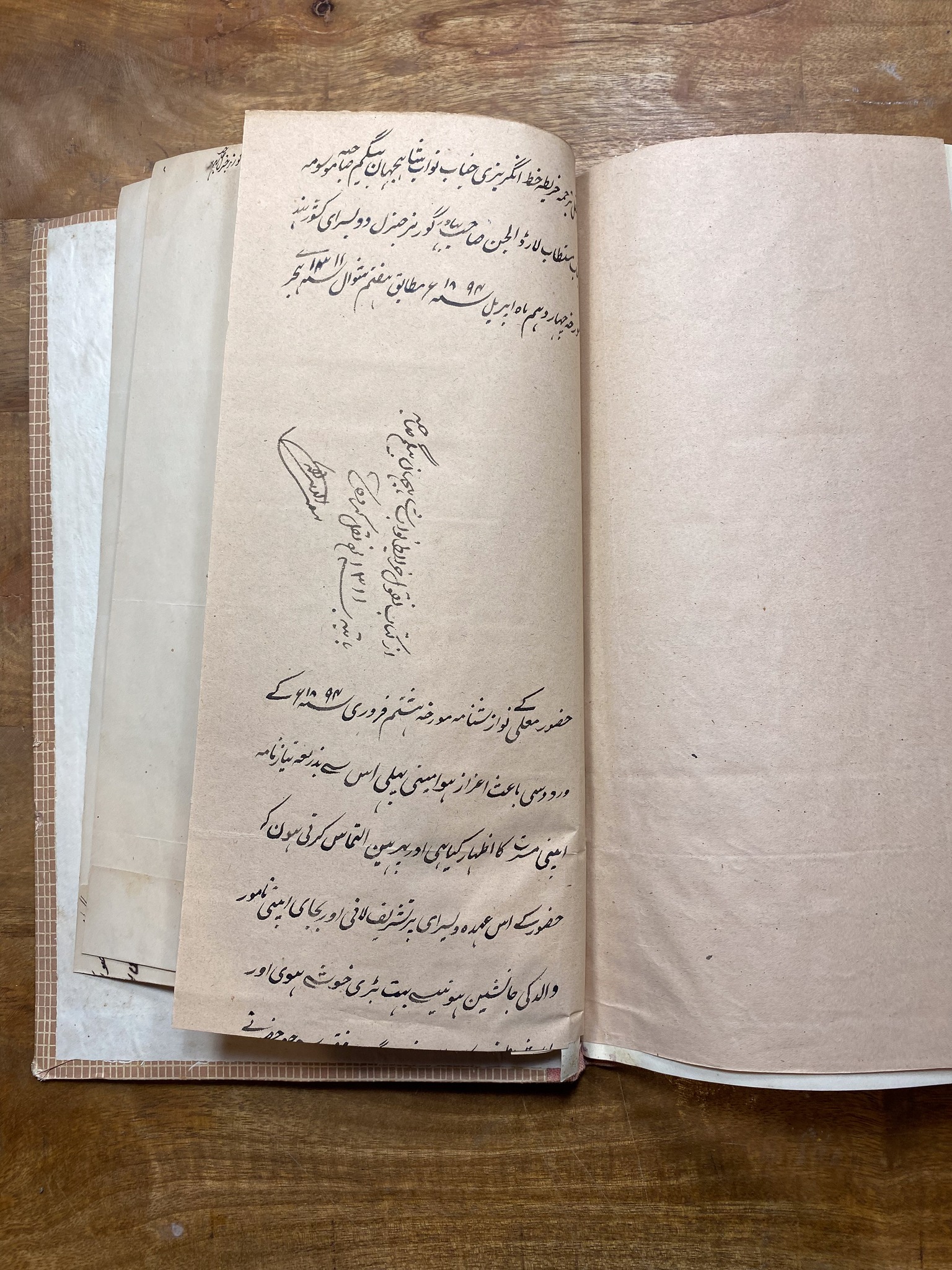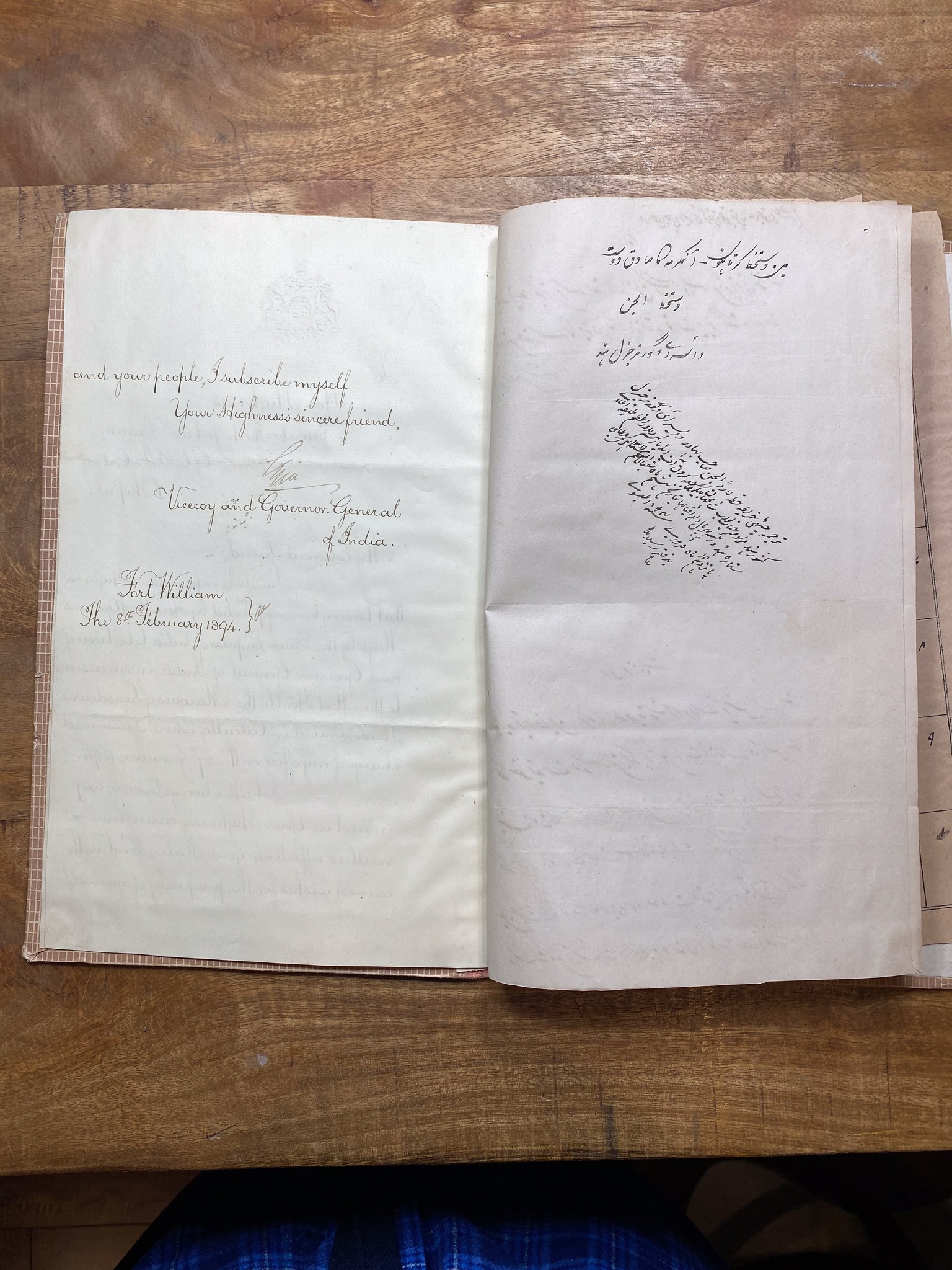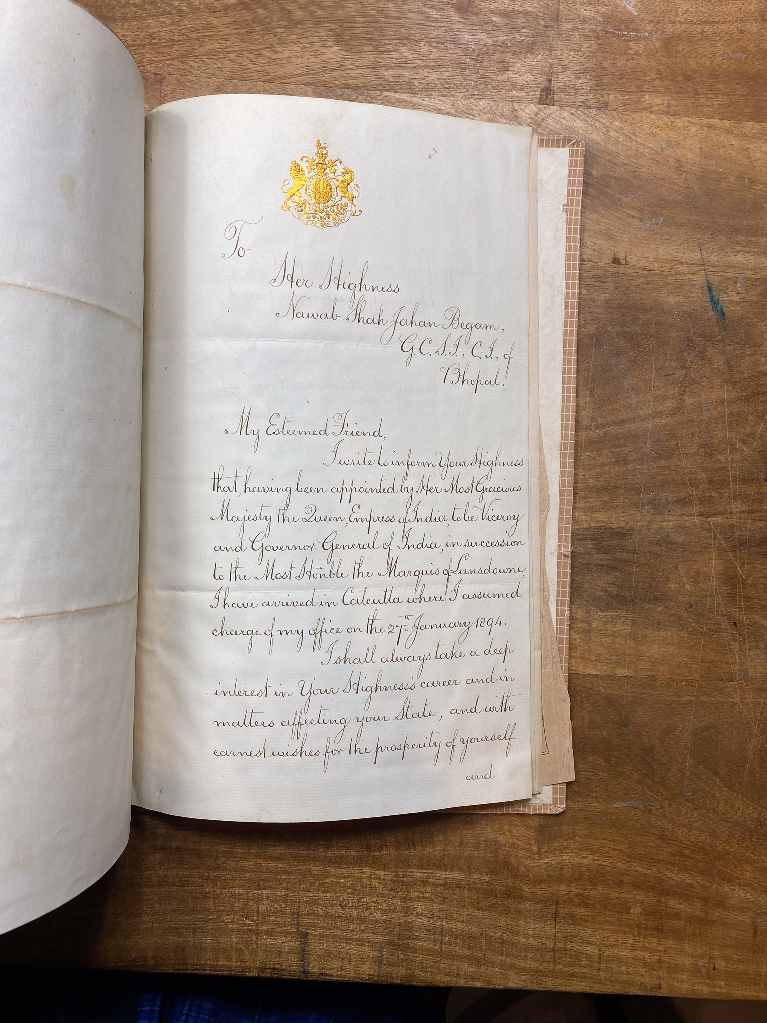 Lord Elgin, to the Begum of Bhopal, Nawab Shah Jahan Begam, in 1894. This letter, authored by a secretary in palace script on a bifolium adorned with the royal arms in gold, is directed to Her Highness Nawab Shah Jahan Begum, G.C.S.I., C.I., of Bhopal. It is signed by Elgin, the Viceroy and Governor General of India, and bears the date of February 8, 1894, from Fort William. The letter is securely fastened within a simple card folder. It includes approximately eight pages of untranslated Persian script, likely comprising copies of the Begum's letters and their translated responses, with one letter bearing the signature and stamp of the Political Agent in Bhopal. Commencing with the salutation "My Esteemed Friend," this fairly formal introductory letter informs that Elgin assumed office on January 27, succeeding the Marquis of Lansdowne, and expresses his intention to take a keen interest in the state of the Begum. While such letters were typically dispatched to senior states, they rarely appear in the market, rendering this particular one unique as it is specifically addressed to the only female ruler of an Indian state in her own right. It was customary for most letters to be conveyed by the Resident or Agent of a state rather than directly dispatched by the Viceroy.