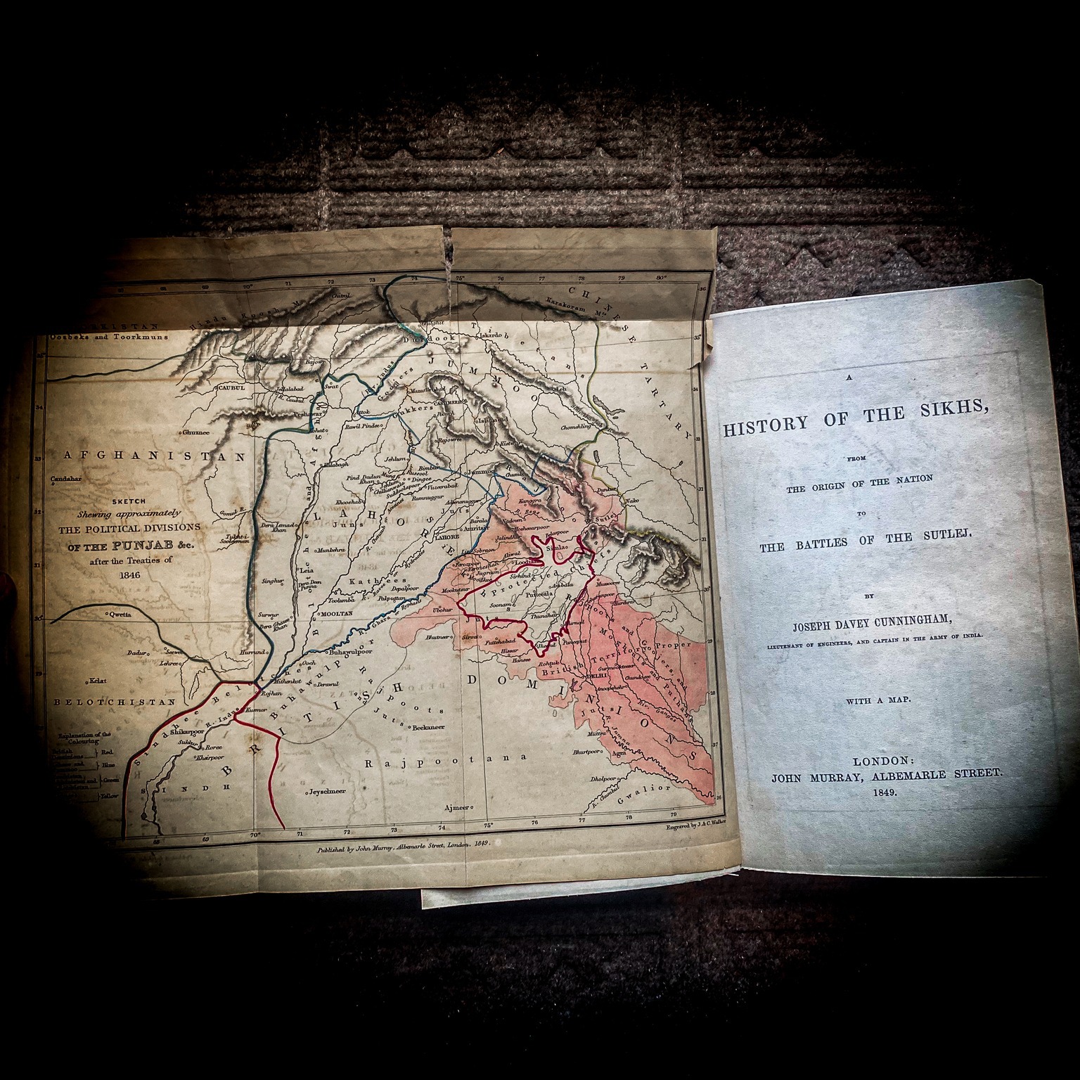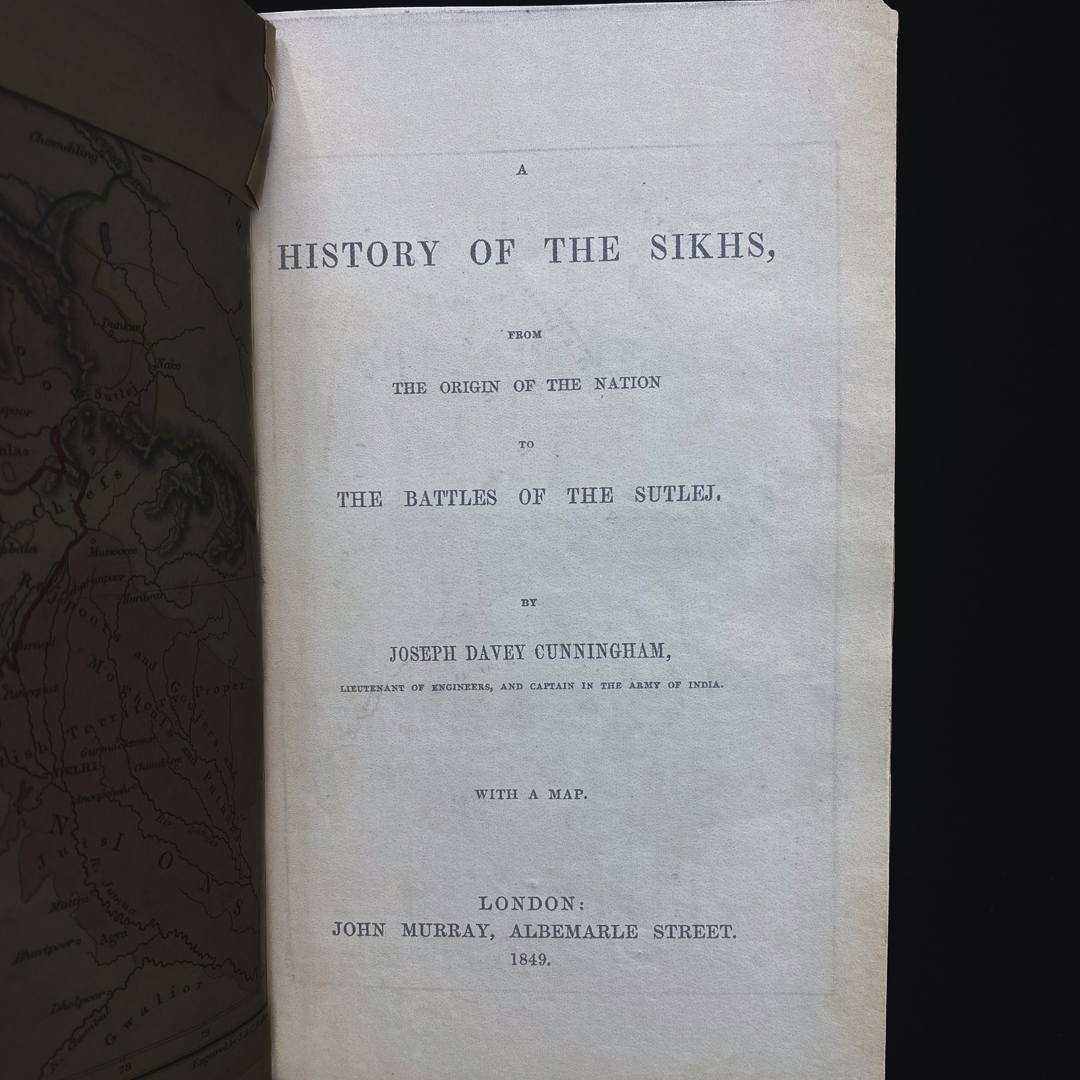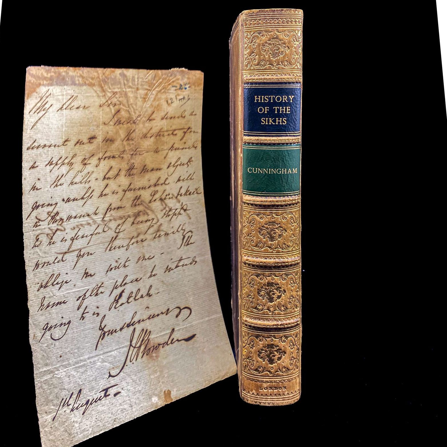 Cunningham (Joseph Davey). A History of the Sikhs, 1st edition, London: John Murray, 1849 Our collection includes Joseph Davey Cunningham's renowned book, "A History of the Sikhs," first published in 1849. It offers a comprehensive understanding of the Sikh nation and their struggles during the Anglo-Sikh War. Cunningham's profound knowledge of Sikh customs and traditions provides invaluable insights. His critique of Sir Henry Hardinge's actions resulted in his dismissal from the political service, highlighting his courage and integrity. Despite its success, the publication marked the premature end of Cunningham's military career. The inclusion of this influential book in the personal library of Douglas McGarel Hogg, 1st Viscount Hailsham, emphasizes its enduring importance beyond law and politics. "A History of the Sikhs" is a treasured resource, allowing readers to explore the Sikh people's historical narrative and appreciate their significant contributions.