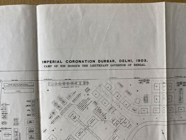 J. Strachey, Major, Private Secretary to H. H. the Lieut. Gov. of Bengal: IMPERIAL CORONATION DURBAR. DELHI, 1903. Camp of His Honour the Lieutenant Governor of Bengal. 18th December 1902. The plan, on a scale of 120 feet to 1 inch, measures 17 x 14½ ins and folds down to 7½ x 6 ins. It shows the layout of the camp in great detail with identification of all the locations and resources printed on it and the list of the occupants and the Staff printed at the right side with a small scale plan beneath, showing the location of the Bengal Camp within the Central Camp area. We have not encountered this plan before and the degree of detail on it suggests it was possibly produced for use by officials rather than visitors.