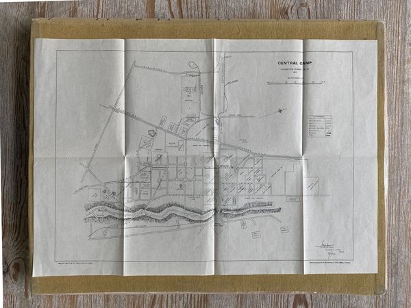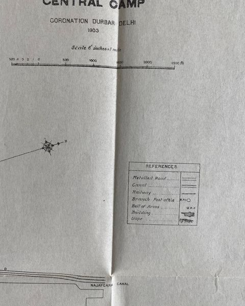 CENTRAL CAMP. Coronation Durbar Delhi 1903. Q.M.G. Photozincographed at the Survey of India Offices [Calcutta] Nov. 1902. A 14 x 21½ ins printed plan on a scale of 6 miles to 1 inch showing the arrangement of tented camps, stabling, etc in detail. One of our secondary illustrations is chosen to show the huge size of the Viceroy’s Camp, another shows a variety of camps from Residents of Mysore & Baroda to Muscat and the Agent to the Governor General in Baluchistan. Other camps identified include: Panjab [ Punjab ], Police, Native Press, Consuls and Press, L.G.G. Bengal, L.G.G. Bombay, L.G.G. Madras, Commander in Chuef, L.G. U.P. Agra & Oudh, A.G.G. Biluchistan, L.G. Burma. N.W. Frontier, Resudent Hyderabad, Resident Baroda, Central Post Office, Imperial Cadet Corps, Electric Light Camp, Viceroy;s Body Guard, Bombay Bpdy Guard, Central Telegraph Office, European Veterans, Native Veterans, Although this is the same plan as is included in the pocket of The Coronation Durbar Dewlhi 1903 Offcial Directory with Maps it has fewer folds, being 7½ x 5¾ when folded, so must have been used elsewhere. A scarce and useful plan.
