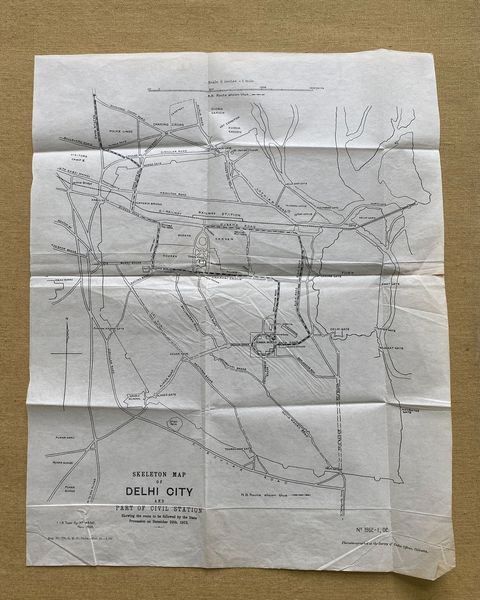 Skeleton Map of Delhi City and Part of Civil Station Showing the route to be followed by the State Procession on December 29th, 1902. Q.M.G.M Photozincographed at the Survey of India Offices [Calcutta] Nov. 1902. A 16¾ x 12½ ins printed map on a scale of 6 miles to 1 inch showing the route taken after the State Arrival by train. It folds down to 9½ x 6 ins. The magnificent procession was composed of a great number of elephants with Indian Princes in their elaborate howdahs, accompanied by colourful retainers, following the lead elephants with the H.E. the Viceroy & H.E. Lady Curzon and T.R.H. the Duke & Duchess of Connaught. Prince Arthur represented his brother, H.I.M. Edward VII who was indisposed but took precedence behind Lord Curzon who was the de facto ruler of India when the King Emperor was absent. A scarce plan showing the route passing a fireworks display near the Jama Masjid.