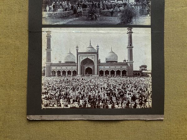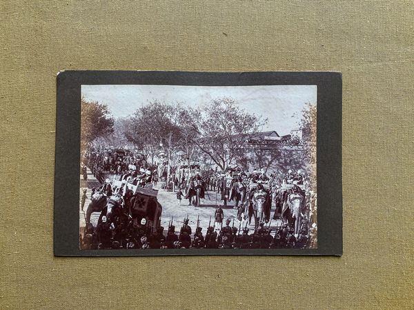 A 8½ x 6 ins photograph on part of an old card album page showing the procession of elephants en route to the amphitheatre at the 1903 Delhi Durbar celebrating the Coronation of the King Emperor Edward VII. The leading five eelphants carry staff officers and other senior officers in thier howdahs. The next two elephants shaded by parasols [a traditional symbol of royalty in India as well as a protection from the sun] carry, in the first H.E. the Viceroy, Lord Curzon and Lady Curzon and in the second the King’s brother, H.R.H. Prince Arthur, Duke of Connaught and the Duchess of Connaught. Lord Curzon takes the prime position as he is the representative of the King Emperor [unable to attend because of his health] who gives away his precedence only to the sovereign. The giant elephants carrying their howdahs were on loan from Indian Princes. The mahouts on the leading elephants wear liveries with the monograms of the Duke and the Viceroy. The reverse shows a crowded scene outside the Jama Masjid mosque in Delhi.