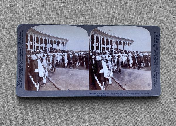 A good stereoscopic card by Underwood and Underwood, New York, London, &c. A view entitled Veterans of the Mutiny (1857) entering the Amphitheatre at the Durbar, Ddelhi. India. This is the 1903 Delhi Durbar. The reverse has two later stereo photos of a garage.