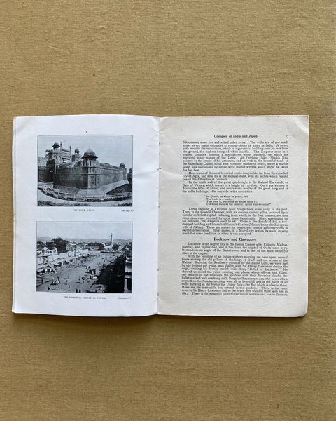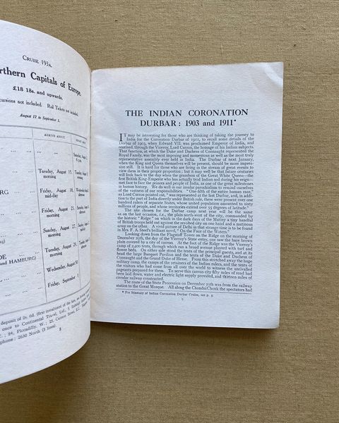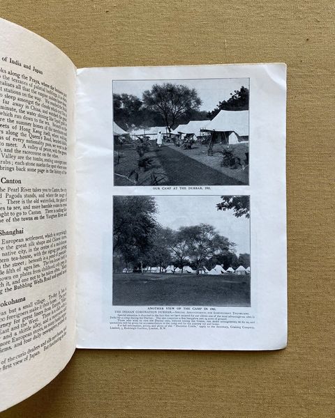 A cruise on R.M.S. Dunottar Castle spending almost all December in India. The Indian Coronation Durbar. A Cruise to India, China and Japan. The Cruising Co. Ltd. [London] 1911. 18 plates of illustrations from photographs, 30pp, iv advertisements. Original printed pictorial paper covers. neat old tape strenthening the spine. The lengthy cruise on R.M.S. Dunottar Castle was planned to travel from London on September 16th via Suez to Ceylon, Singapore, Japan, Hong Kong and Burma to arrive at Calcutta on the morning of 2nd December, leaving after the Durbar on the evening of 25th. The first four pages of text are devoted to a discussion of the 1903 and 1911 Durbars. The cover os clearly based on the elephant processions of 1903.