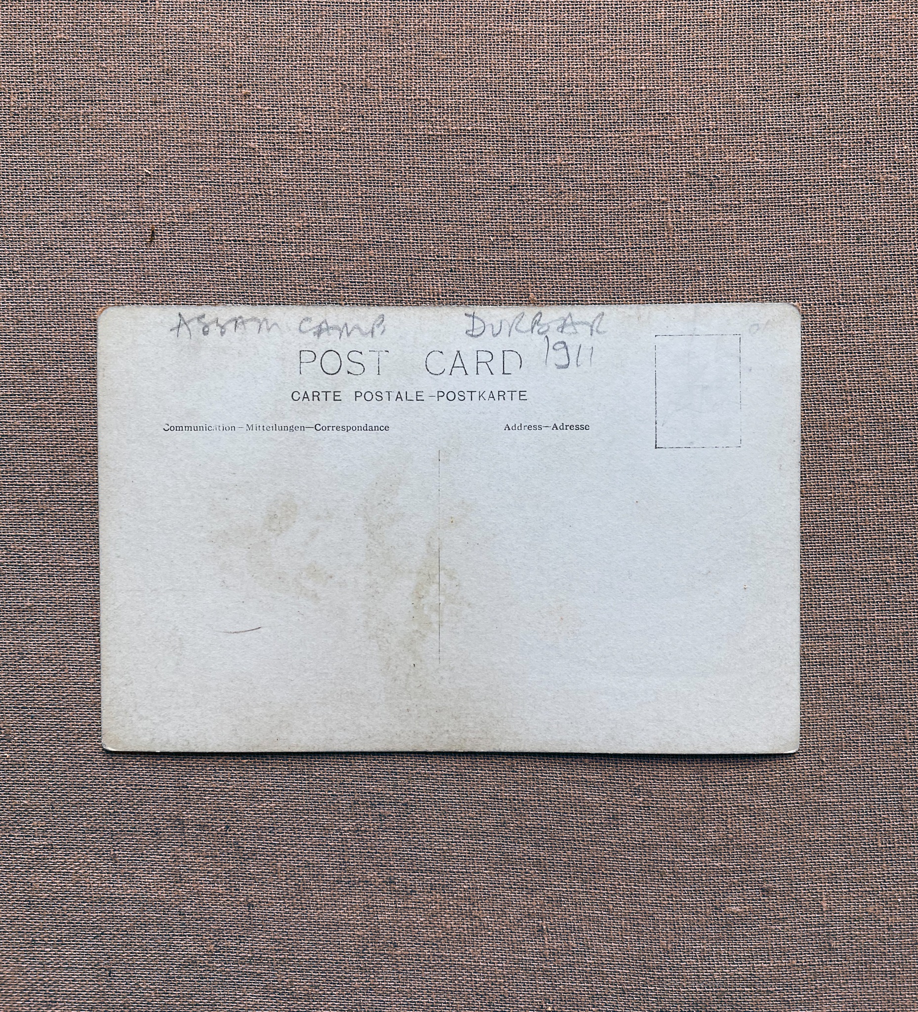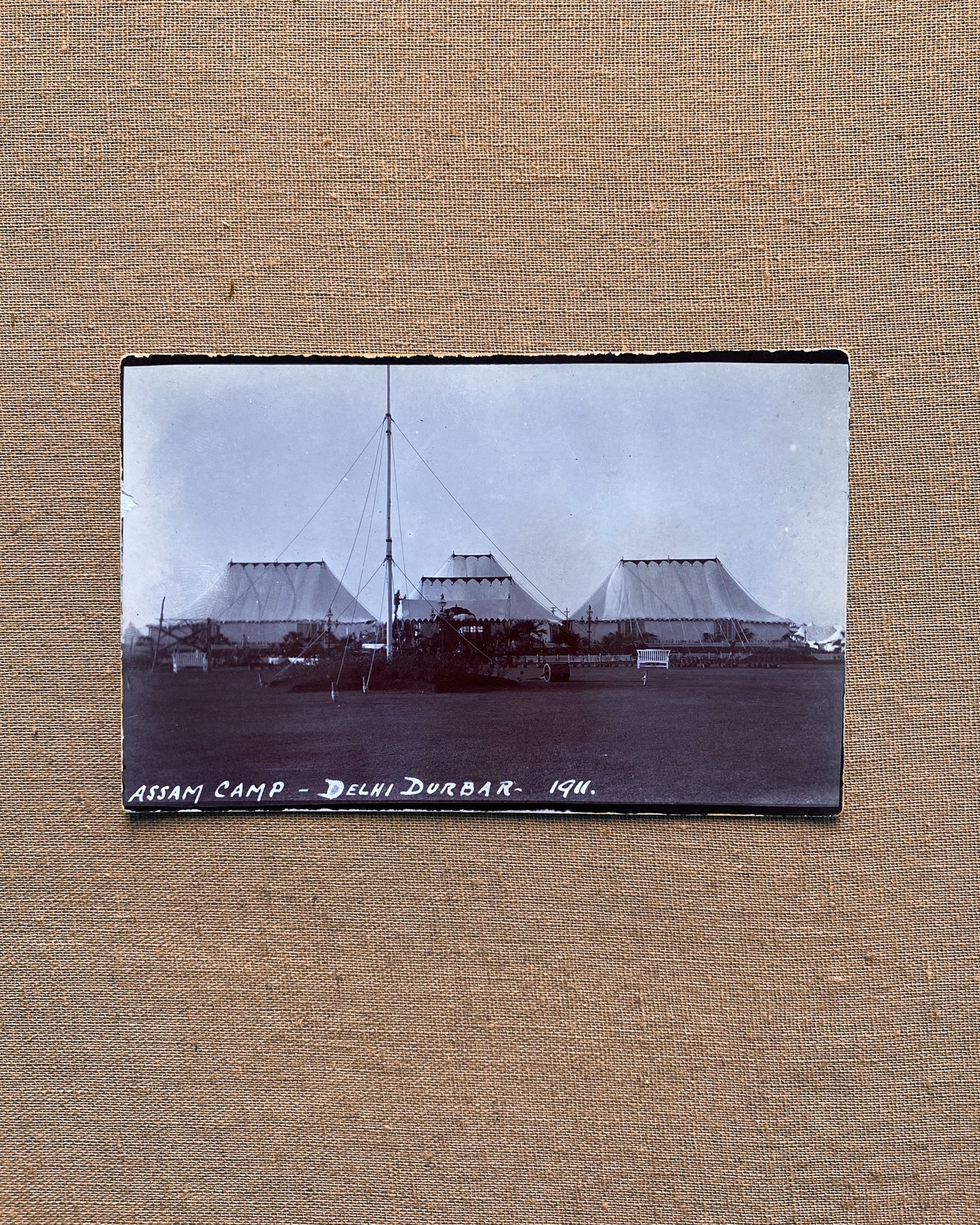 A very good real photograph postcard. The unused card shows three tents of the Assam Camp. Assam was one of the smaller camps but represemting a remote and largely little known area on the northern border with Burma.