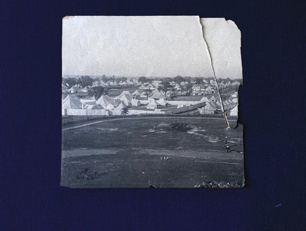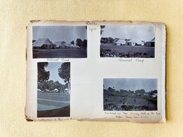 The four 5½ x 3¼ ins snapshot photographs are on one side of an old album page with contemporary manuscript titles in ink . Showing state of the land before Camos were made. The reverse has three similar sized images of camel and bullock carts at Aden where the photographer would have stopped off for re-coaling on the way out to India. The fact that one of the photographs was taken before the camps were finished suggests the photographer had an organisational position A general view of the tented camps A large view of the tented camps in 1903 at the Coronation Durbar marking the accession of the first King Emperor, Edward VII, 9½ x 9 ins.