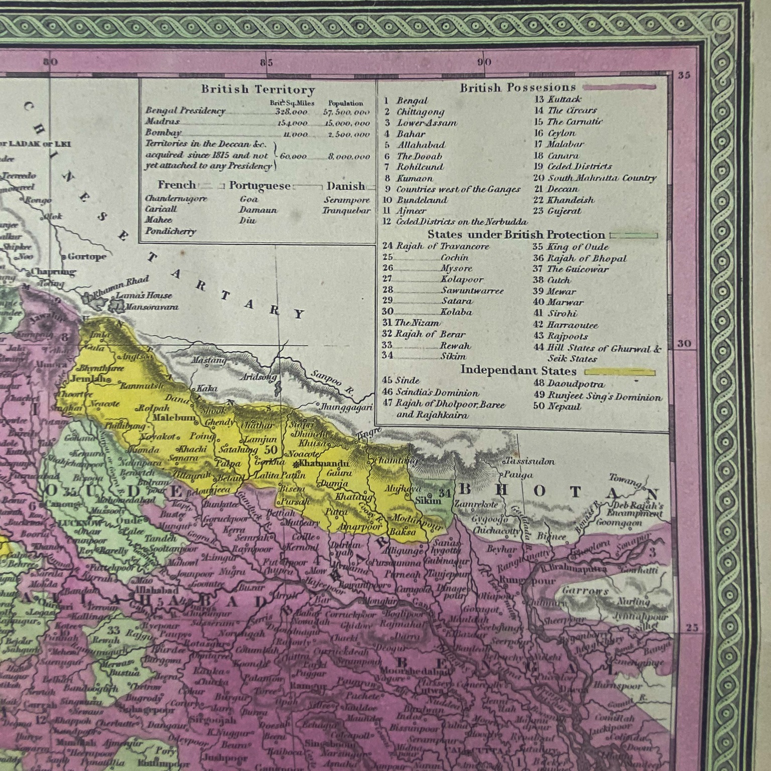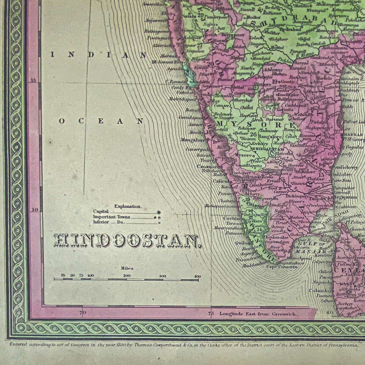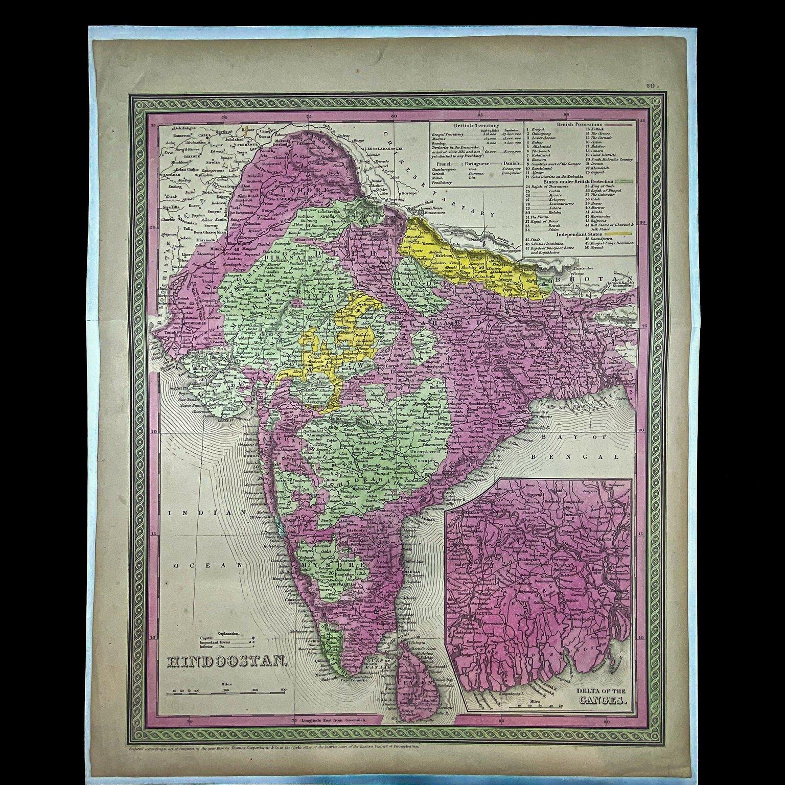 Shows towns, islands, rivers, mountains, gulfs, bays, etc. Large inset of the Delta of the Ganges. Tables exhibits British, French, Portuguese and Danish Colonies and Independent States. This map is from the 1850 Thomas Cowperthwait edition of S A Mitchell's New Universal Atlas. The atlas would become the most popular American atlas between 1834 and 1860, published annually, first by Tanner and later by Mitchell, Cowperthwait, and DeSilver. Tanner's career as a mapmaker began in the early 19th Century. He had a hand in publishing many of the most important American maps of the first half of the 19th Century. His son Thomas and Henry Carey carried His business and flourished until the middle of the 19th Century.