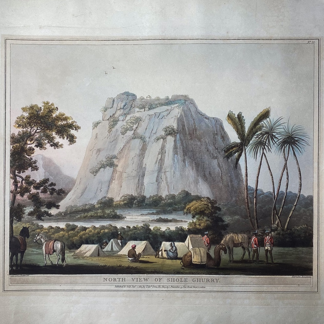 Step into the enchanting landscapes of Mysore with this mesmerizing aquatint engraving! Lieutenant James (after) Hunter's artistry beautifully captures the essence and charm of Shole Ghurry, showcasing the region's picturesque beauty. Published in 1805, this timeless piece continues to evoke wonder and awe, transporting us to a bygone era of natural splendor and cultural richness.