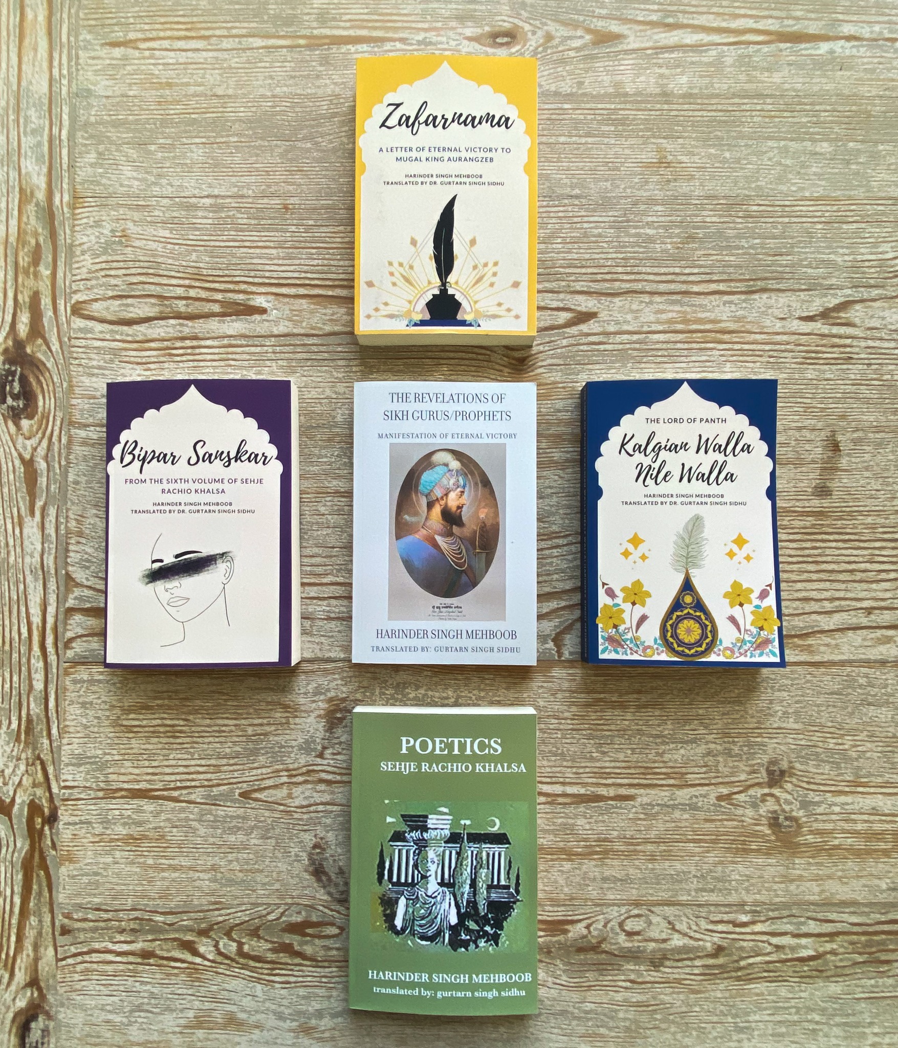 He eventually died of prostate cancer in Gardiwala. Harindar Singh Mehboob has a wife, son and daughter. Translator "I am a retired university professor from Punjabi University Patiala, Punjab,India.Phd. Upon Puran Singh and Walt Whitman.I have read at meditative levels the world epic, sacred poetry, fiction, drama, philosophy and psychology and mythology especially. Now, I am translating in English .Our genius poet Harinder Singh Mehboob with parallel study of world classics." A series of Books written by Harinder Singh Mehboob and translated by Gurtarn Singh Sidhu. Gurtarn Singh Sidhu is one of Harinder Singh's closest friends and confidante's. After Harinder's death, Gurtarn took it upon himself to spread Harinder Singh's message with this book. He translated the entirety of Sehje Rachio Khalsa, and that one giant book was split into smaller parts. This is the fourth in the full series. *The Lord of Panth : Kalgian Walla Nile Walla *The Revelations of Sikh Gurus/Prophets (Manifestation of Eternal Victory) (Sehje Rachio Khalsa) *Zafarnama: A Letter of Eternal Victory to Mugal King Aurangzeb *Bipar Sanskar *Poetics : Sehje Rachio Khalsa