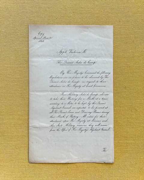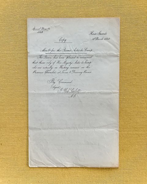 Here's a fascinating archival piece from the collection of General Sir Peter Stark Lumsden - a printed Special Memorandum entitled "Appd Victoria R. The Queen's Aides de Camp" on a four-page bifolium, setting out the duties, rotas, and more of an ADC, dated March 18, 1864. Accompanying this memorandum is a blue paper bifolium written on the first side only in a secretarial hand, addressed from HORSE GUARDS, S.W., dated June 21, 1870, addressed to Colonel Lumsden, C.S.I., Bengal Staff Corps, Quarter Master General, Bengal, and signed by W. Paulet, A.G. (General Lord William Paulet, Adjutant General). This archival piece provides a glimpse into the instructions and duties of Queen Victoria's Aides de Camp in the 1860s, and the document is beautifully preserved. The piece comes from a large archive of the General's papers passed down through descendants of his brother, General Sir Harry Lumsden. General Sir Peter Stark Lumsden had a distinguished career in India, China, and Afghanistan and was made G.C.B. and an ADC to Queen Victoria.