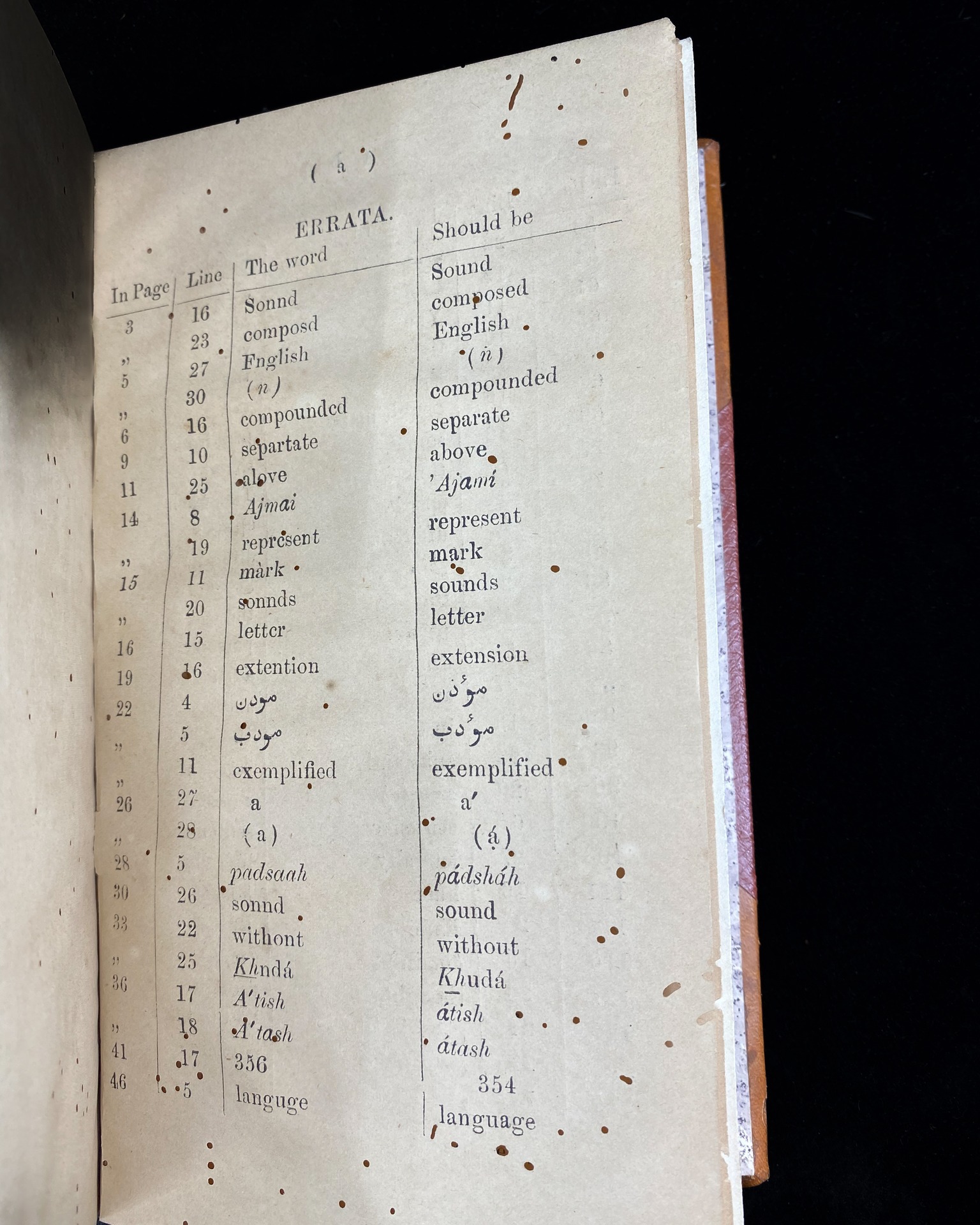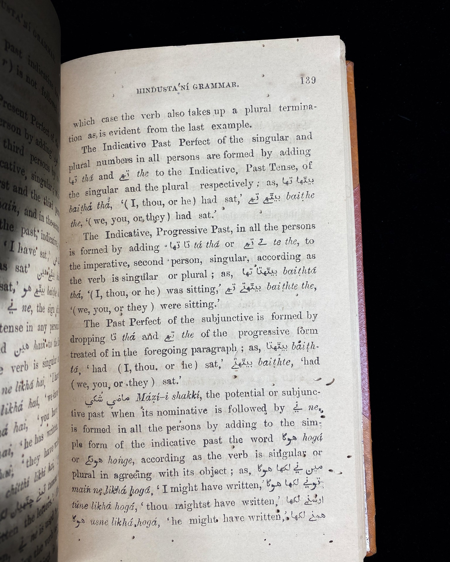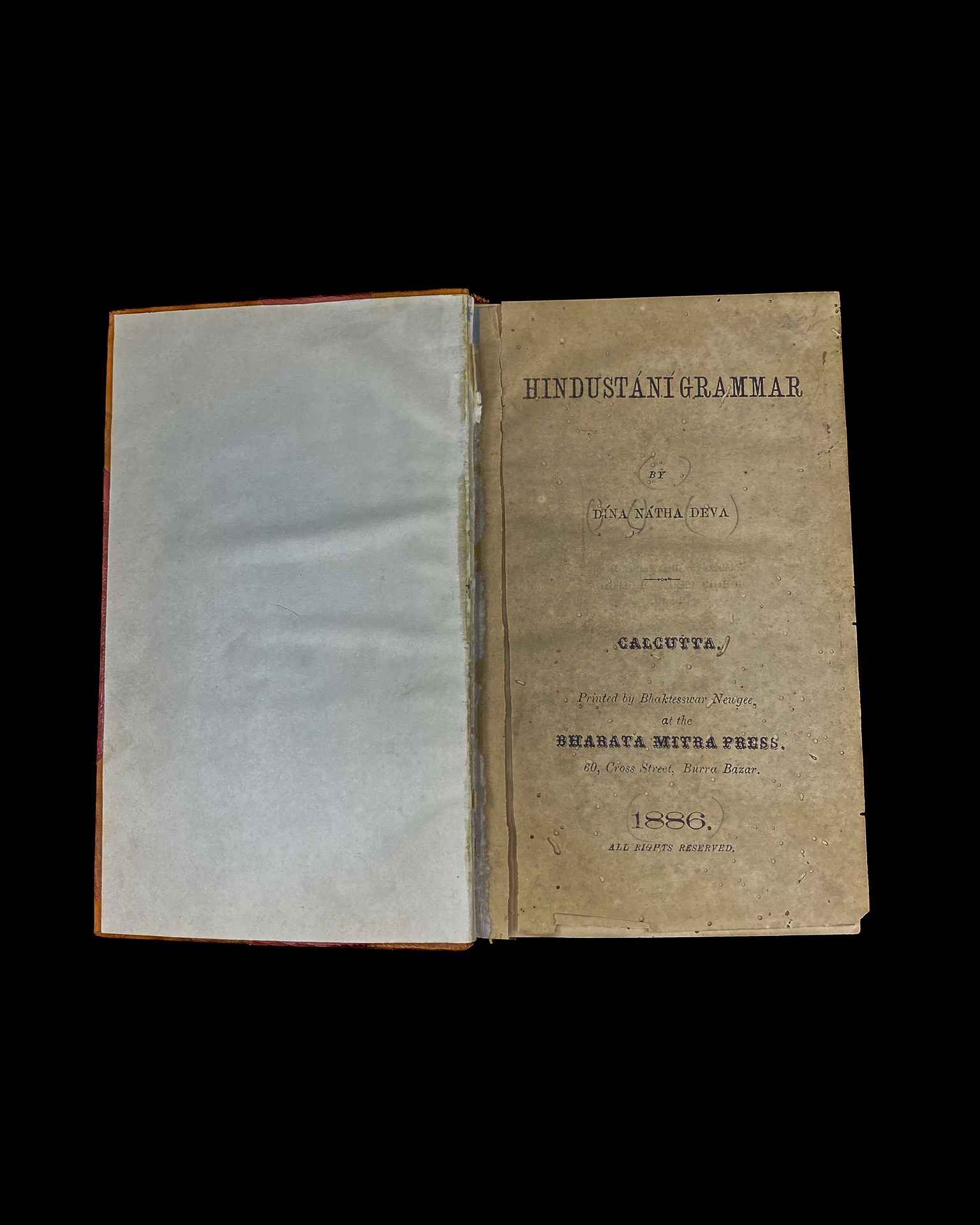 Hindustani Grammar by Deva, Dina Natha DEVA, DÍNANÁTHA: Hindustání Grammar. Part I (all publ.) Calcutta, printed by Bhaktesswar New gee at the Bharata Mitra Press, 60 Cross Street, Burra Bazar, 1886. First edition. Dedicated to Alfred Woodley Croft, Director of Public Instruction in Bengal. Comprises the orthography, the etymology, and the syntax of Hindustani.