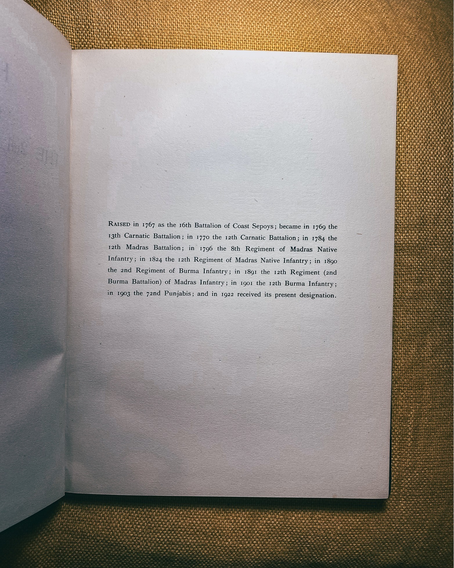 1767: Raised as the 16th Battalion of Coast Sepoys 1770: Renamed the 12th Carnatic Battalion 1784: Transformed into the 14th Madras Battalion 1896: Became the 5th Regiment of Madras Native Infantry 1824: Assumed the title of the 12th Regiment of Madras Native Infantry 1890: Adopted the name 2nd Regiment of Burma Infantry 1891: Merged as the 12th Regiment (and Burma Battalion) of Madras Infantry 1901: Transformed into the 12th Burma Infantry 1922: Received its present designation as the 3rd Battalion 2nd Punjab Regiment