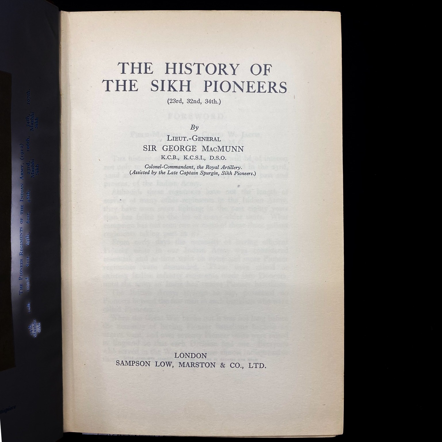 History of the Sikh Pioneers (23rd, 32nd, 34th) Author: MacMunn, George Publisher: Sampson Low, Marston, London The History of the Sikh Pioneers (23rd, 32nd, 34th)" is an invaluable book written by Lieutenant-General Sir George MacMunn. Published in London by Sampson Low, Marston and Co. in approximately 1936, this comprehensive work provides a meticulous account of the illustrious Sikh Pioneers regiment. With a colored frontispiece and 44 black-and-white illustrations, the book presents a captivating exploration of the regiment's formation, campaigns, and significant contributions throughout its service. Organized into twenty-two chapters, the book delves into various topics including the origins of Sikh pioneers, their presence in Delhi, their involvement in the Afghan War and its concluding phases, as well as their participation in the World War.