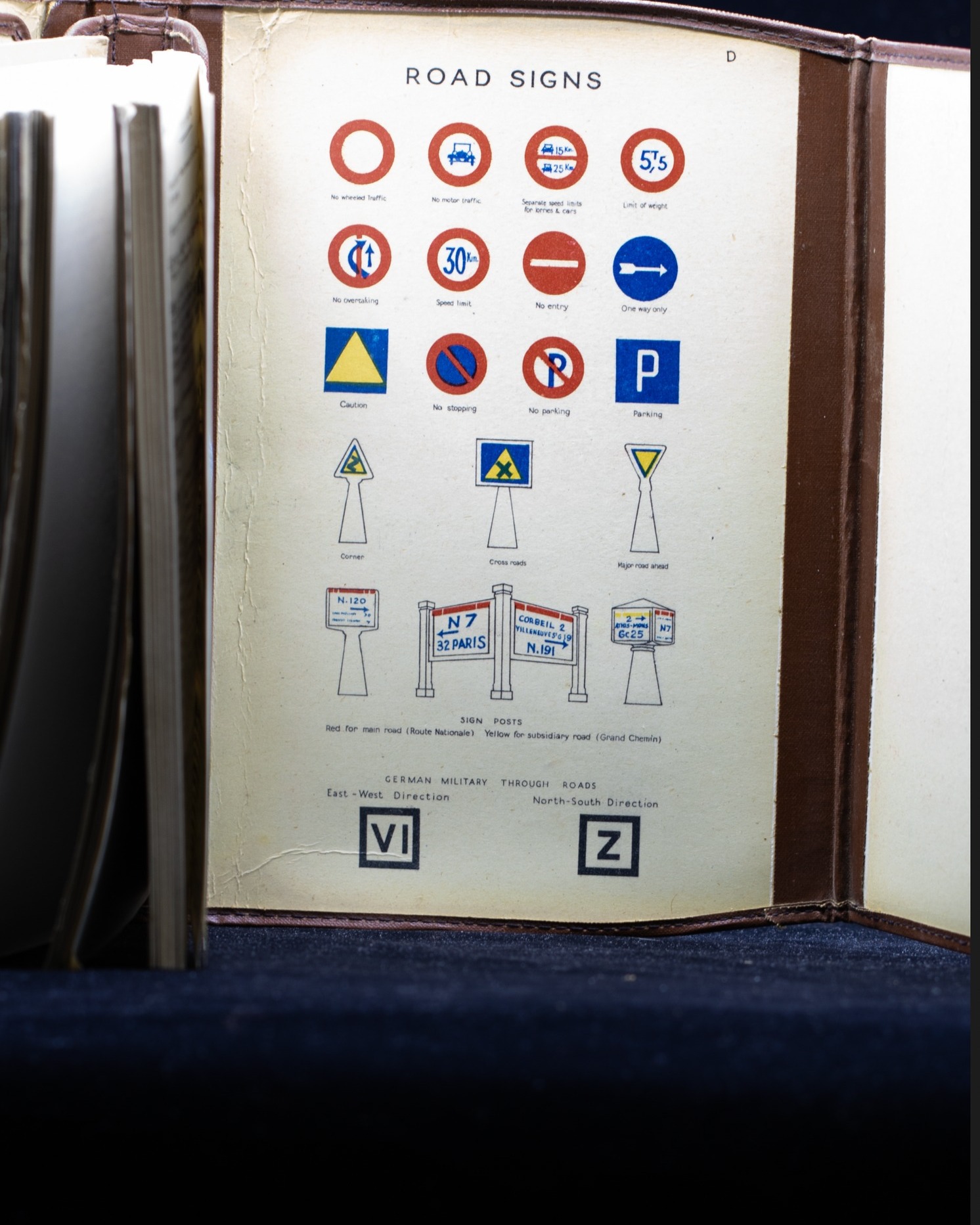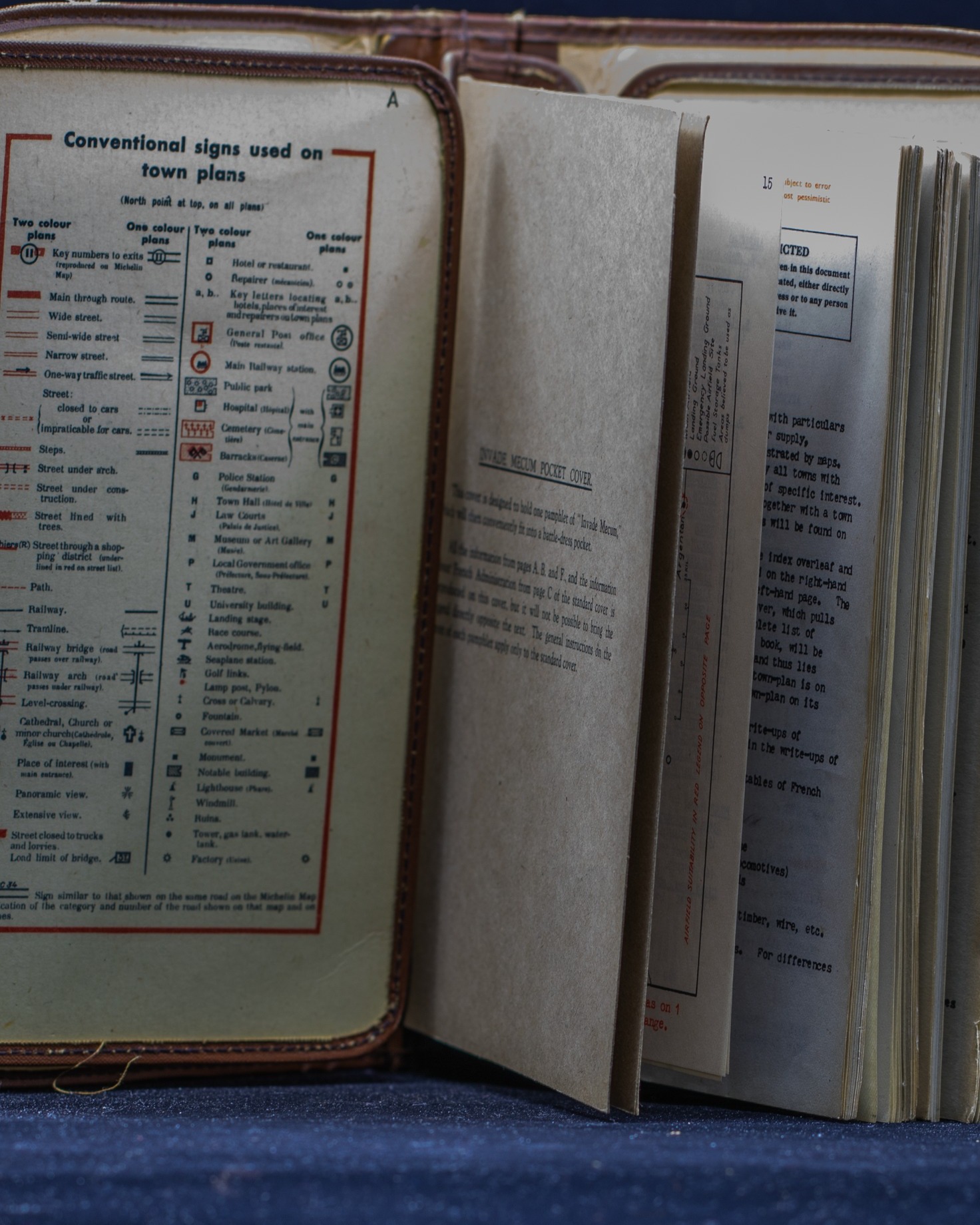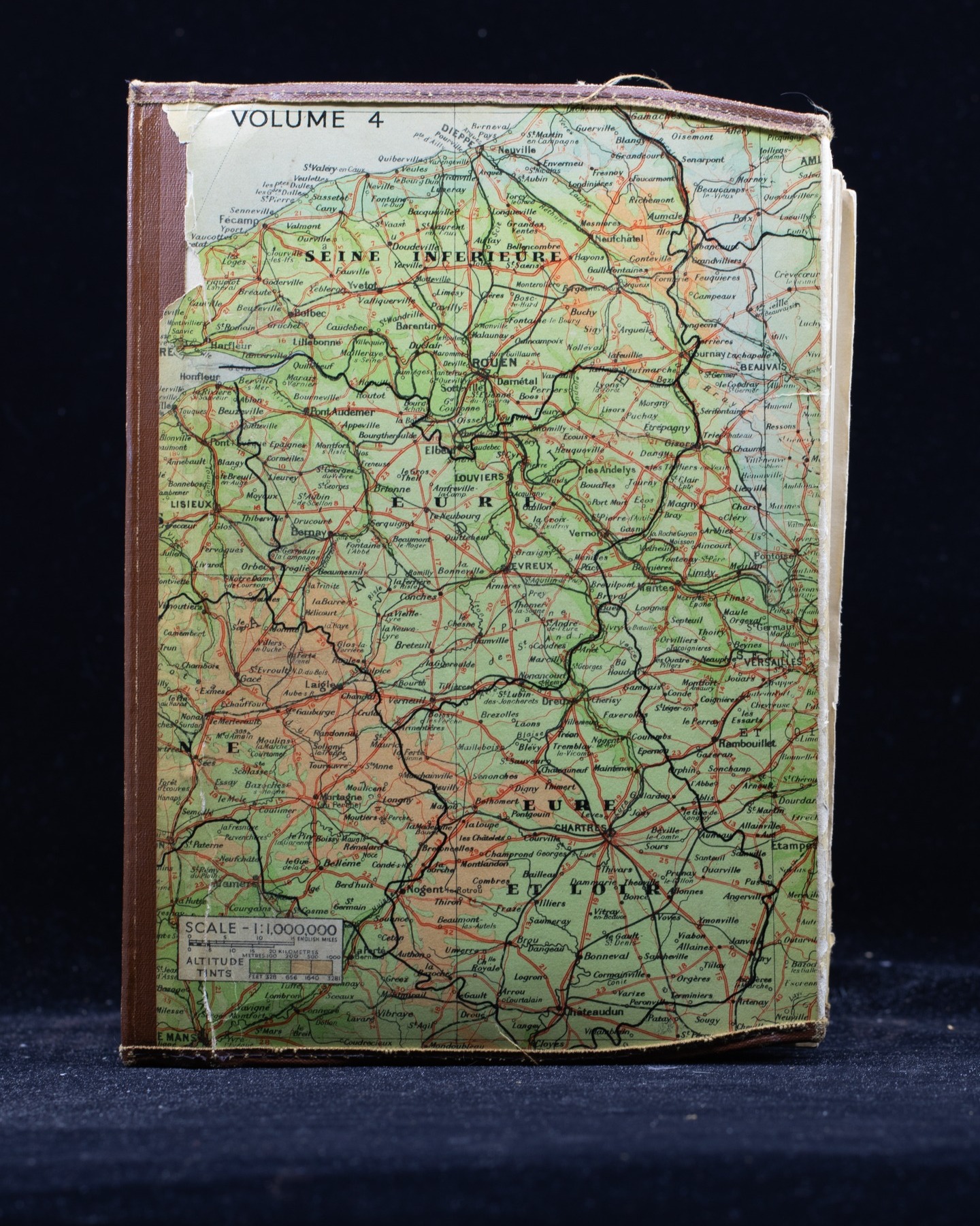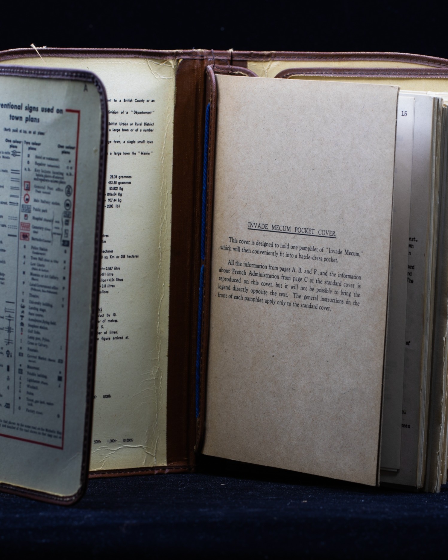 An excessively rare D-Day relic, Canham's copy of the INVADE MECUM VOL-4 1-MANCHE, a crucial military : undoubtedly carried with him as he and his men stormed Utah Beach on June 6, 1944. This restricted public which are waterproofed maps of northern France from Cherbourg and Rennes to Amiens, Paris and Chateau British intelligence organizations, includes maps and vital details of every town and city to be found in Normincluding locations for billeting troops, water sources, available mechanics,electricity sources, slaughterhous communications, and the local authorities. Maps include the location of bridges, hospitals, and principal stret waterproofed, bear definitions of abbreviations, a key to the maps, conversion tables, etc. Canham has written the first page. during the invasion - if Canham and his forces had advanced ten or twenty miles the first day, this important Map was a great help. up with him. From Canham's estate