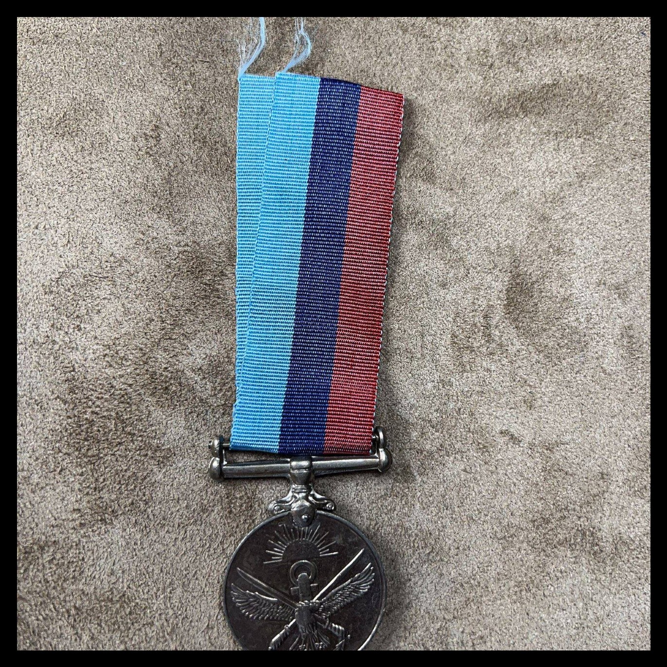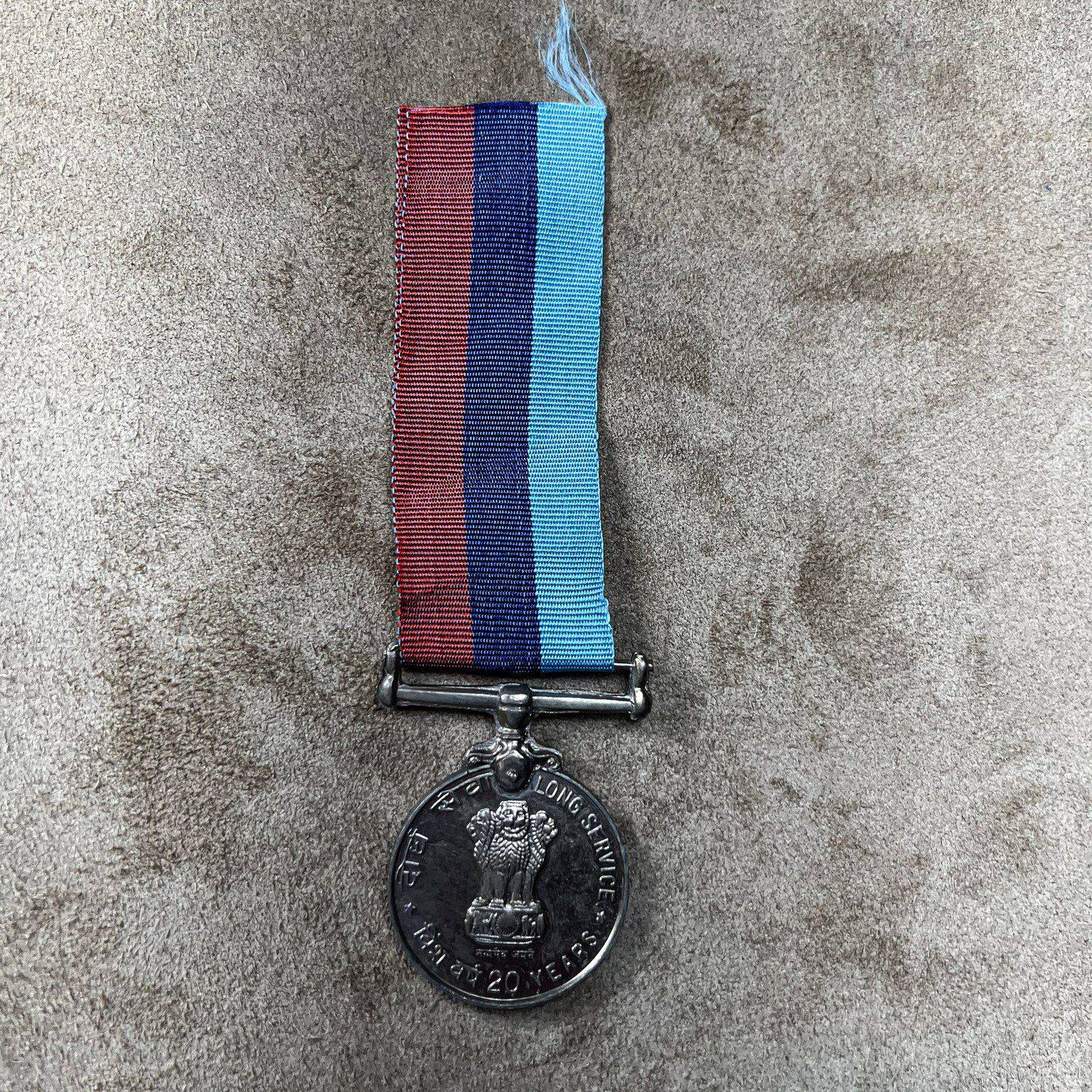 Named- 14468704 HAVILDAR ( Sergeant ) R. P. SINGH ARTILLERY Awarded to all armed services personnel for twenty years of service. Established: 19 April 1971 by the President of India (Gazette of India Not. No. 25-Press/71). Obverse: Circular 35-mm copper-nickel, with the national emblem in the center, surrounded by the legend above "Dirgh Seva [Hindi] / LONG SERVICE" and, below, "Bis varsh [Hindi] / 20 YEARS". Suspended by a non-swiveling straight-bar suspender. \ Reverse: A depiction of the joint armed services emblem of crossed swords, anchor, and eagle with a rising sun above. Ribbon: 30 mm, equal stripes of red, dark blue, light blue. Red, 10 mm dark blue 10 mm, light blue 10 mm.