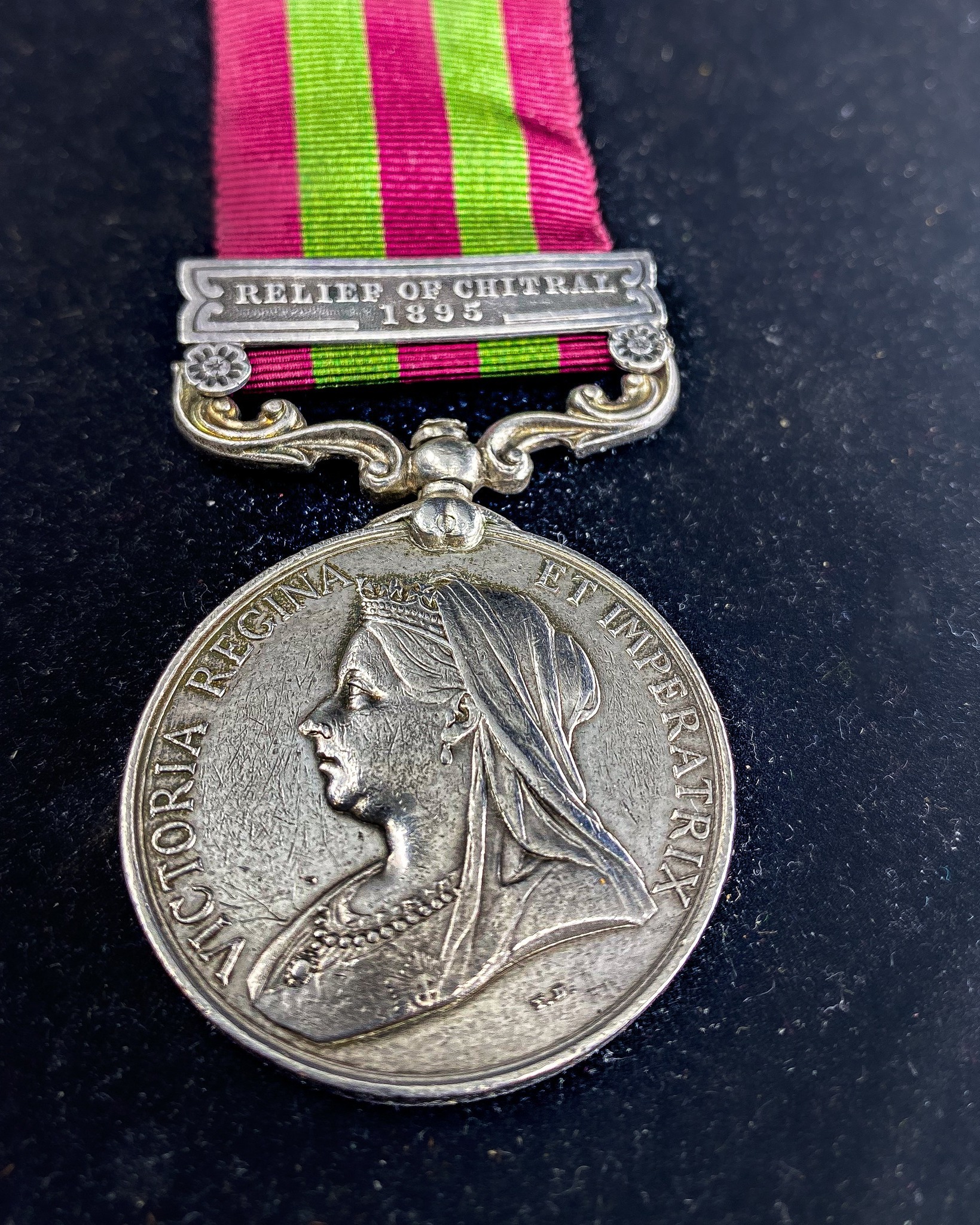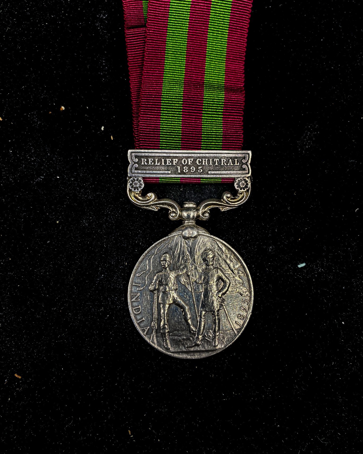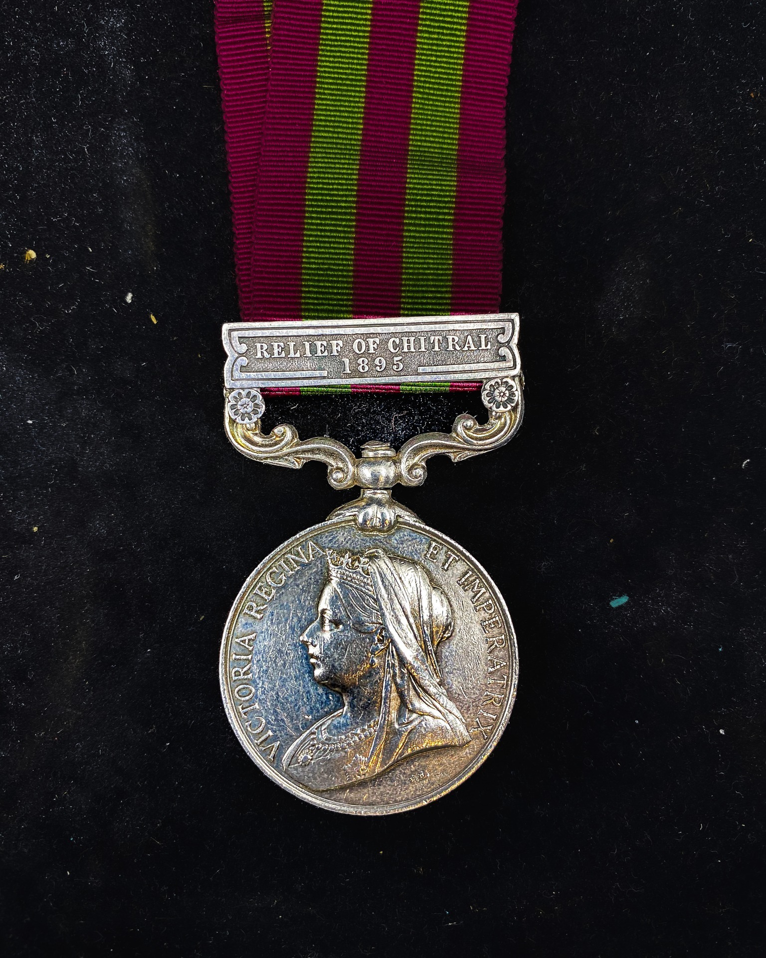 India General Service Medal 1895-1902, 1 Clasp: Relief of Chitral 1895 awarded to Sepoy Prataph Singh, 14th Sikhs,British Indian Army who was present during the operations leading to the Relief of Chitral which lasted from 7th March - 15th August 1895. Description: Issued in silver and bronze, 36mm diameter with a swivelling ornate suspender . Obverse; (two types) First type, the veiled and crowned bust of Queen Victoria and the legend VICTORIA REGINA ET IMPERATRIX. The second type has the bust of Edward VII in field marshal's uniform and the legend EDWARDVS VII REX IMPERATOR . Reverse depicts an Indian and British Soldier supporting a Flag. "INDIA 1895" N is inscribed around the lower half of this scene.