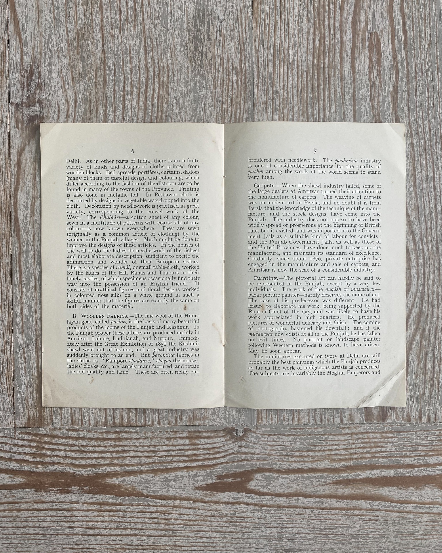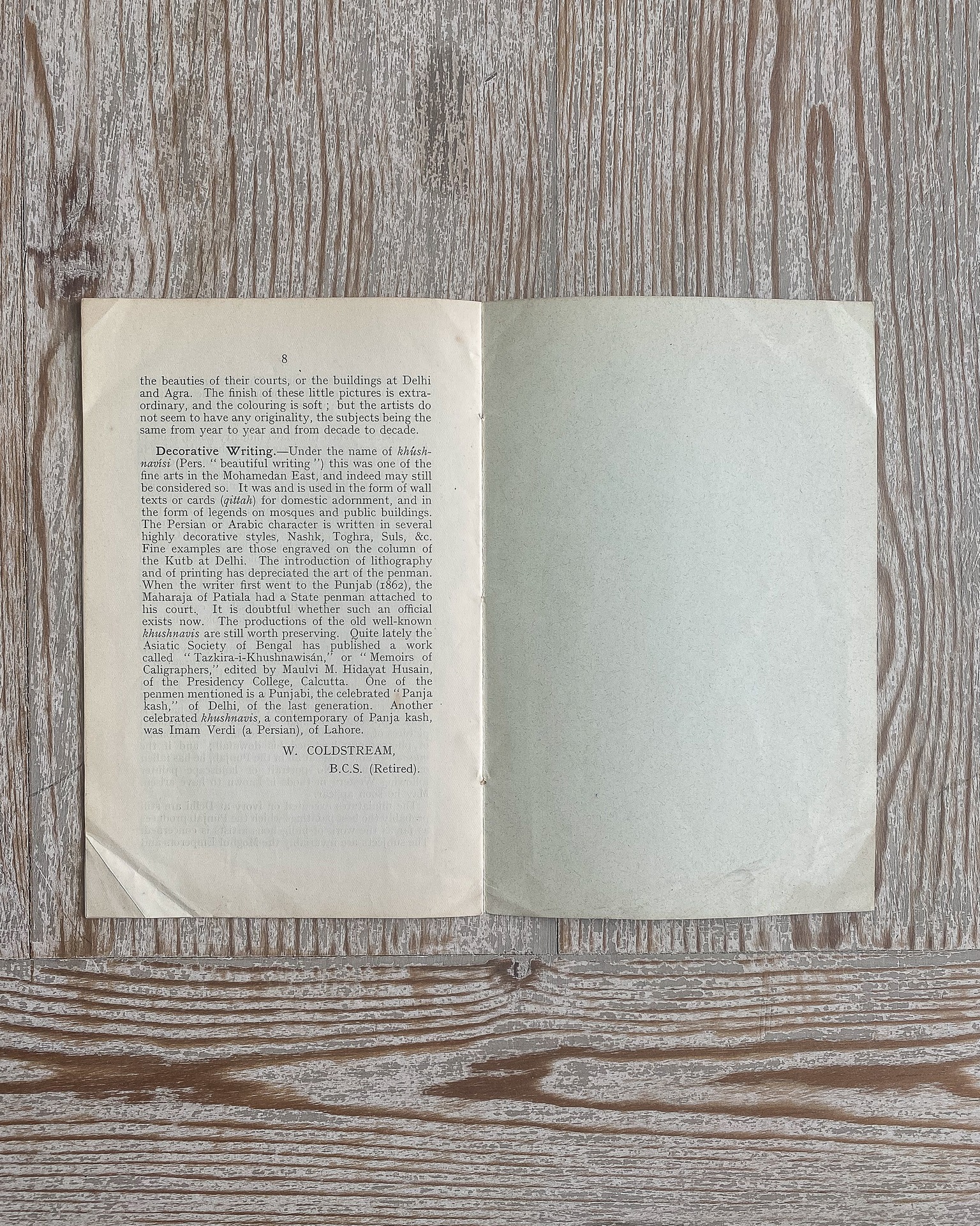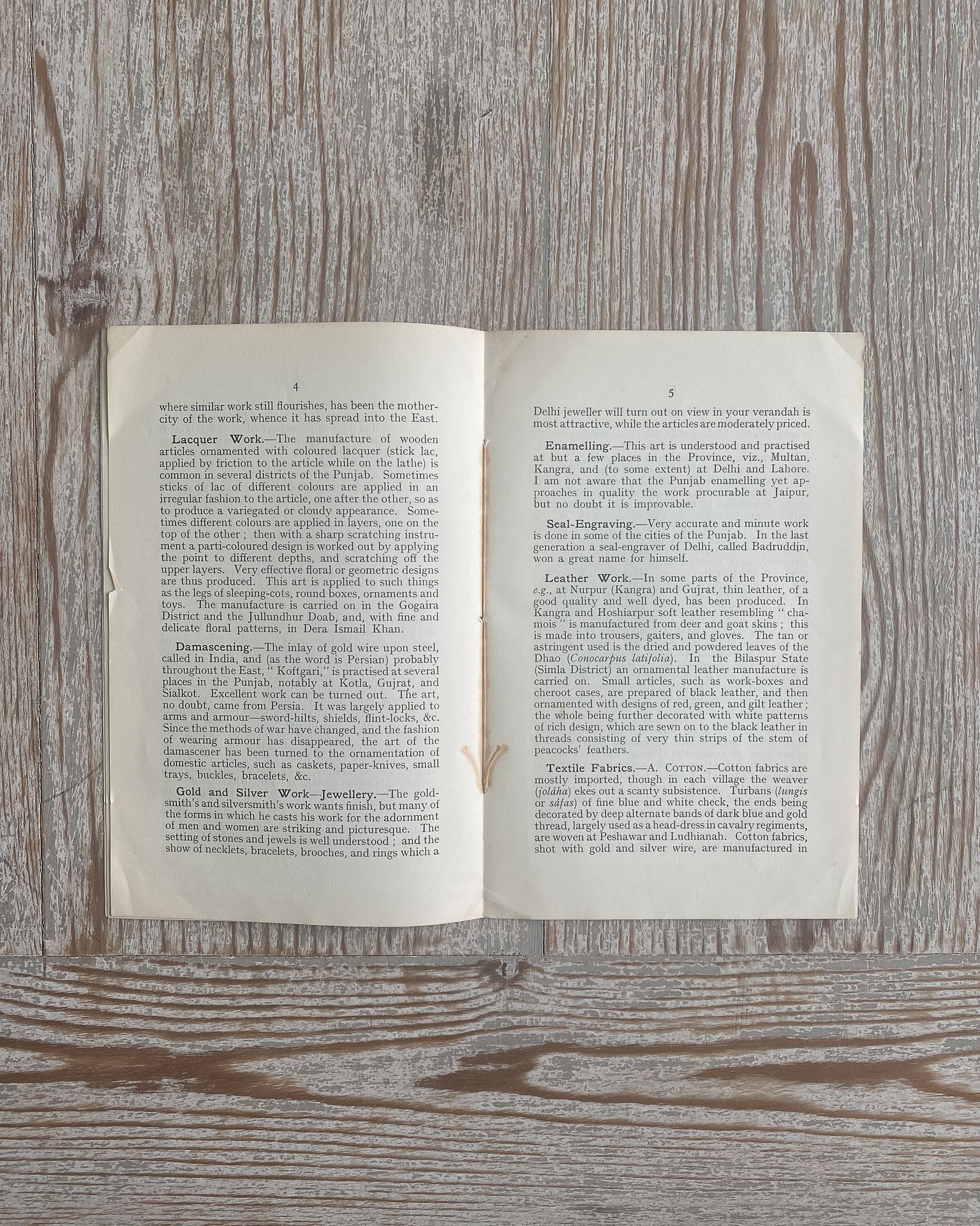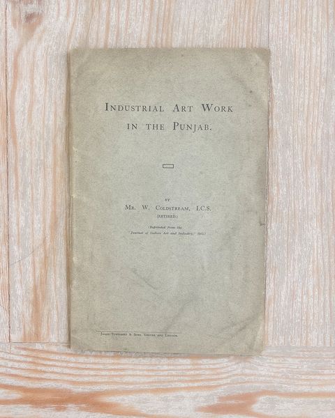 Industrial Art Work in the Punjab W. Coldstream Published by James Townsend & Sons, Exeter and London, 1912 A very scarce pamphlet of W. Coldstream's article on Punjabi art, originally published in 'Journal of Indian Art and Industries' Reprinted from the 'Journal of Indian Art and Industry'.Very scarce.An article by Mr W. Coldstream discussing the industrial art work in Punjab.In the article Coldstream looks at many of the prominent artistic mediums of Punjab, briefly describing their native style. Such mediums discussed in this work include pottery and ceramics, woodwork, lacquer work, gold and silver work, textiles, leather work, enamelling, painting, and more.'Journal of Indian Art and Industries' was a popular journal published between 1886 and 1916.