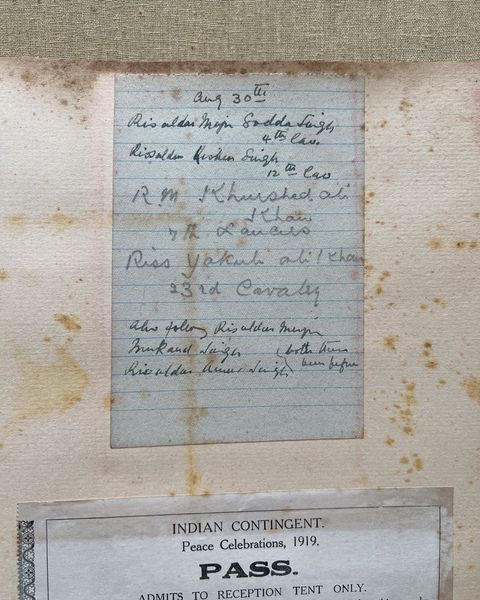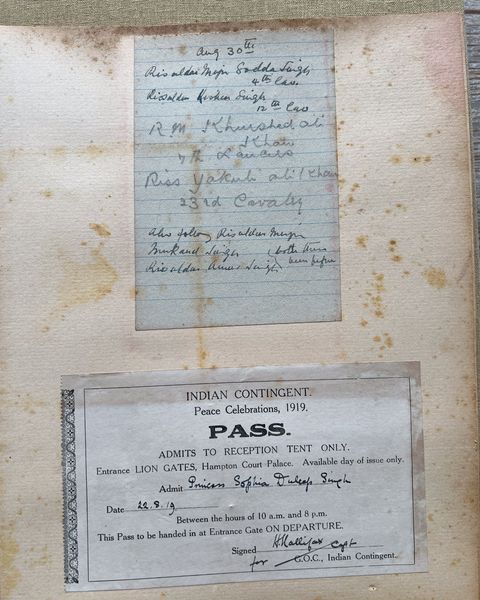 Embark on a captivating journey through history as we unveil an exclusive artifact! It's a copy of the personal invitation pass to the Indian Contingent celebration, extending a gracious invite to Princess Sophia Duleep Singh. This precious pass unlocks the gates to the Peace Celebrations at Hampton Court Palace. Step back in time and witness this remarkable piece of our shared heritage! ✨🏰📜 In a second-hand note written by Sophia Duleep Singh, the names of the esteemed officers are revealed: Risaldar Sada Khan (4th Cavalry) Risaldar Kishen Singh (12th Cavalry) Risaldar Major Khursheed Ali (7th Lancers) Risaldar Yakub Ali Khan (23rd Cavalry)