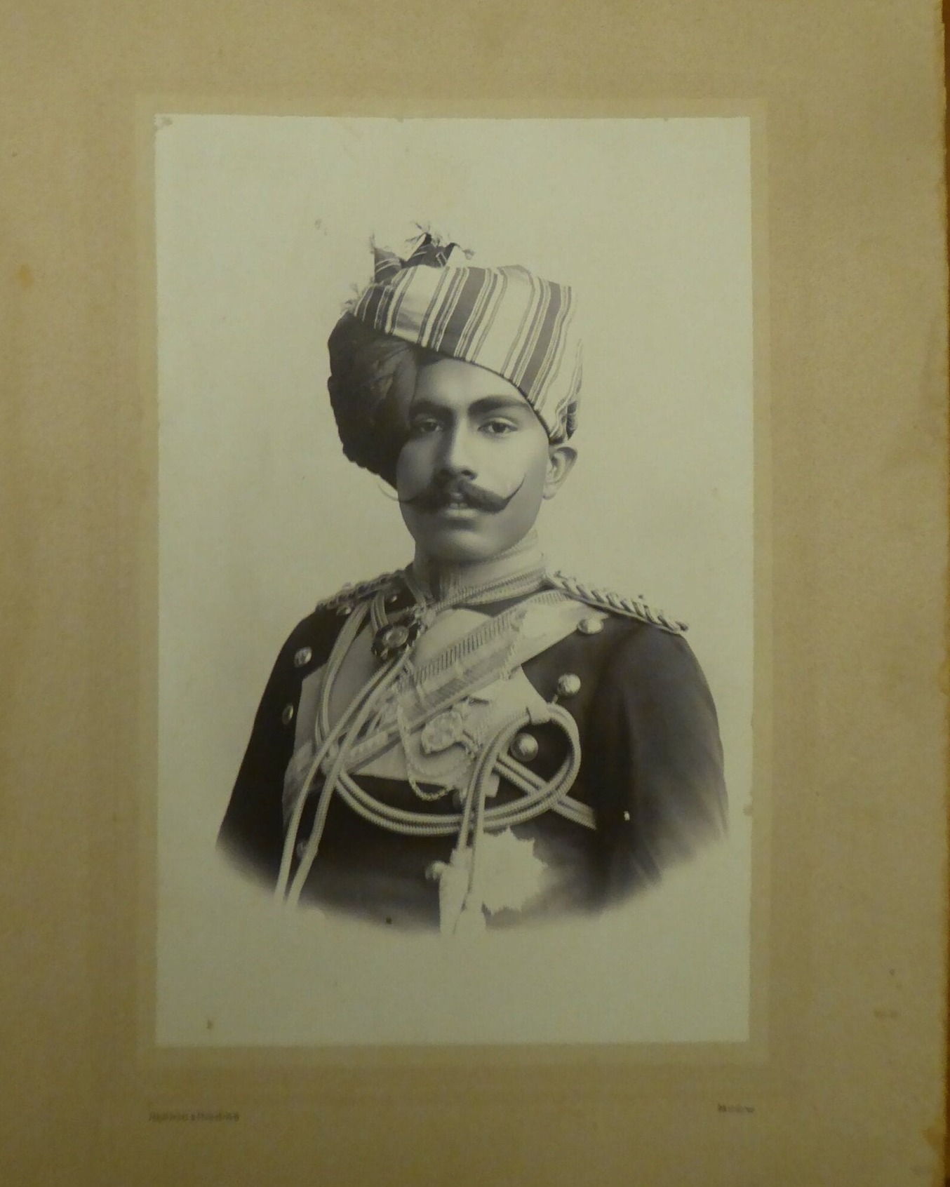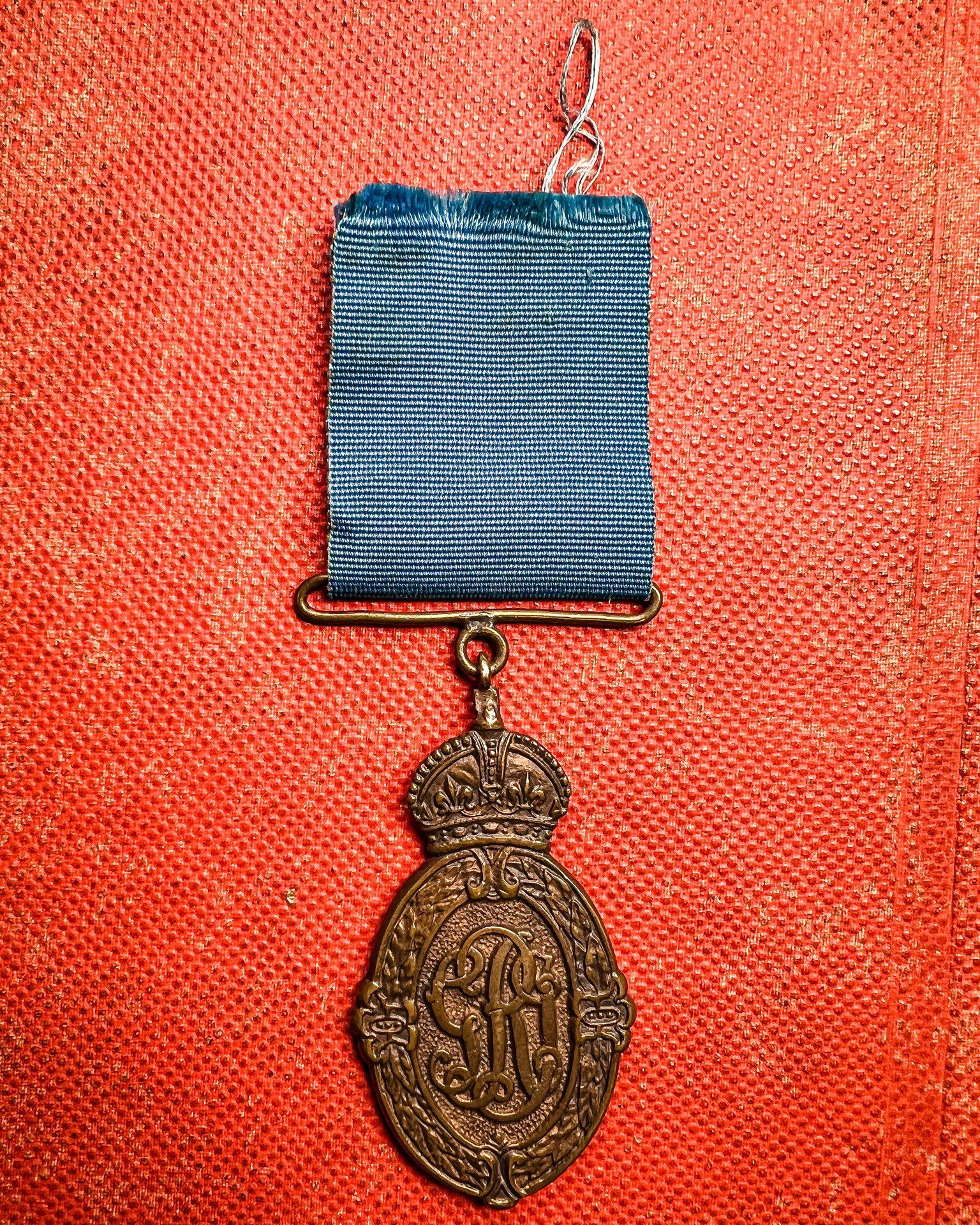 The Kaisar-i-Hind Medal was introduced by Queen Victoria in 1900 to reward public service in India carried out by people of all races and it was initially issued in gold or silver. During the reign of George V the size of the medal was reduced and this example is of the new 3rd class bronze issue, 60 x 32mm. Although called a medal it is classified as a decoration, taking precedence just aftr the Orders of British India and Burma. Originally the medal was issued with a small decorative bar at the top of the ribbon but in this case it is missing. One of our illustrations shows Maharaja Sir Ganga Singh of Bikaner wearing his large gold version.