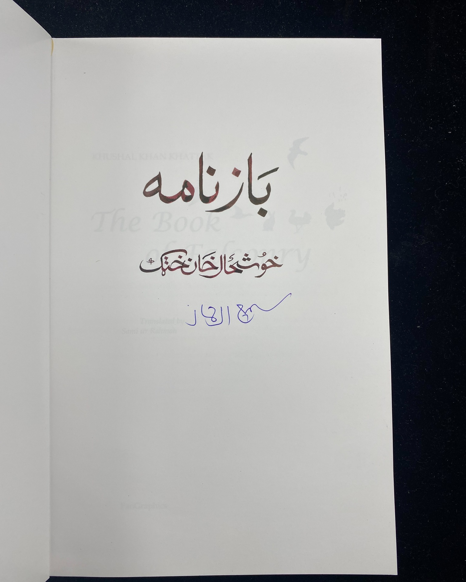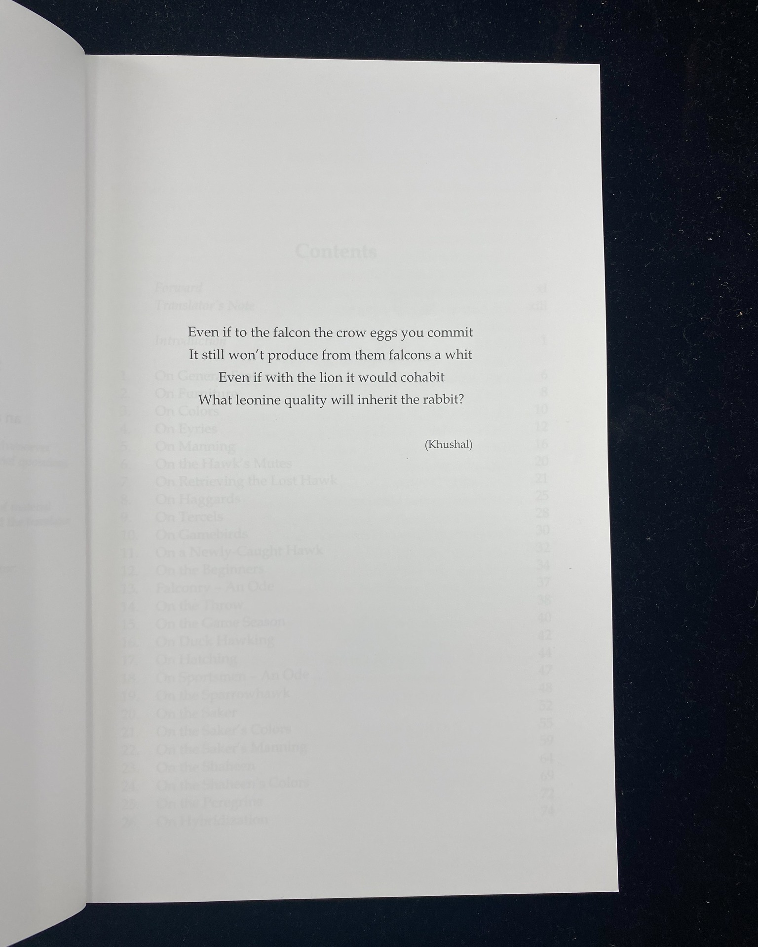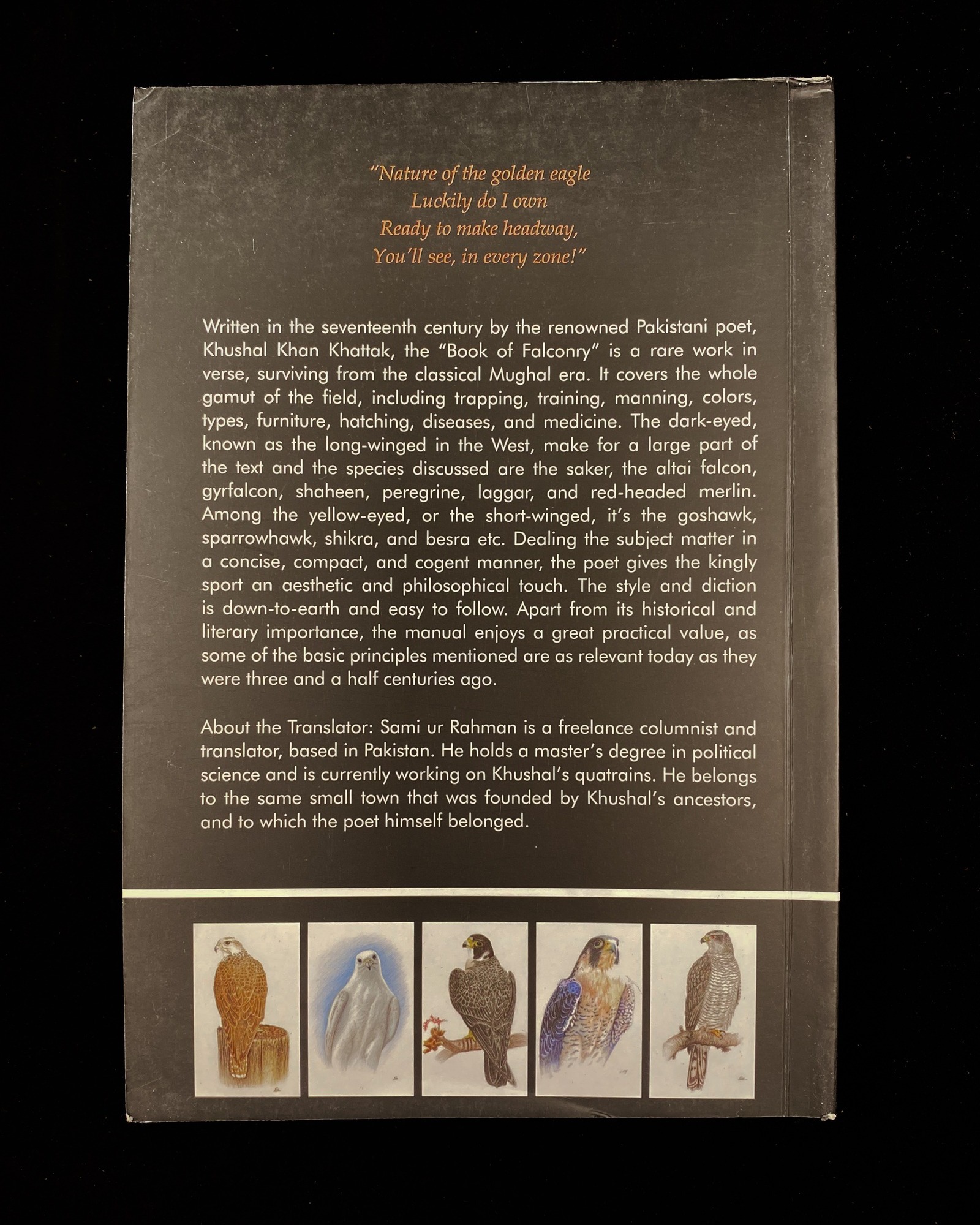 He died at the age of seventy-six. As per his will, his body was brought to his hometown, Akora Khattak, and secretly buried in a place where, in his own words, “the dust of the Mogul cavalry’s hoofs could not light upon my grave.” Khushal Khan Khattak wrote this book in Pashto, the main language of Afghanistan and northern Pakistan, and it is one of the greats of Pashto literature. The Book of Falconry is a manual of falconry written in verse, and is here translated into English by Sami ur Rahman. It "is a rare work in verse, surviving from the classical Mughal era. It covers the whole gamut of the field, including trapping, training, manning, colours, types, furniture, hatching, diseases, and medicine. The dark-eyed, known as the long-winged in the West, make for a large part of the text and the species discussed are the saker, the Altai falcon, gyrfalcon, shaheen, peregrine, laggar, and red-headed merlin. Among the yellow-eyed, or the short-winged, it is the goshawk, sparrowhawk, shikra, and besra, etc. Dealing with the subject matter in a concise, compact, and cogent manner, the poet gives the kingly sport an aesthetic and philosophical touch. The style and diction is down-to-earth and easy to follow. Apart from its historical and literary importance, this manual enjoys a great practical value, as some of the basic principles mentioned are as relevant today as they were three and a half centuries ago."