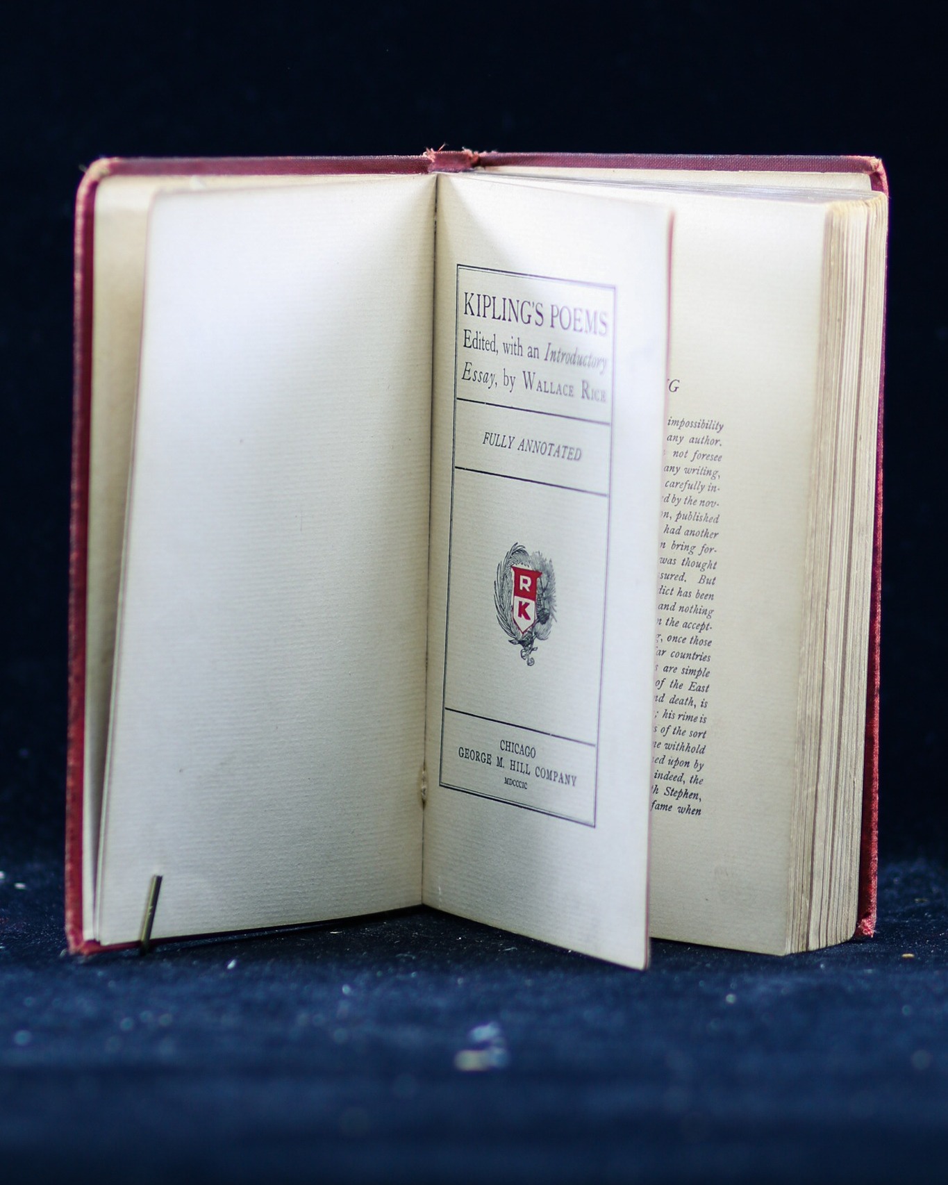 Edited, with an Introductory Essay, by Wallace Rice. KIPLING, Rudyard. First edition, second issue of Wallace Rice’s anthology of Kipling’s poems. Octavo, original cloth, frontispiece portrait of Kipling. Fully annotated, index of first lines. In near fine condition. English journalist, short-story writer, poet, and novelist Rudyard Kipling's major works include The Jungle Book (1894), Kim (1901) and many short stories and poems. Kipling was born in India, which inspired much of his work and his innovative stories for children have become timeless classics. Kipling was one of the most popular writers in the British Empire, in both prose and verse, in the late 19th and early 20th centuries and was awarded the Nobel Prize in literature in 1907.
