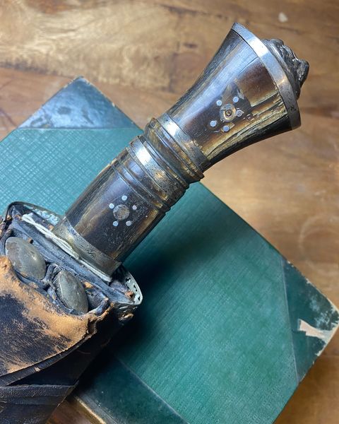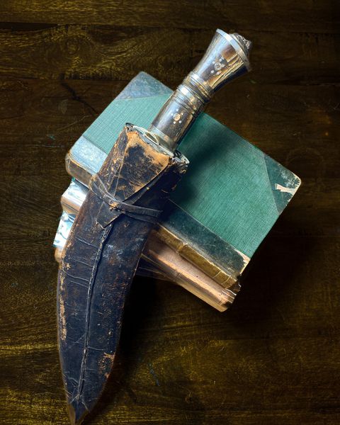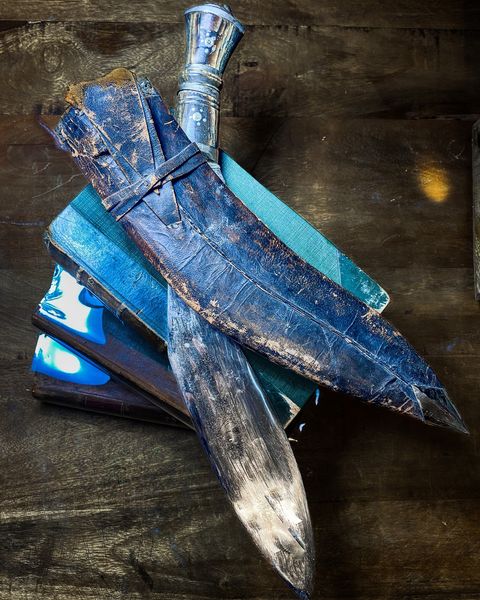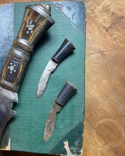 Curved Kukri, bright blade. With hand engravings on the blade Wood stacked handle with Lion head pommel. Leather wrapped scabbard with two 3.5" mini kukri knives. The kukri is a type of machete is traditionally associated with the Nepali-speaking Gurkhas of Nepal. The knife has a distinct recurve in its blade. The kukri is the national weapon of Nepal, and consequently is a characteristic weapon of the Nepalese Army.